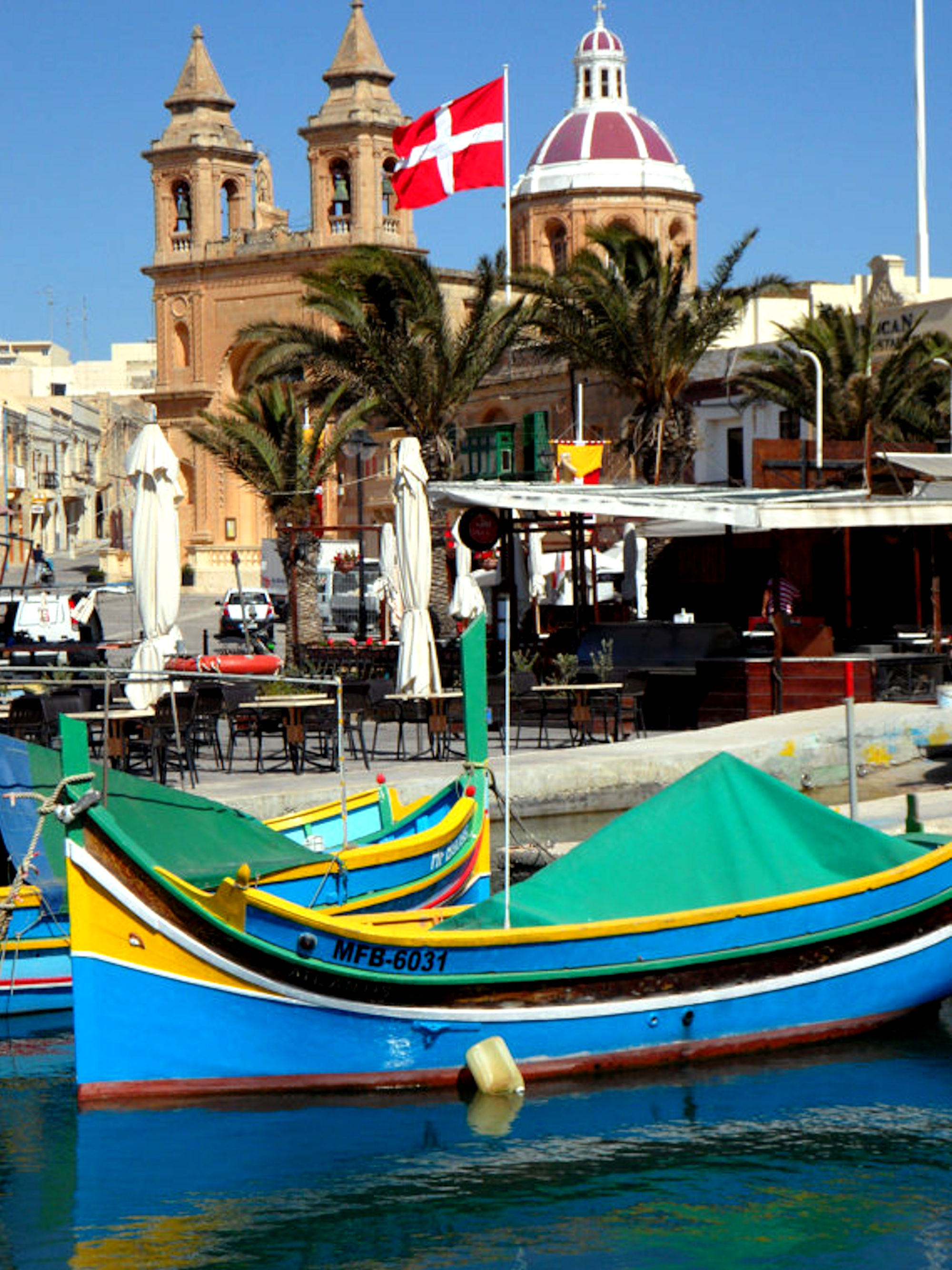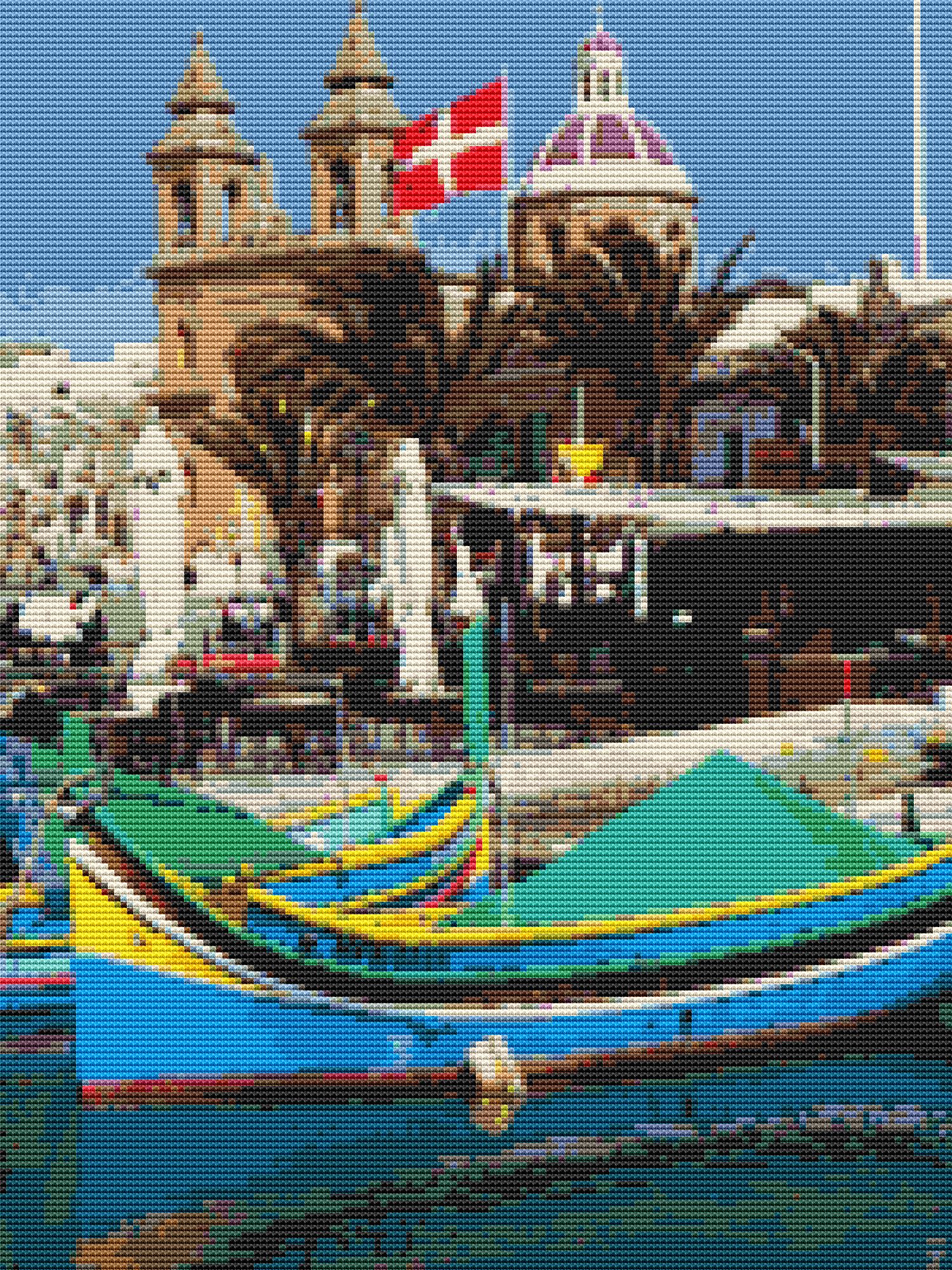 This cross stitch pattern of a colourful fishing port on the island of Malta.
