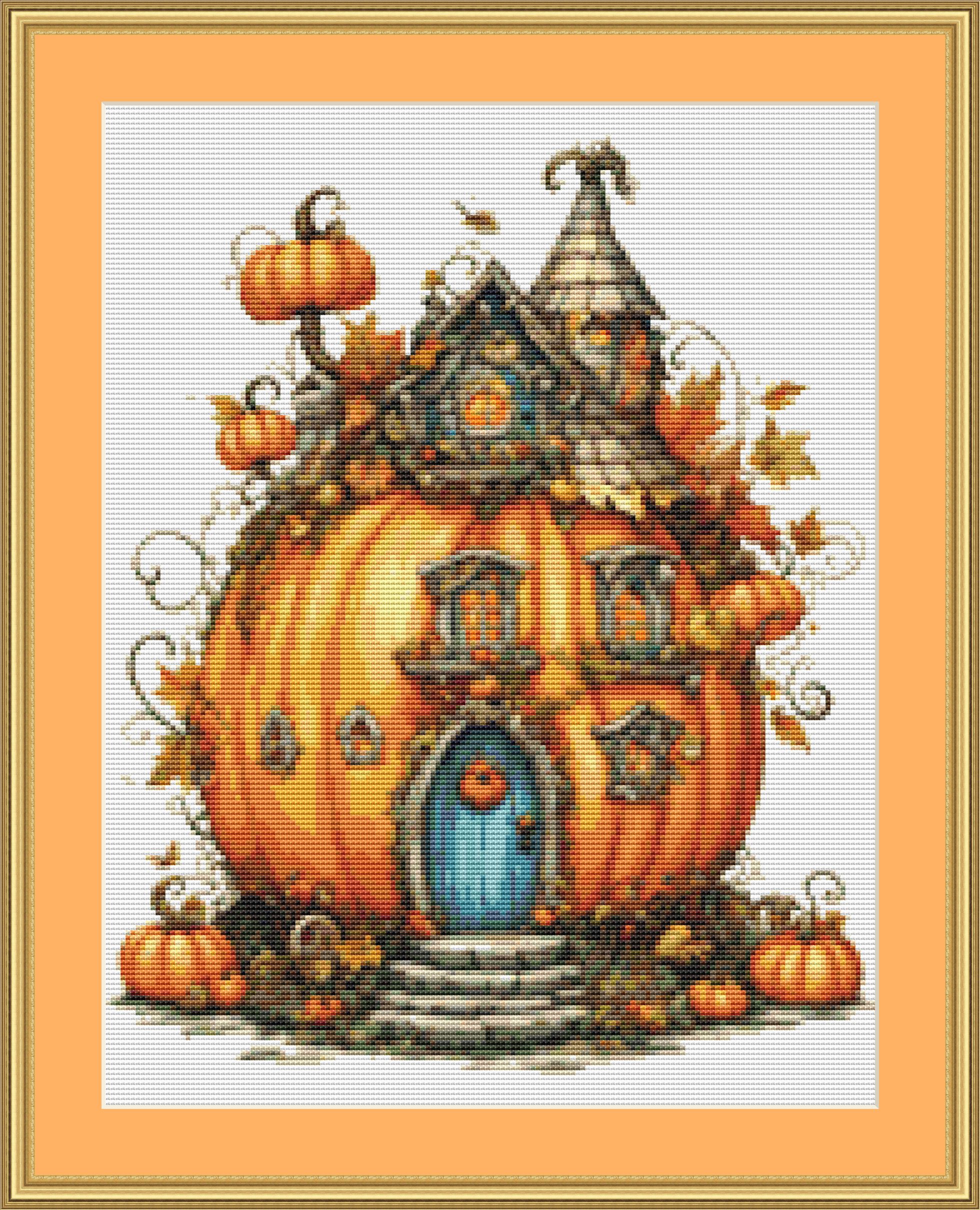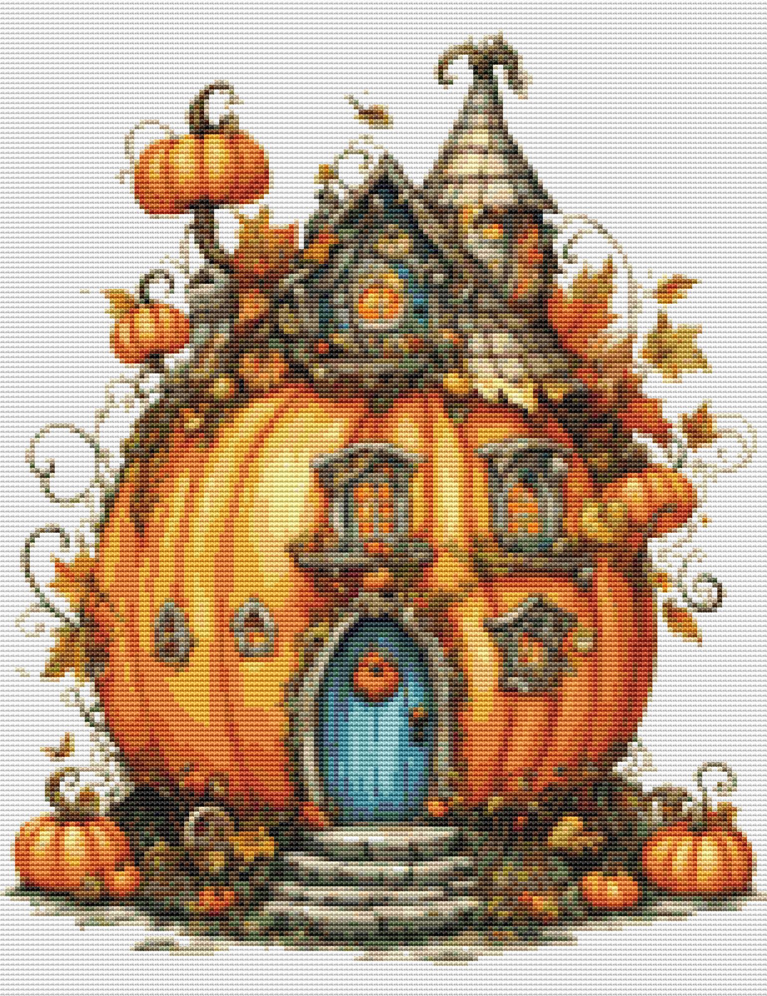 This cross stitch pattern depicts a picture of a house made out of a pumpkin.