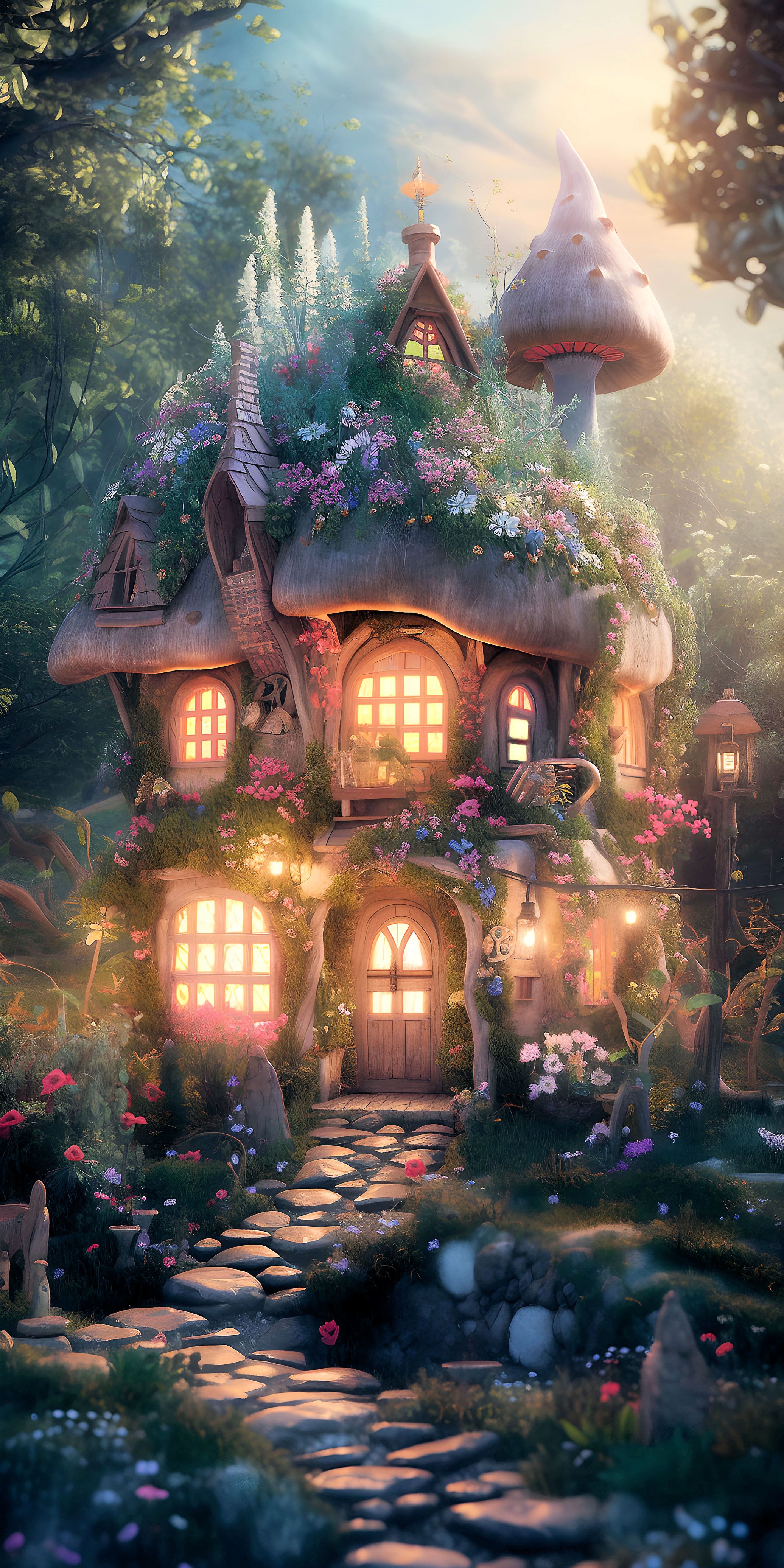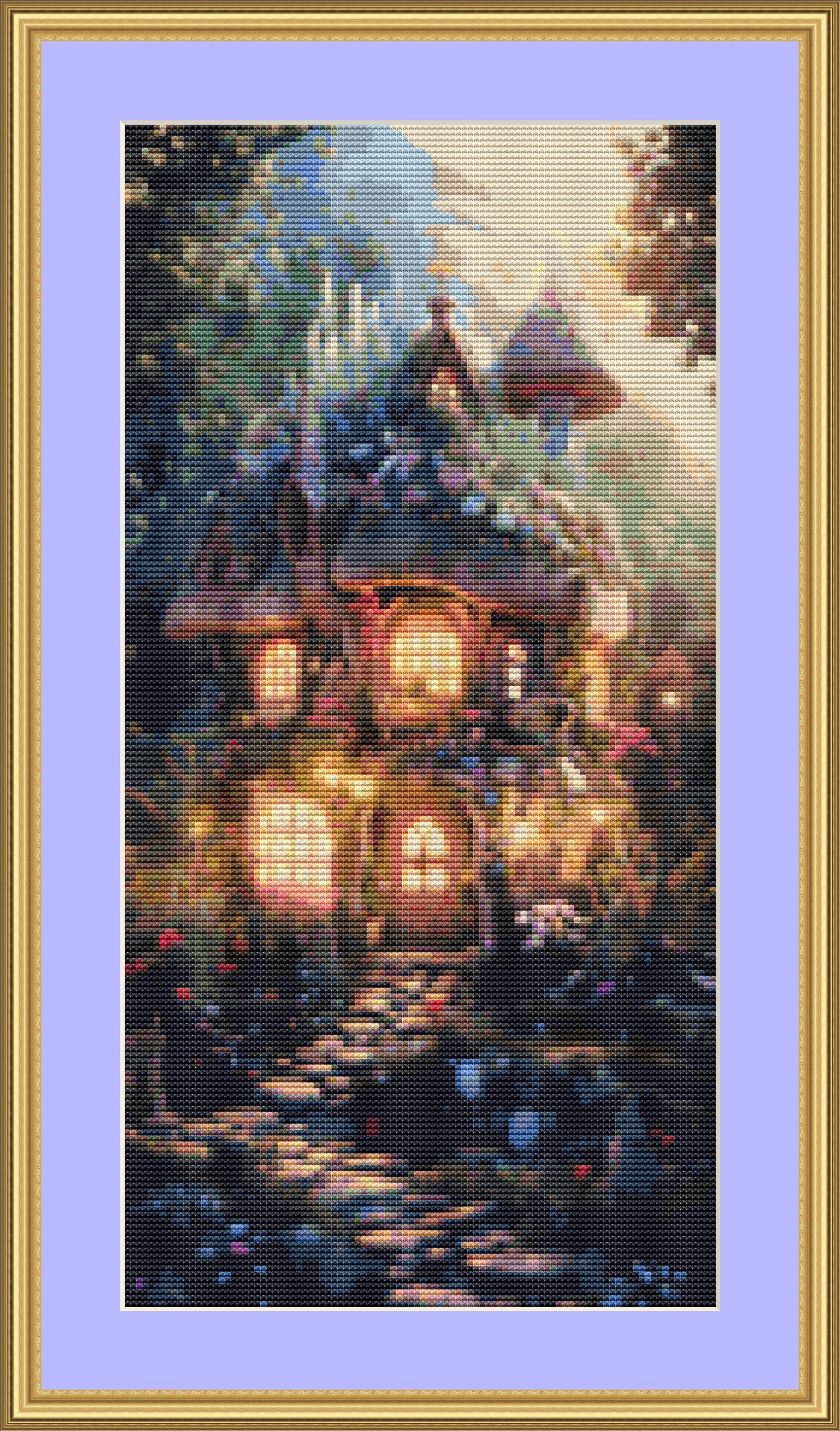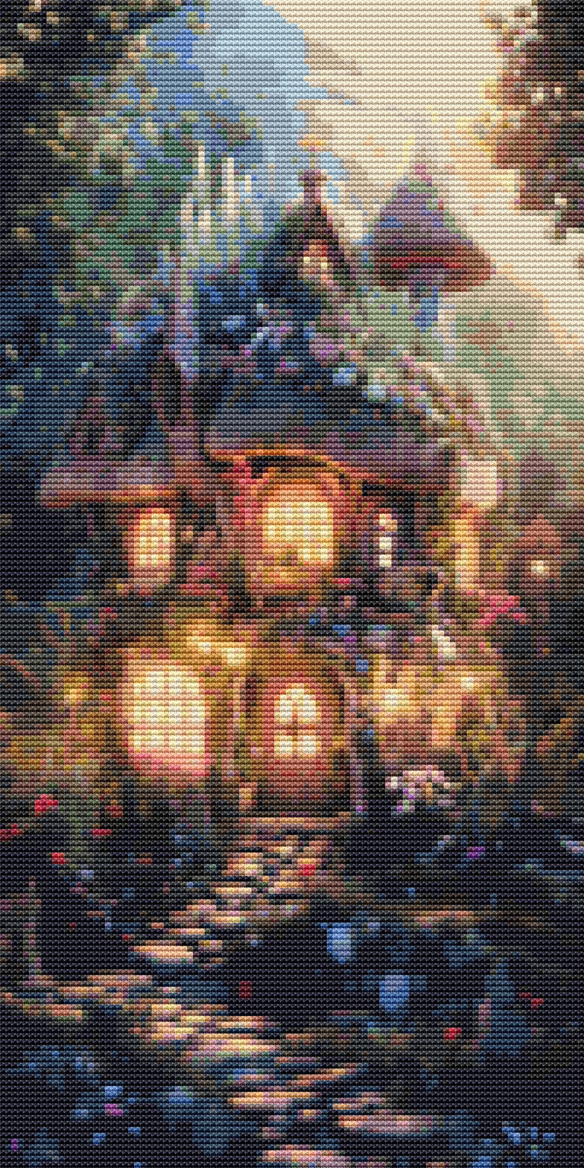 This cross stitch pattern depicts a picture of a fantasy house lit up.