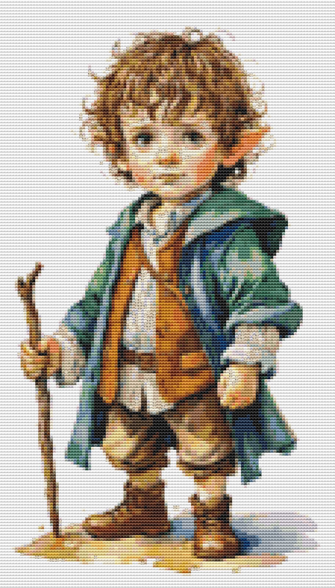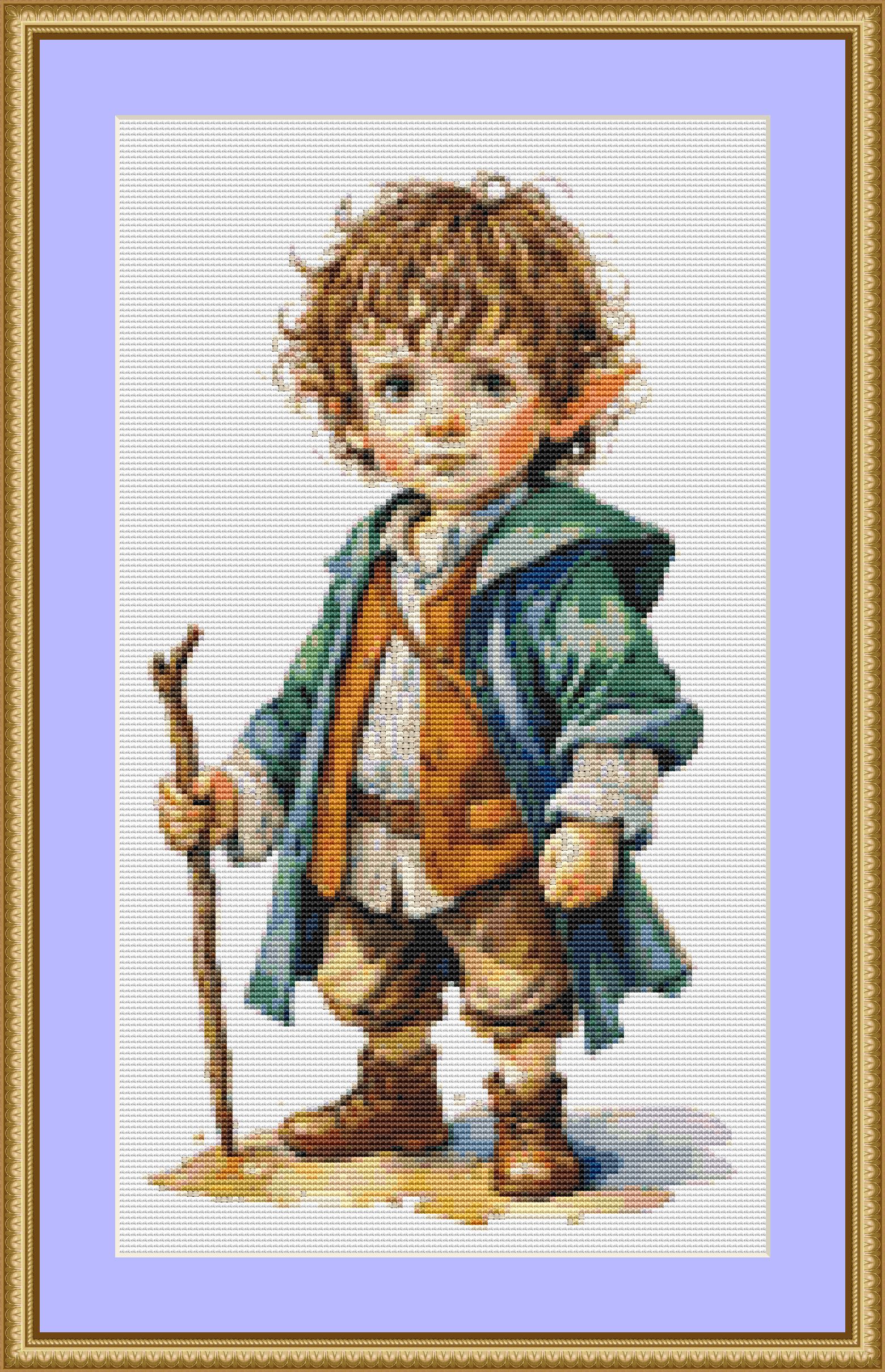 This cross stitch pattern depicts a picture of an elf boy in a coat with a staff.
