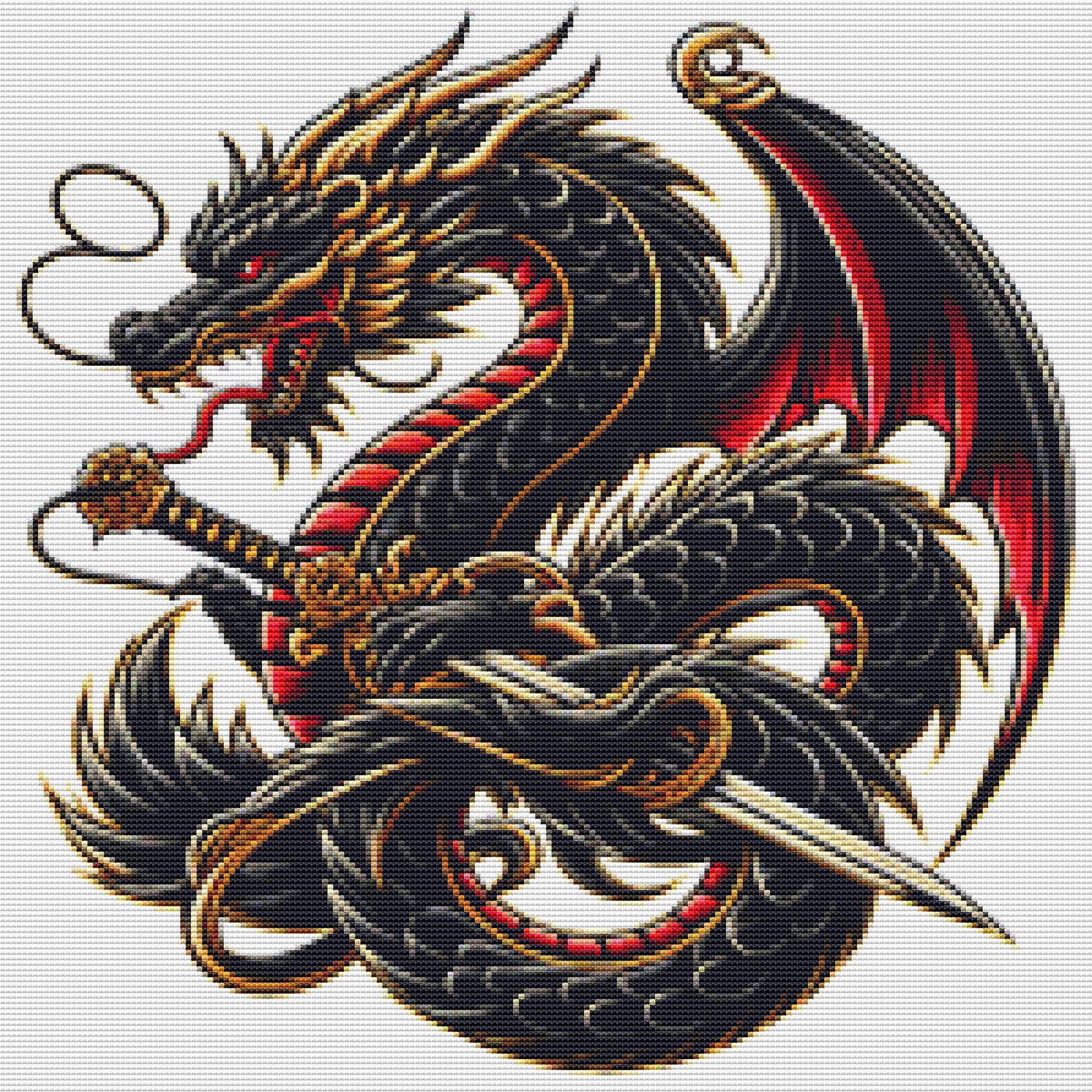This cross stitch pattern depicts a picture of a dragon holding a sword.