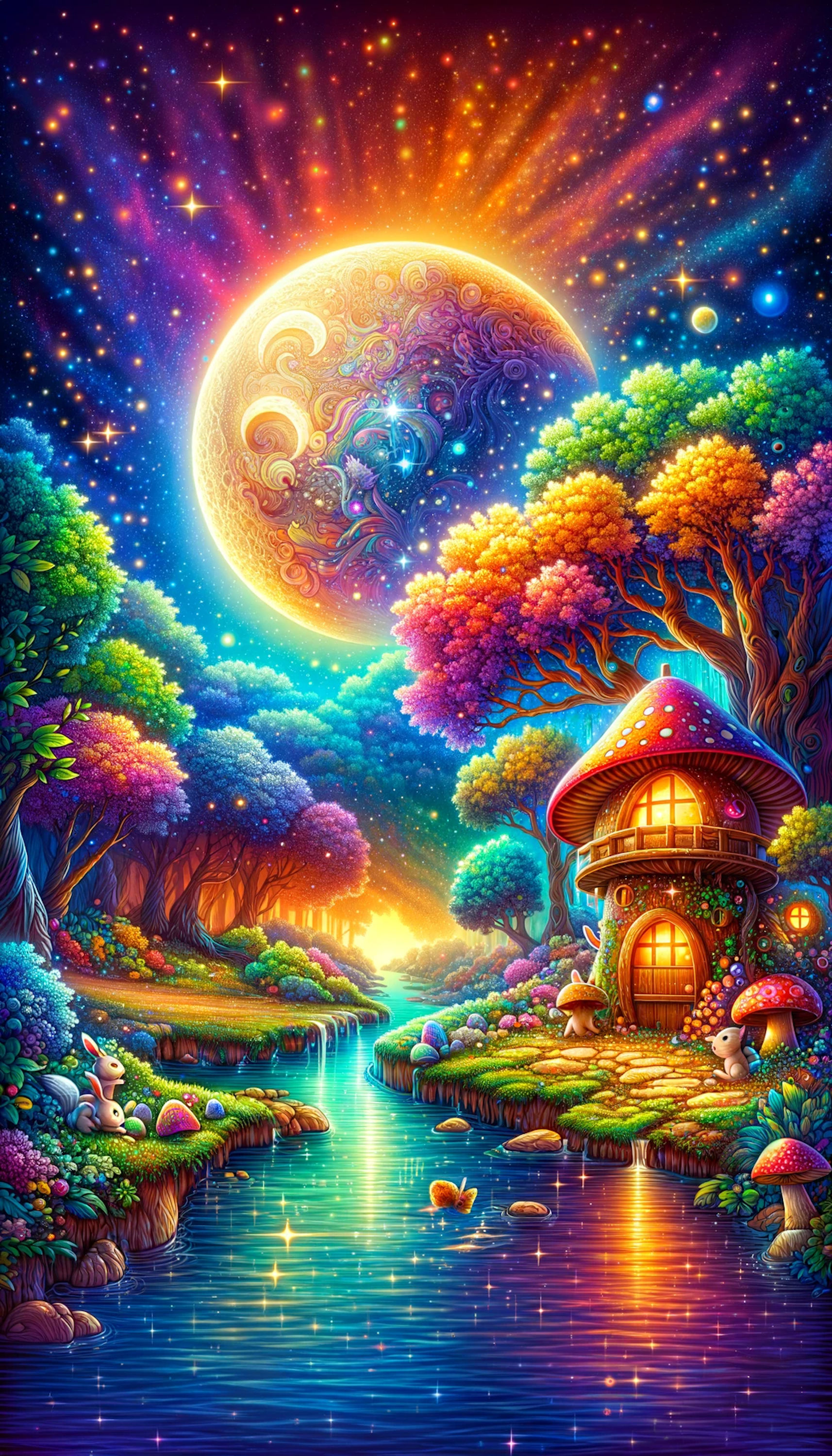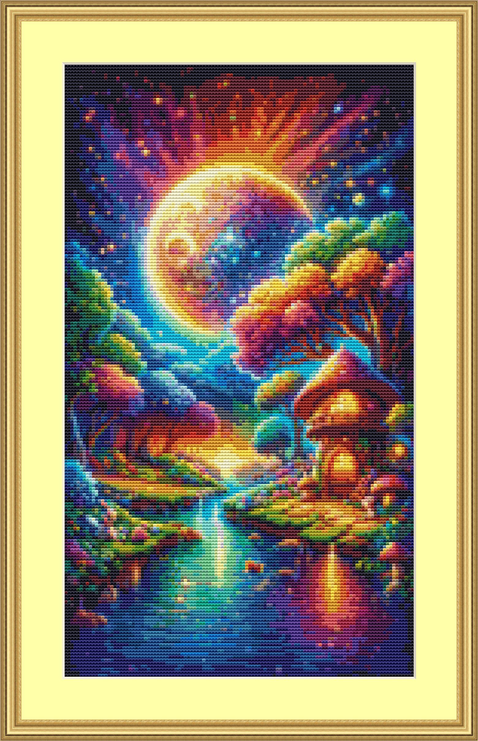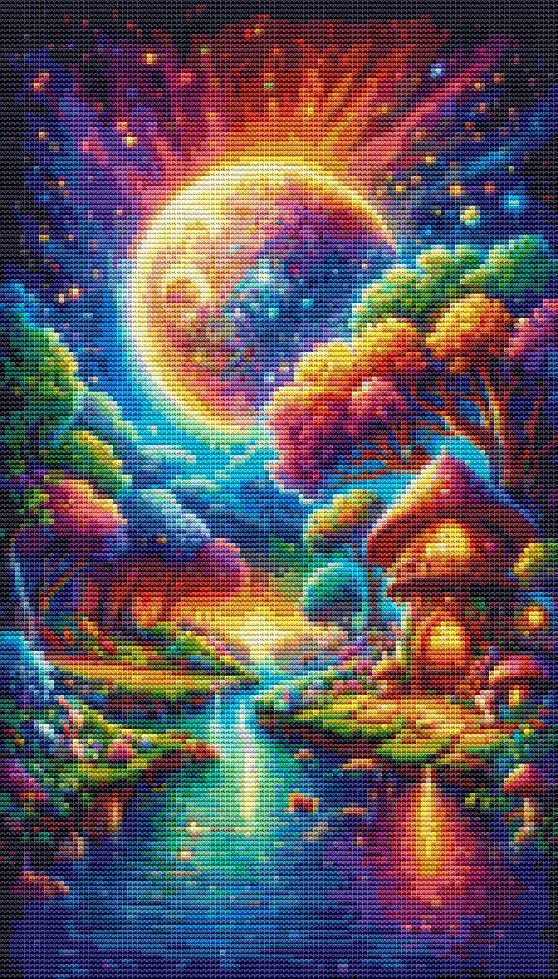 This cross stitch pattern depicts a picture of a bright colourful image of a fantasy world.