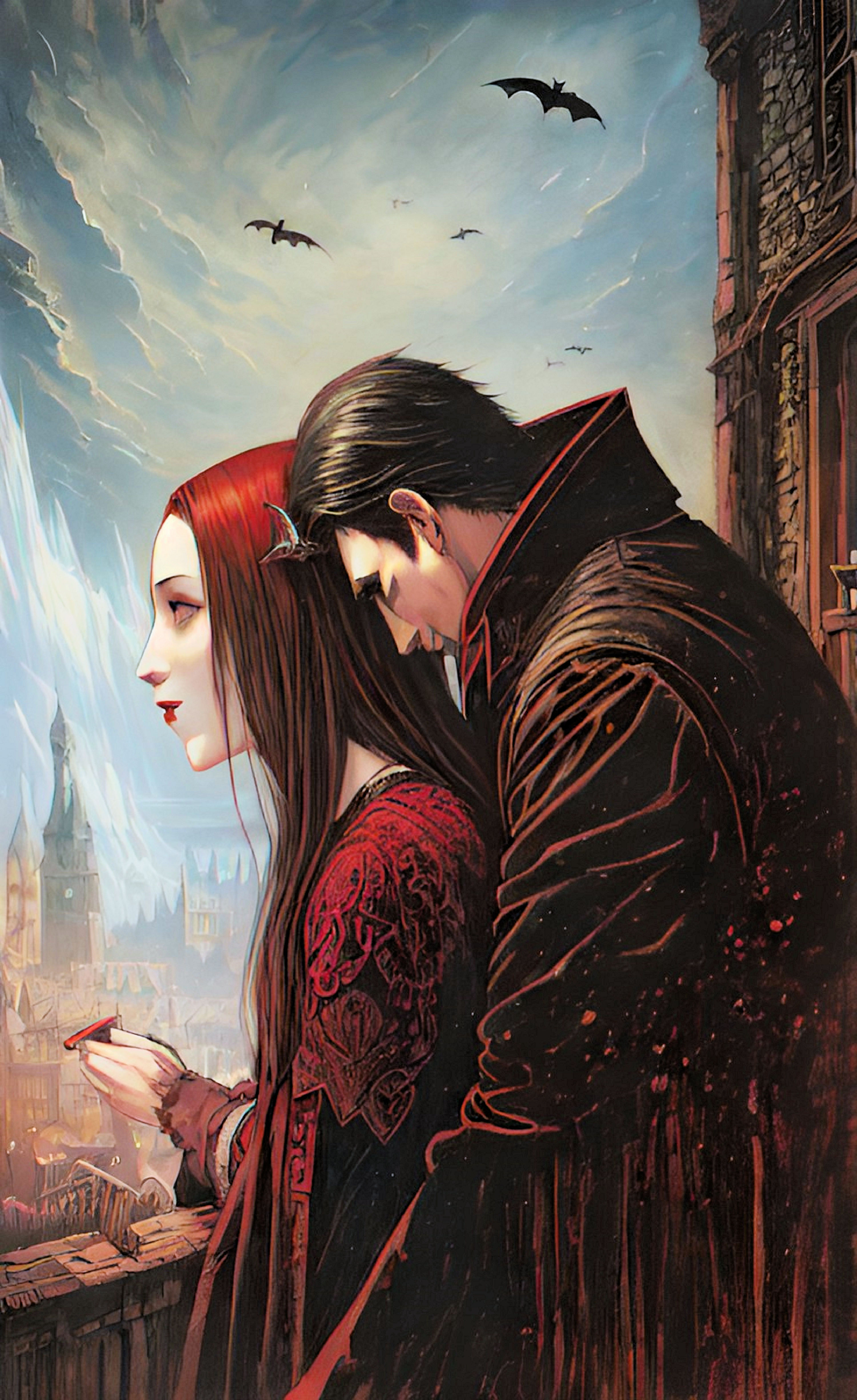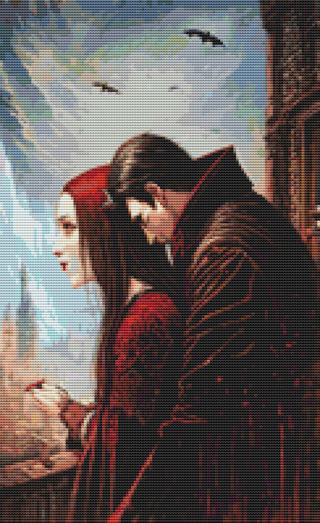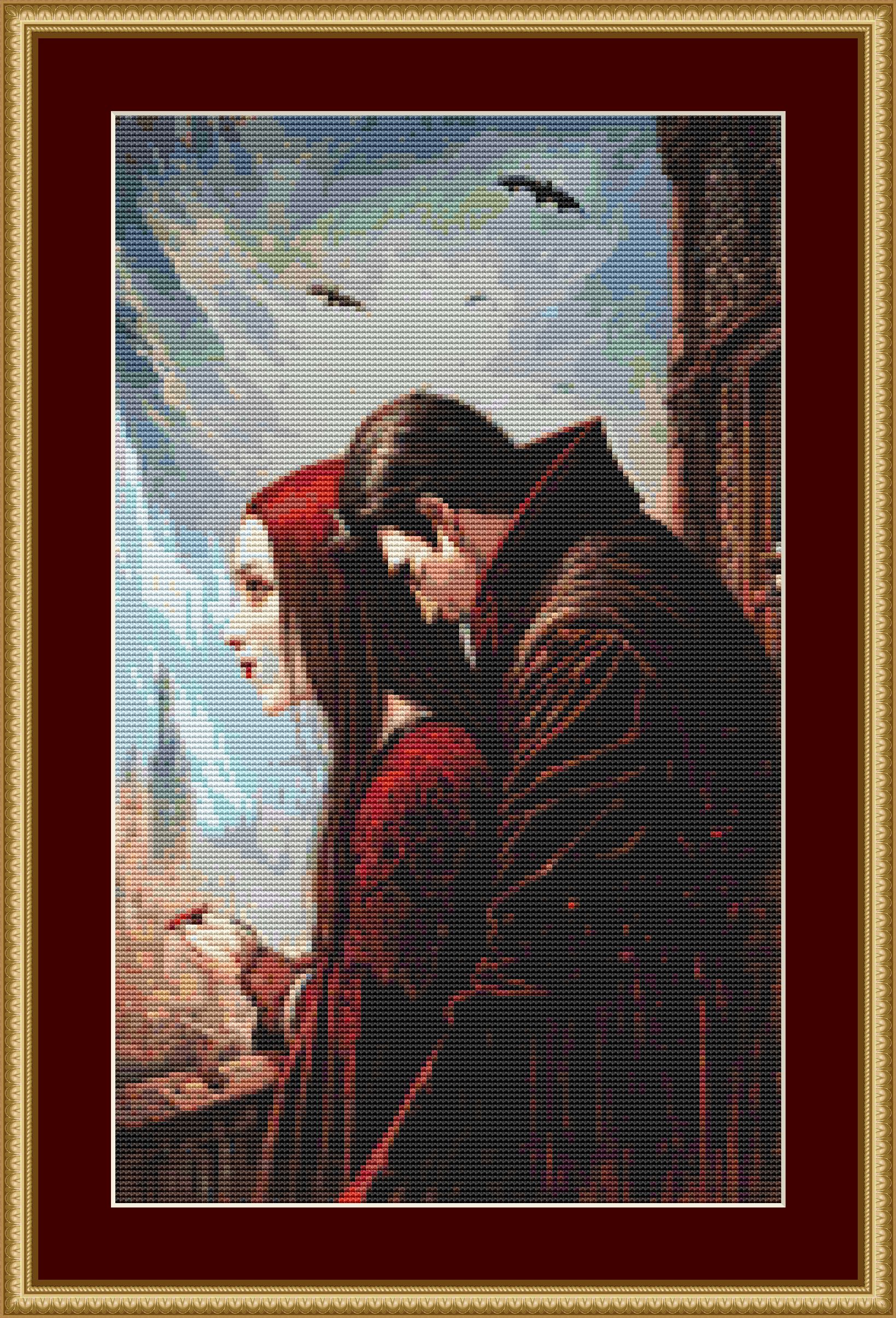 This cross stitch pattern depicts a picture of a couple of vampires.