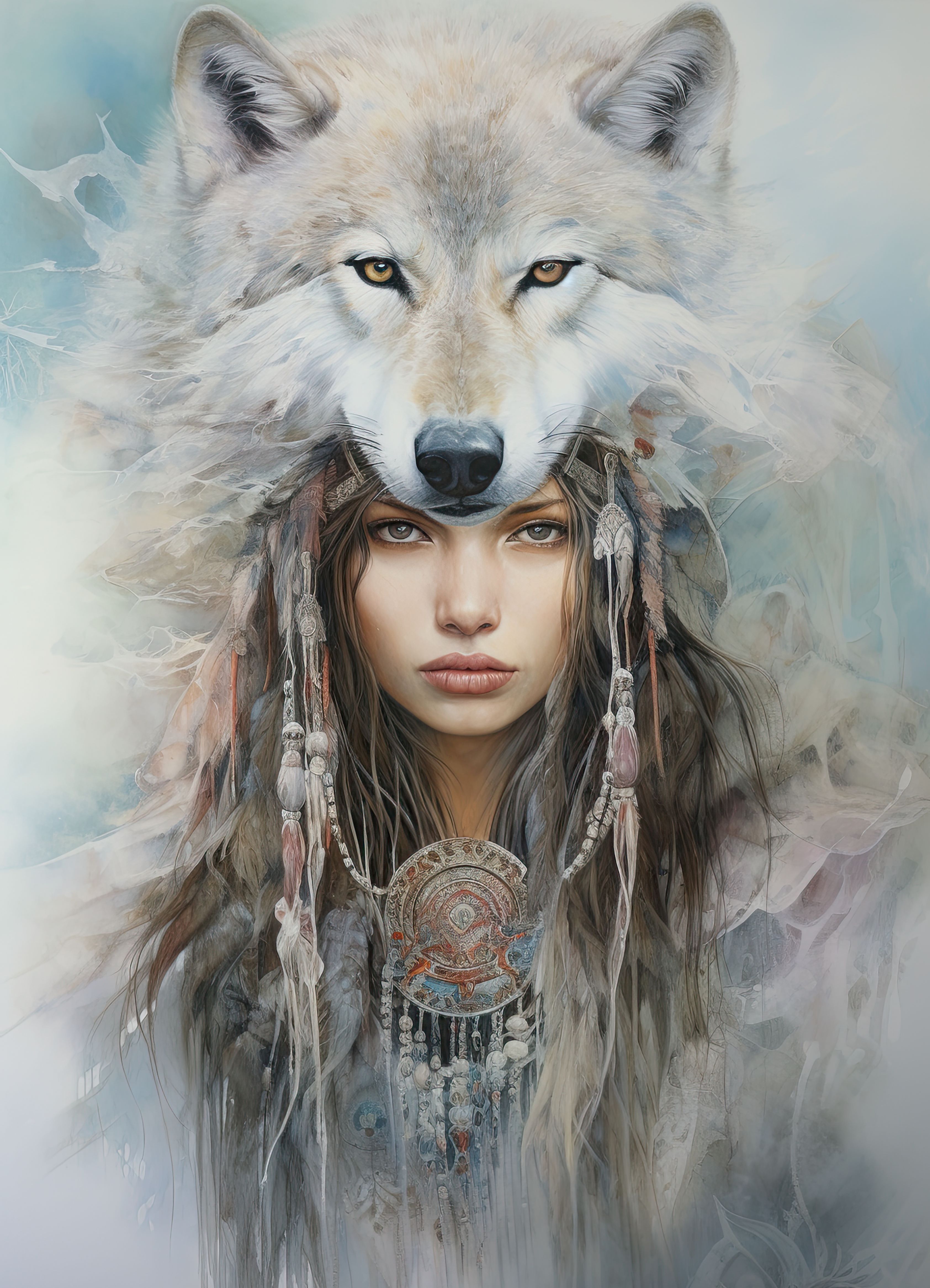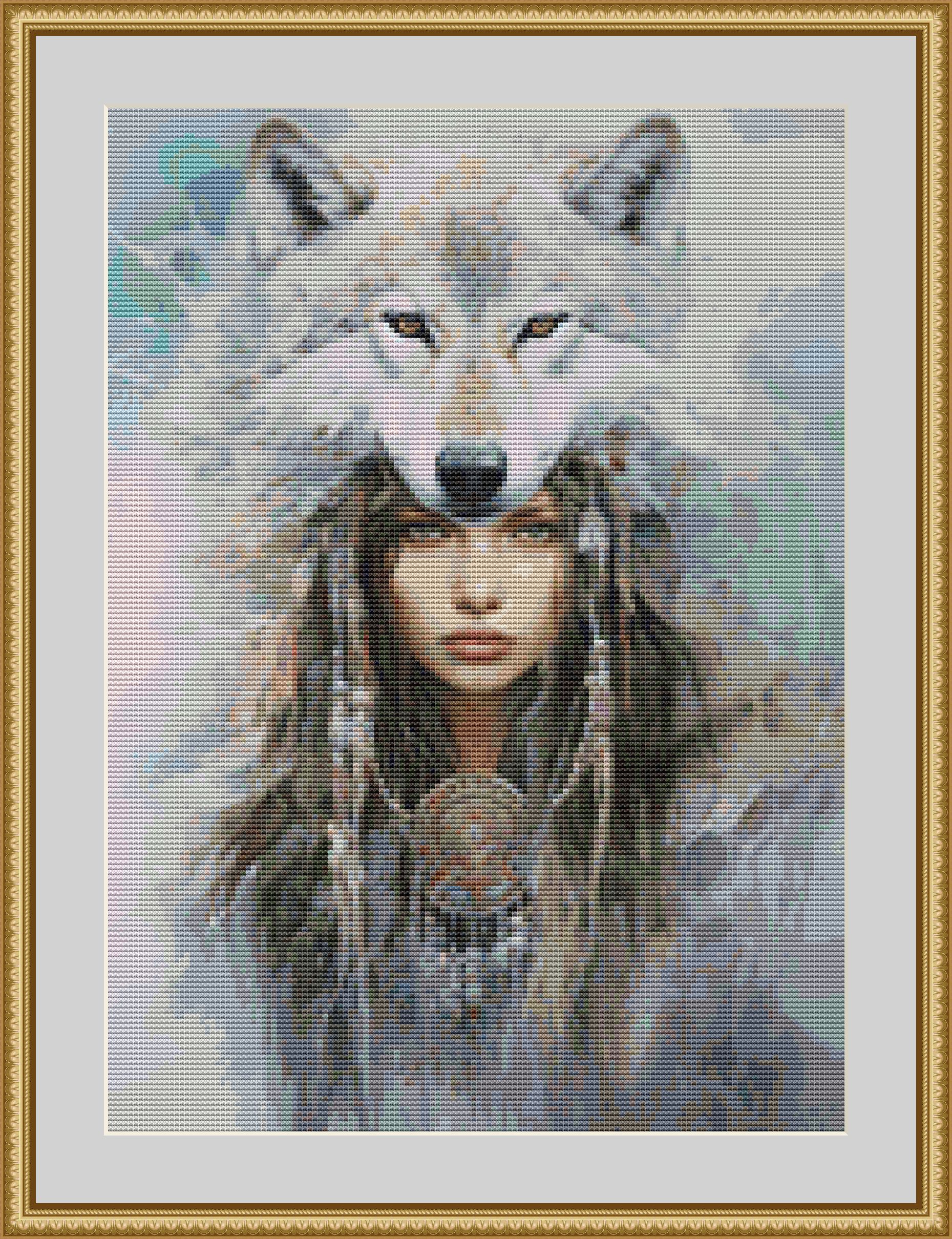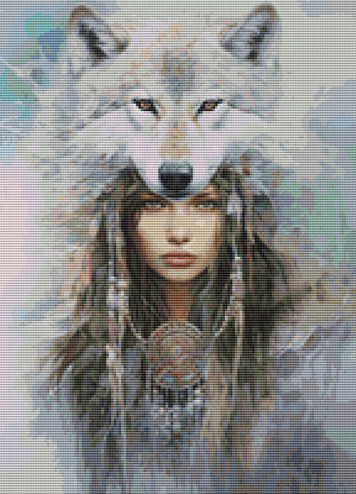 This cross stitch pattern depicts a picture of a girl with a wolf.