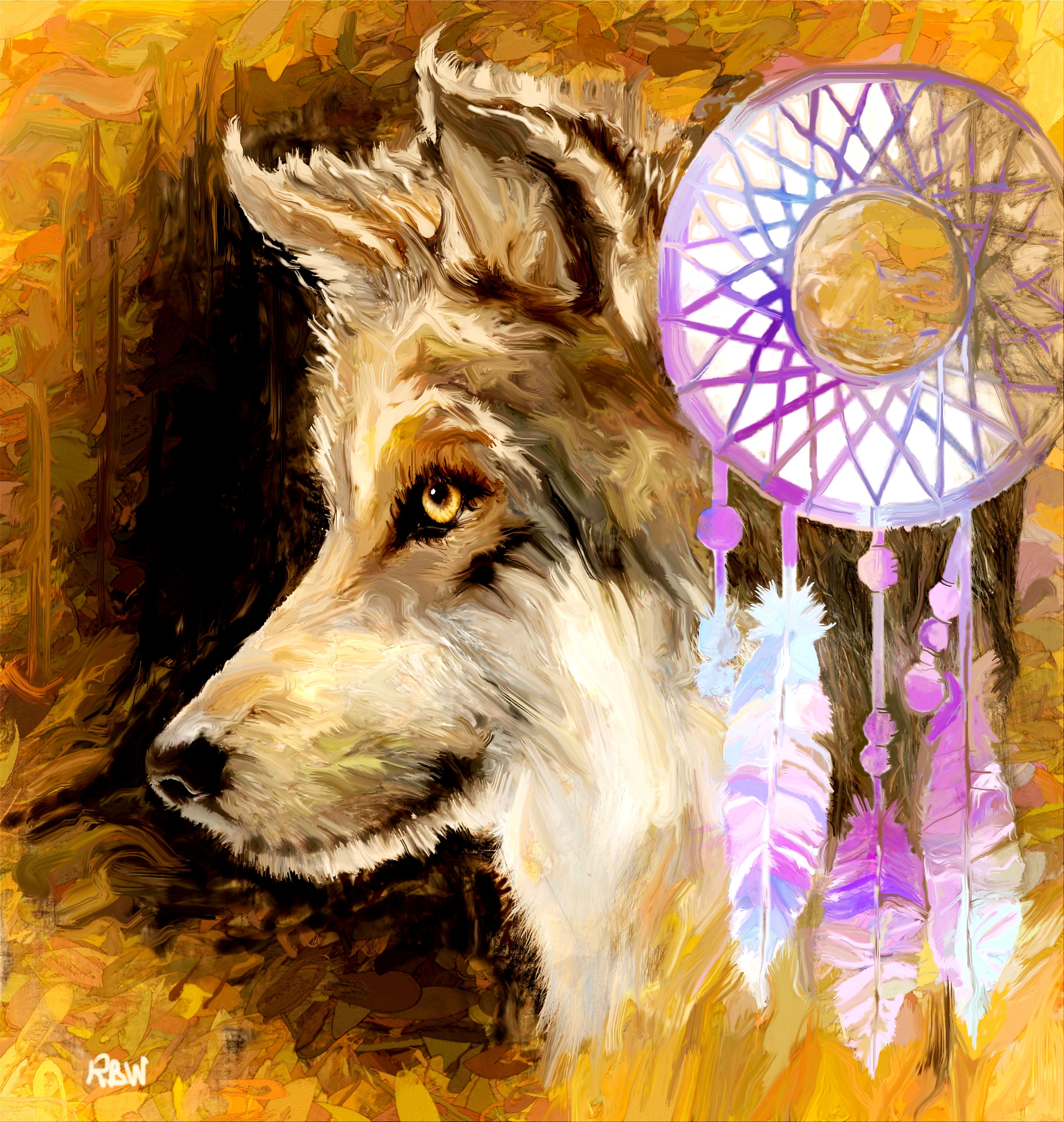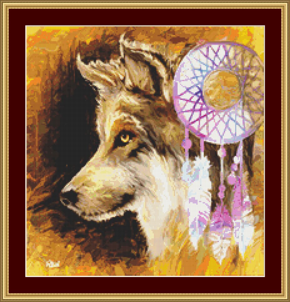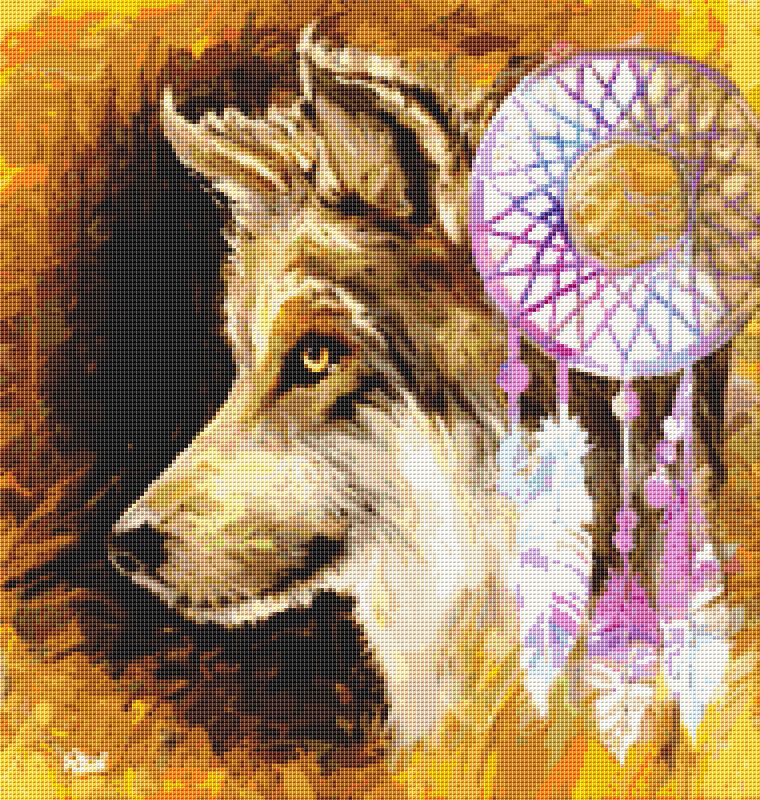 This cross stitch pattern of a beautiful picture of a wolf next to a dream catcher.