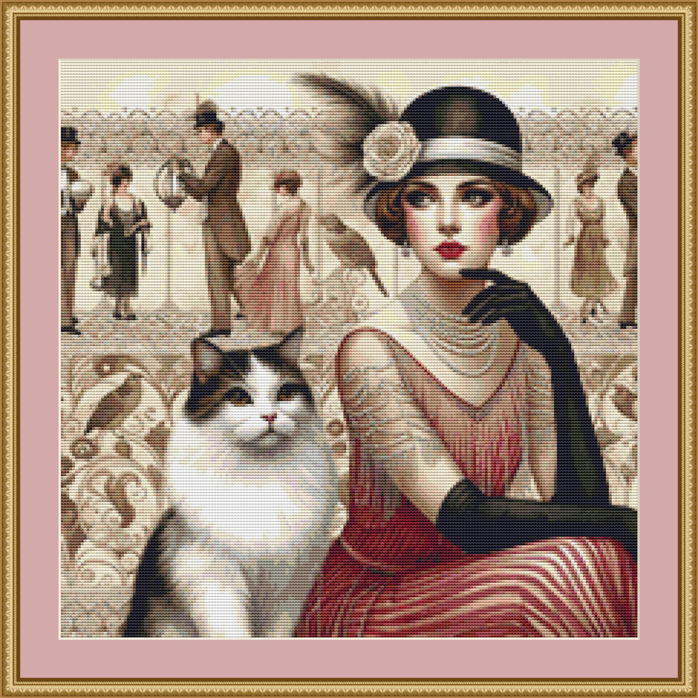 This cross stitch pattern depicts a picture of a 1920s woman sat with a cat.