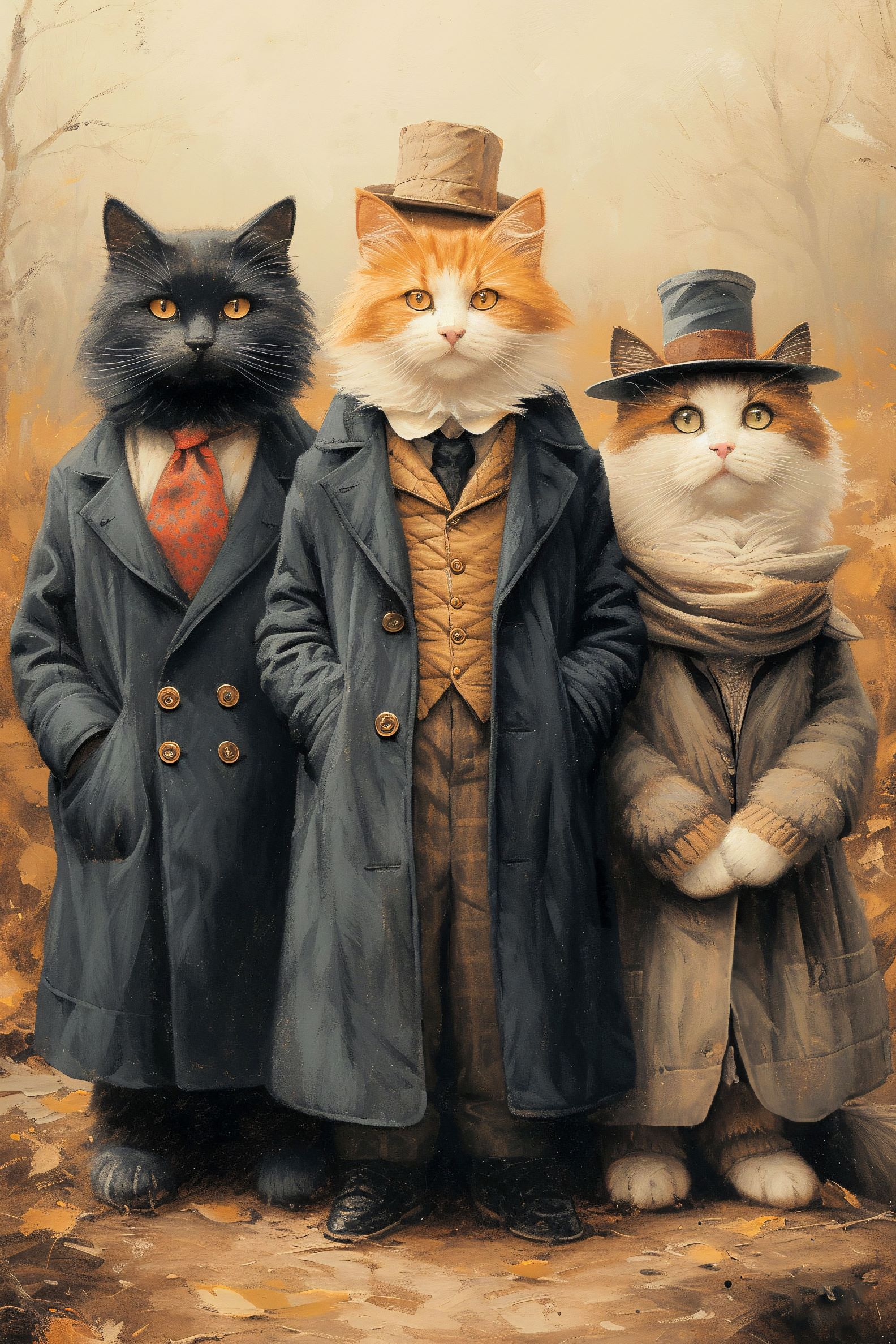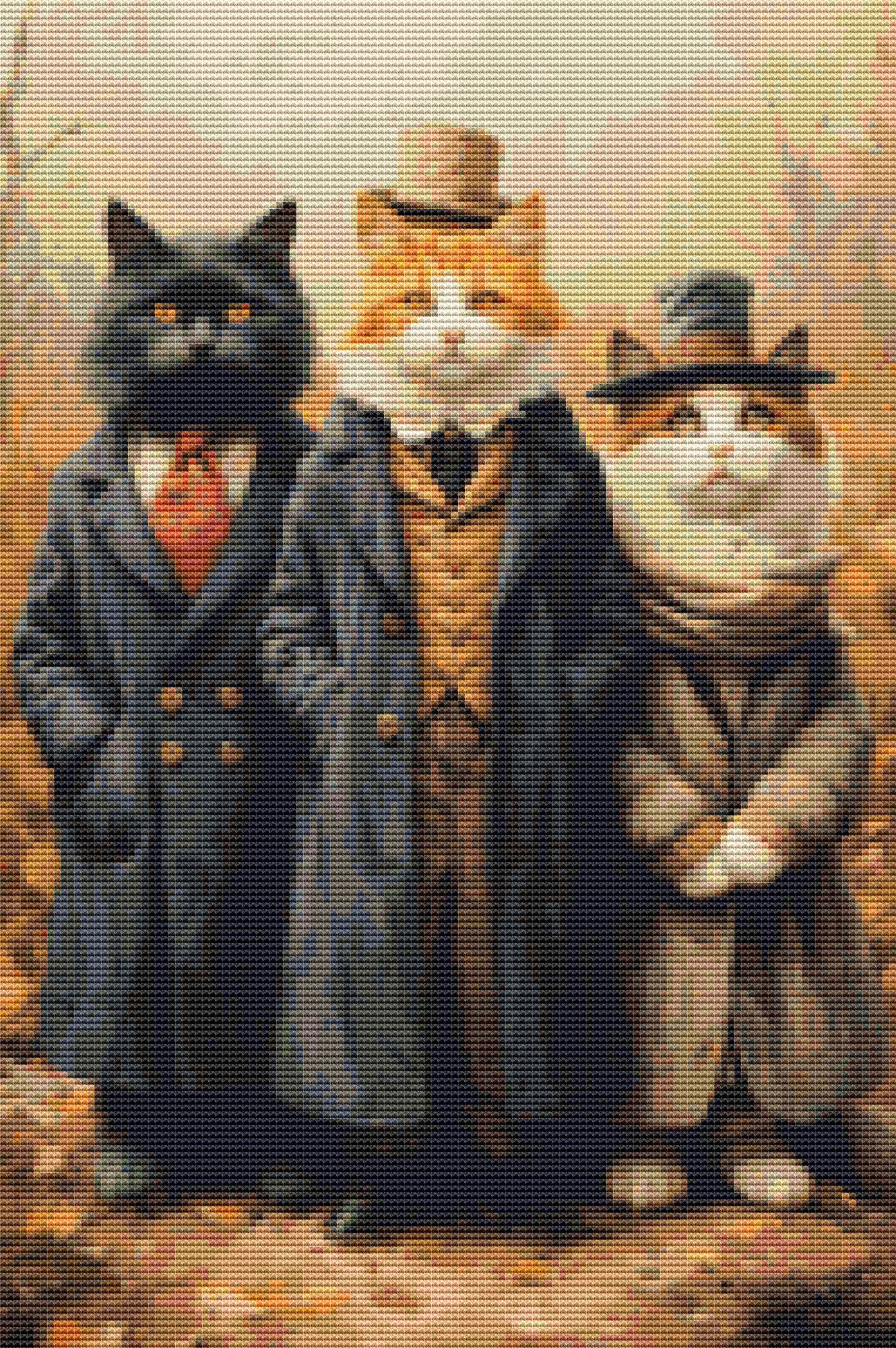 This cross stitch pattern depicts a picture of three cats dressed in Victorian costumes.