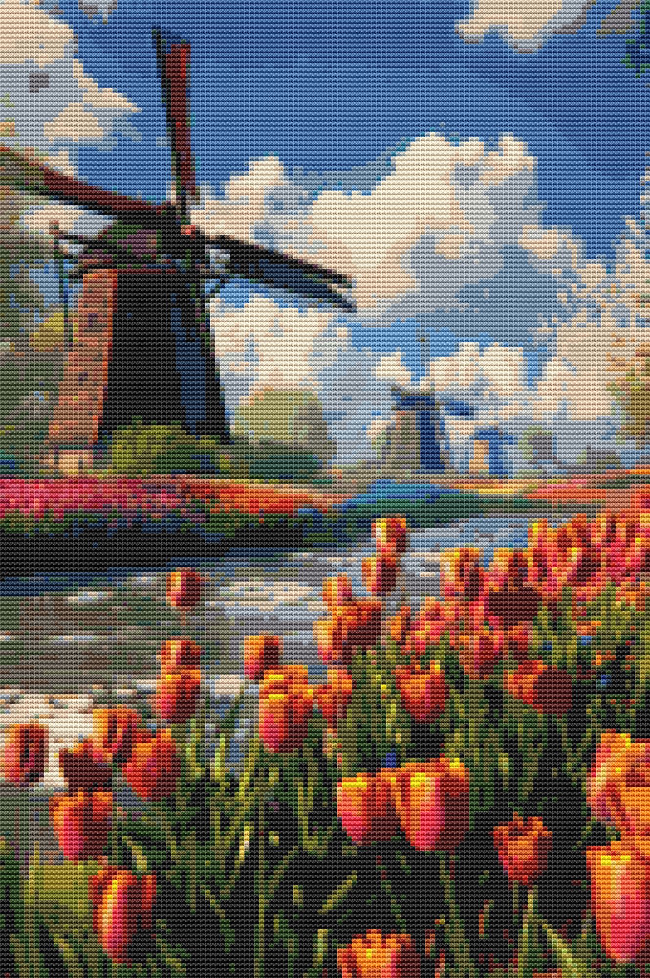 This cross stitch pattern depicts a picture of a field of tulips with windmills on the opposite bank of a canal.