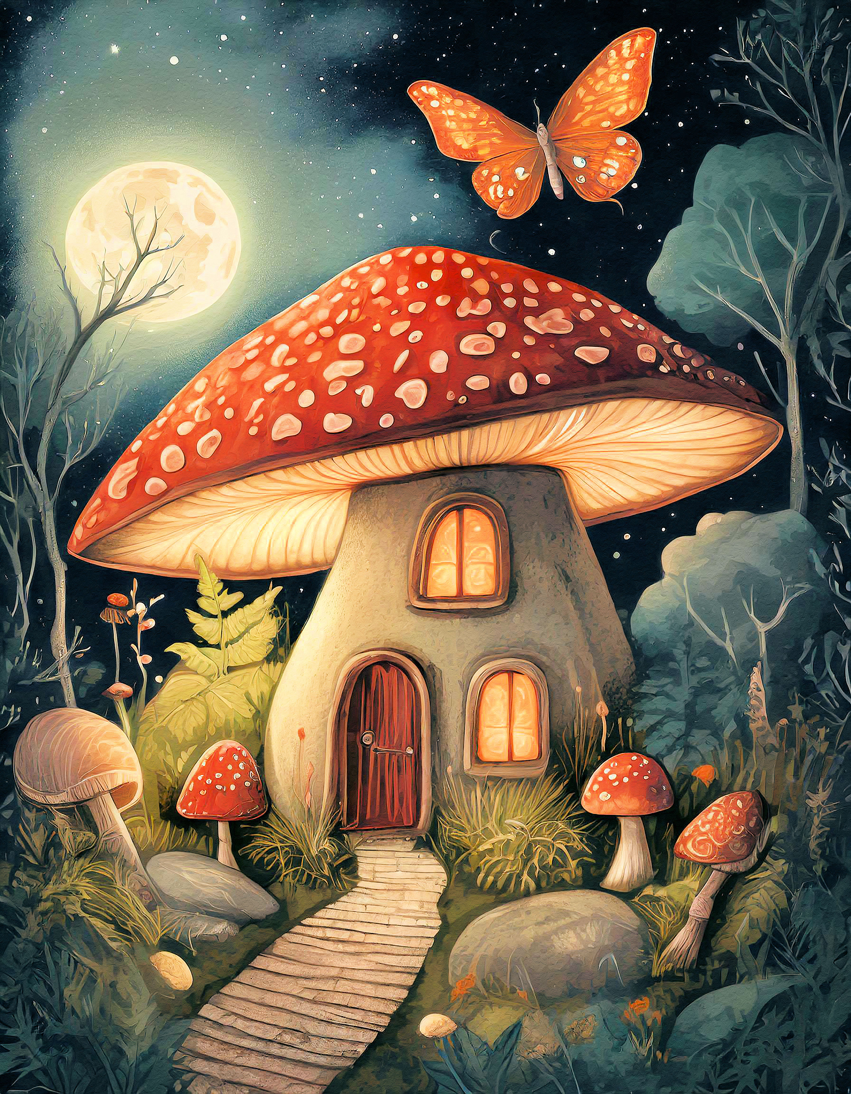 This cross stitch pattern depicts a picture of a beautiful little toadstool house in a forest.