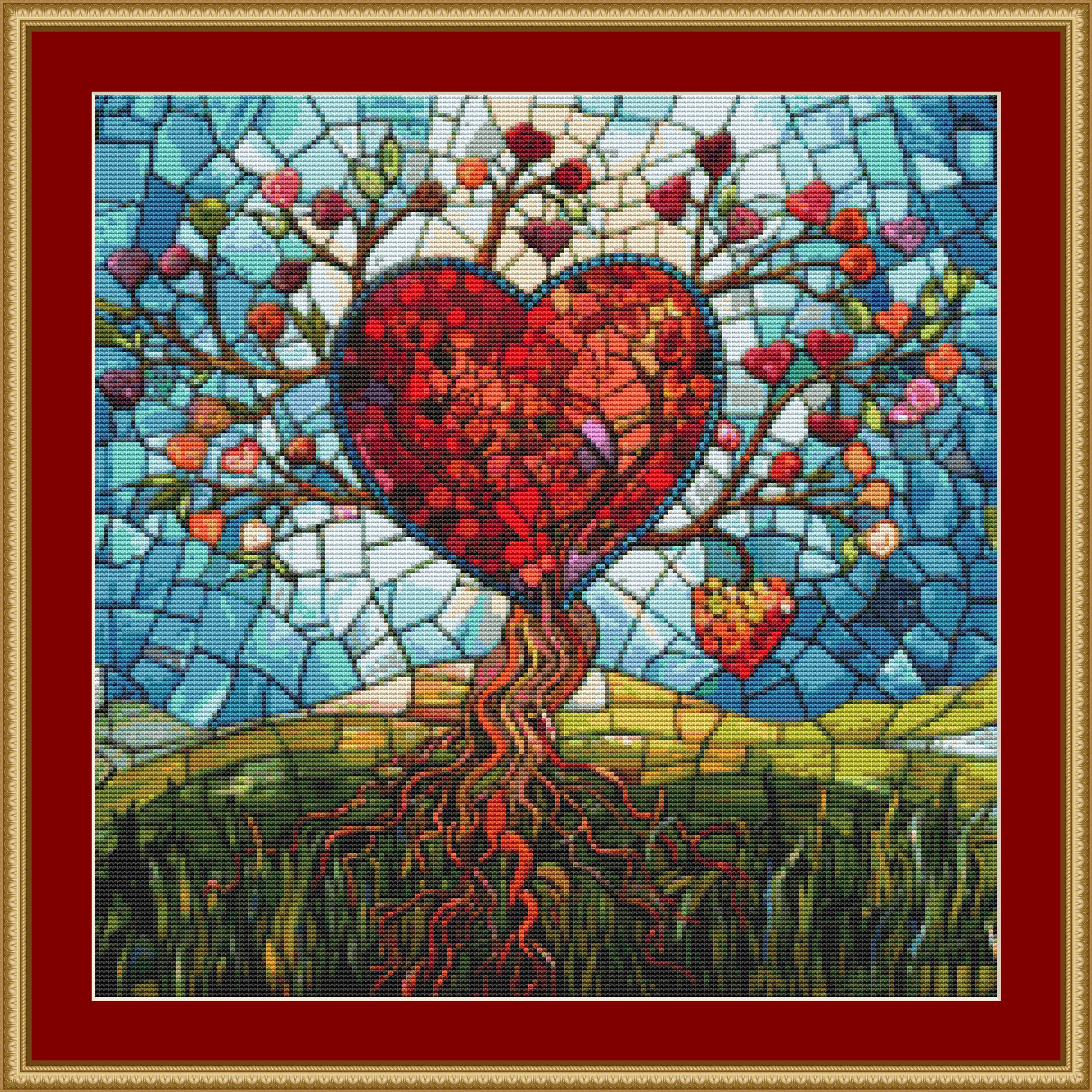 This cross stitch pattern depicts a stunning stained glass window of a red heartgrowing like a tree.