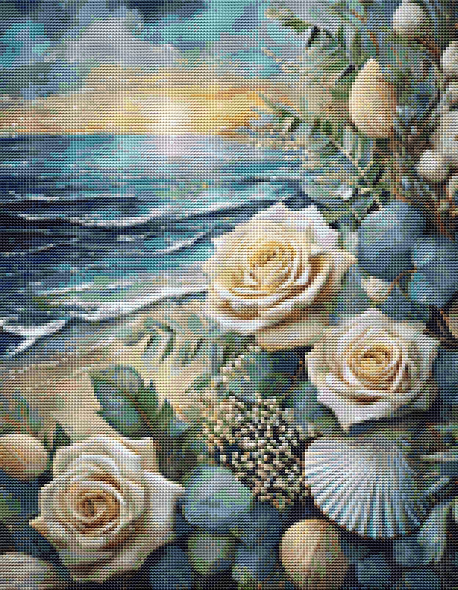 This cross stitch pattern depicts a picture of some shells and pretty roses on the beach.