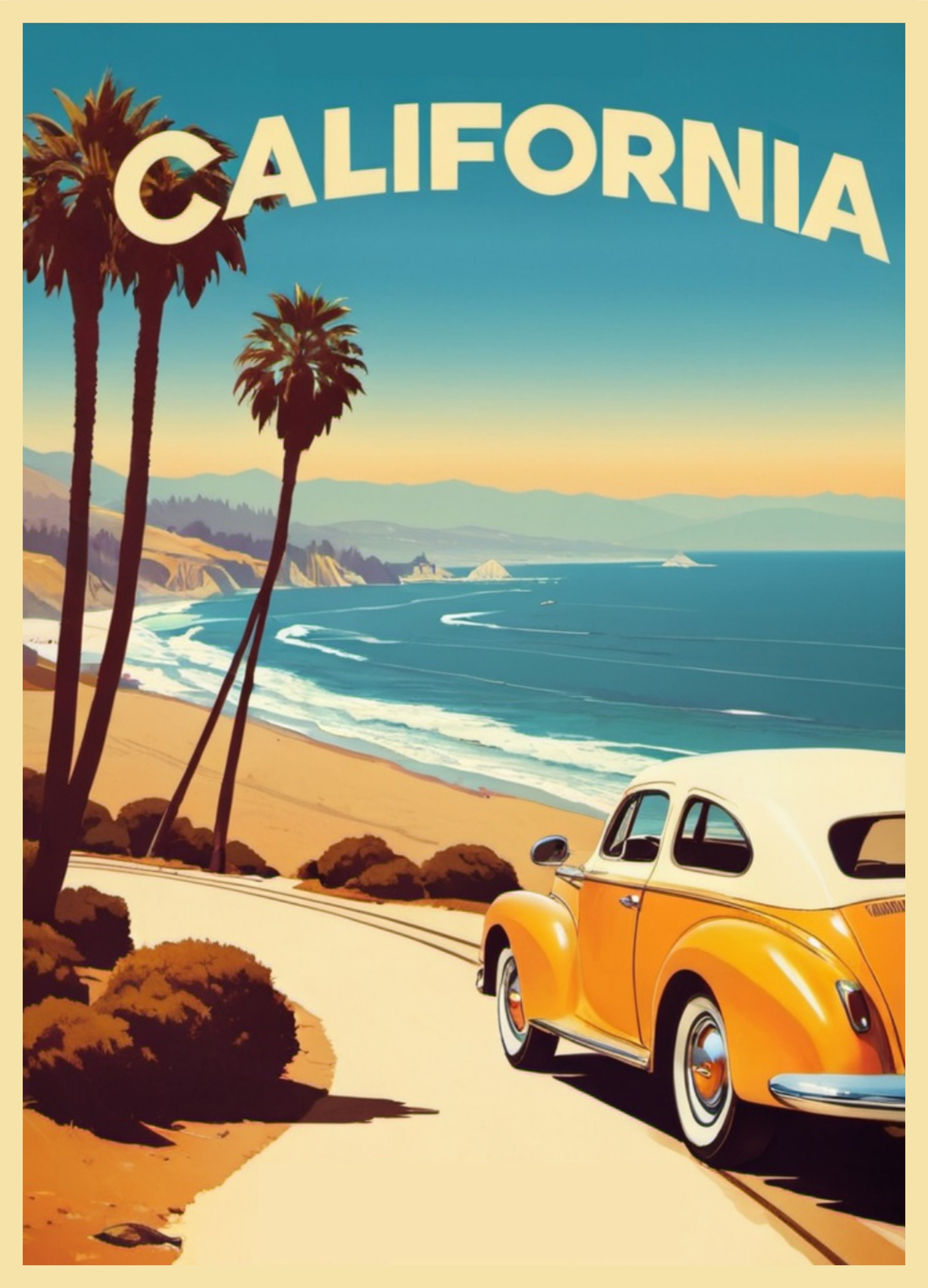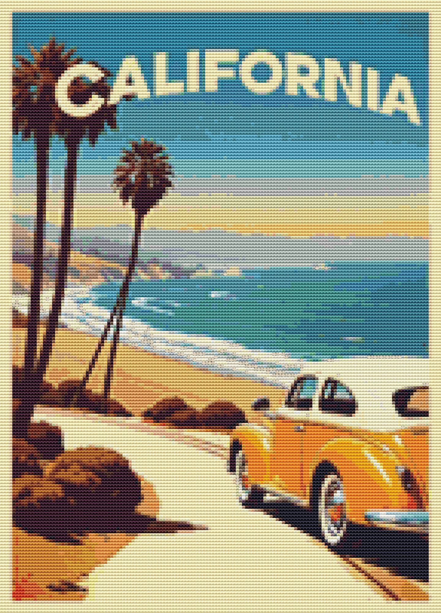 This cross stitch pattern depicts a picture of a vintage poster advertising California.