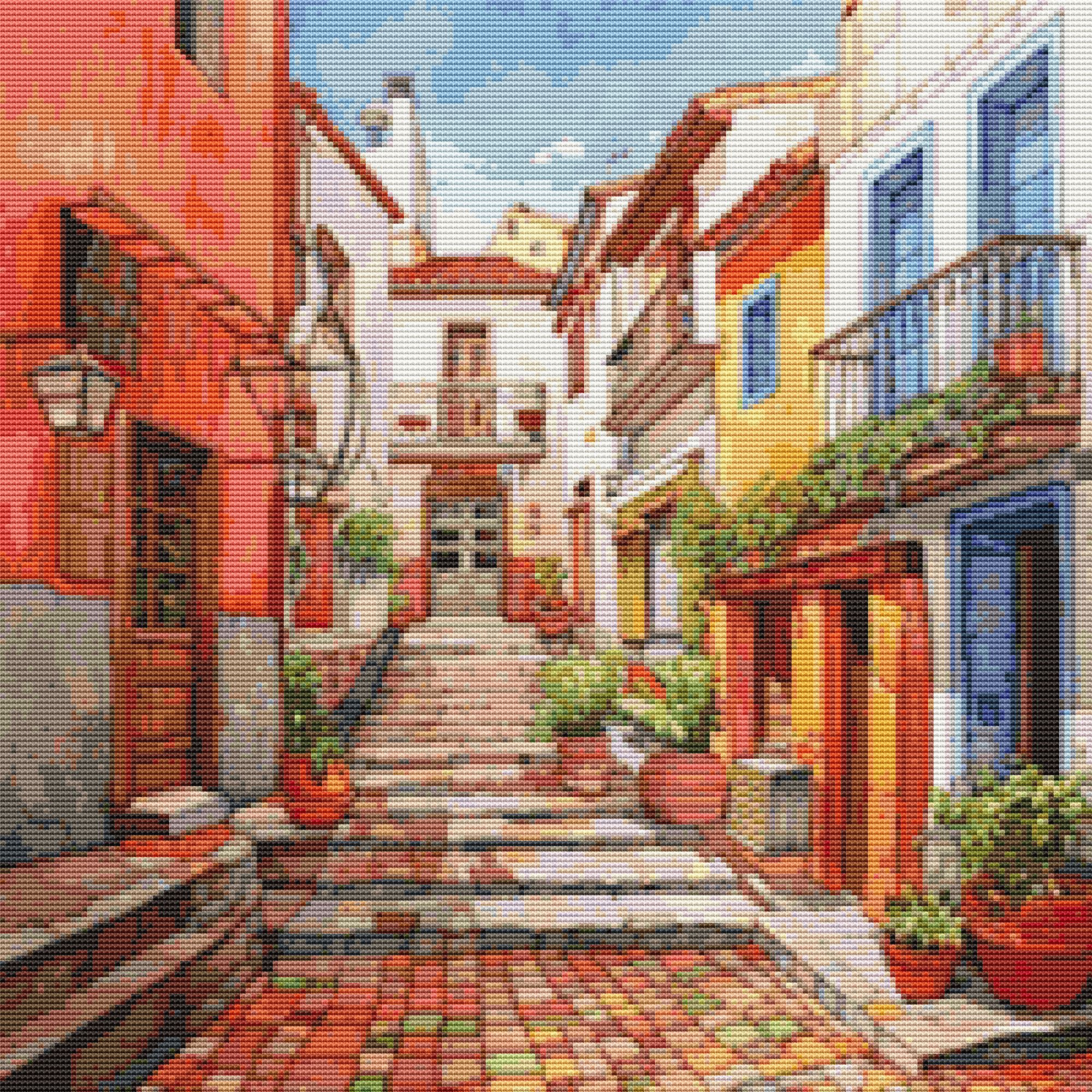 This cross stitch pattern depicts a picture of a street of colourful houses.