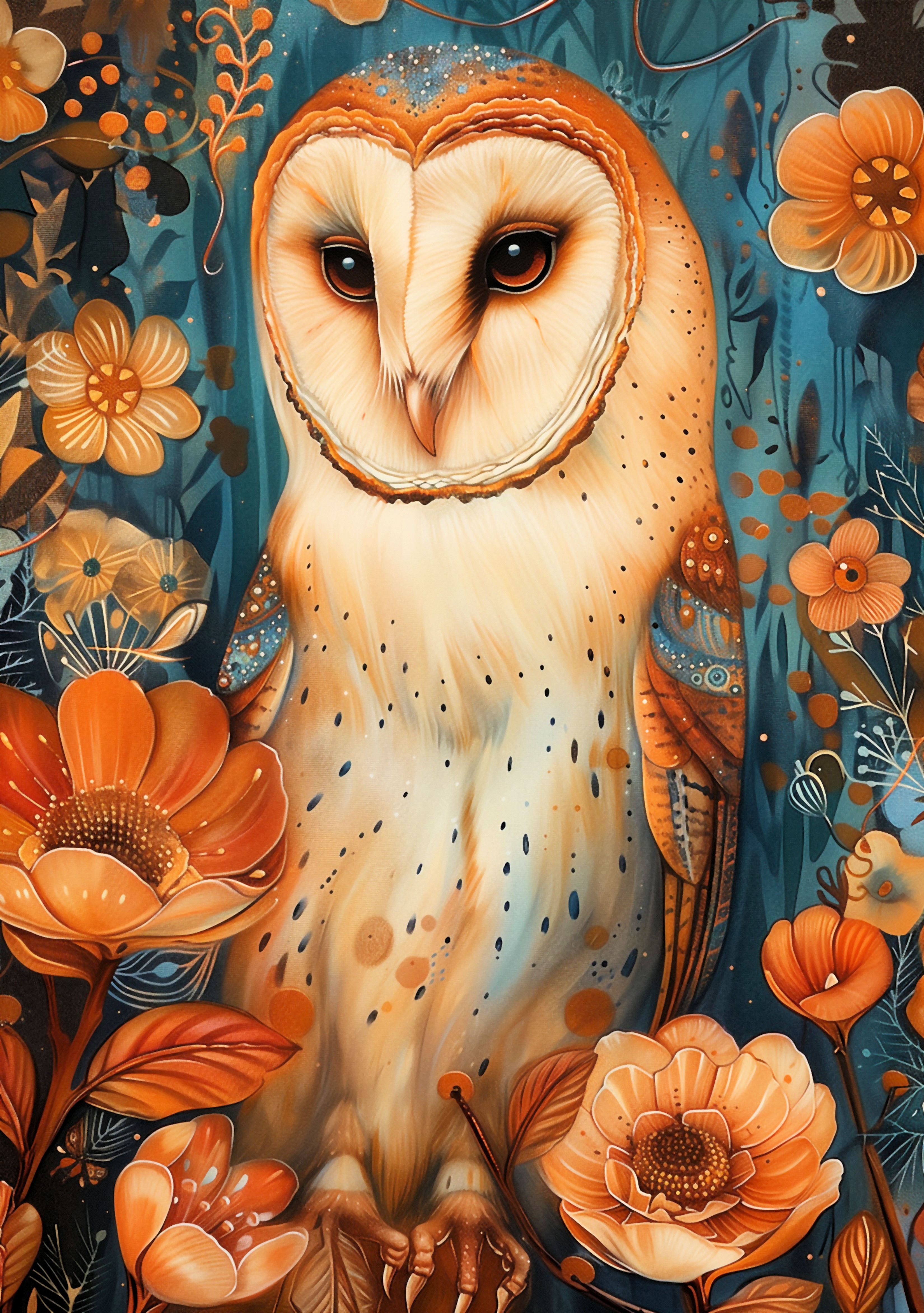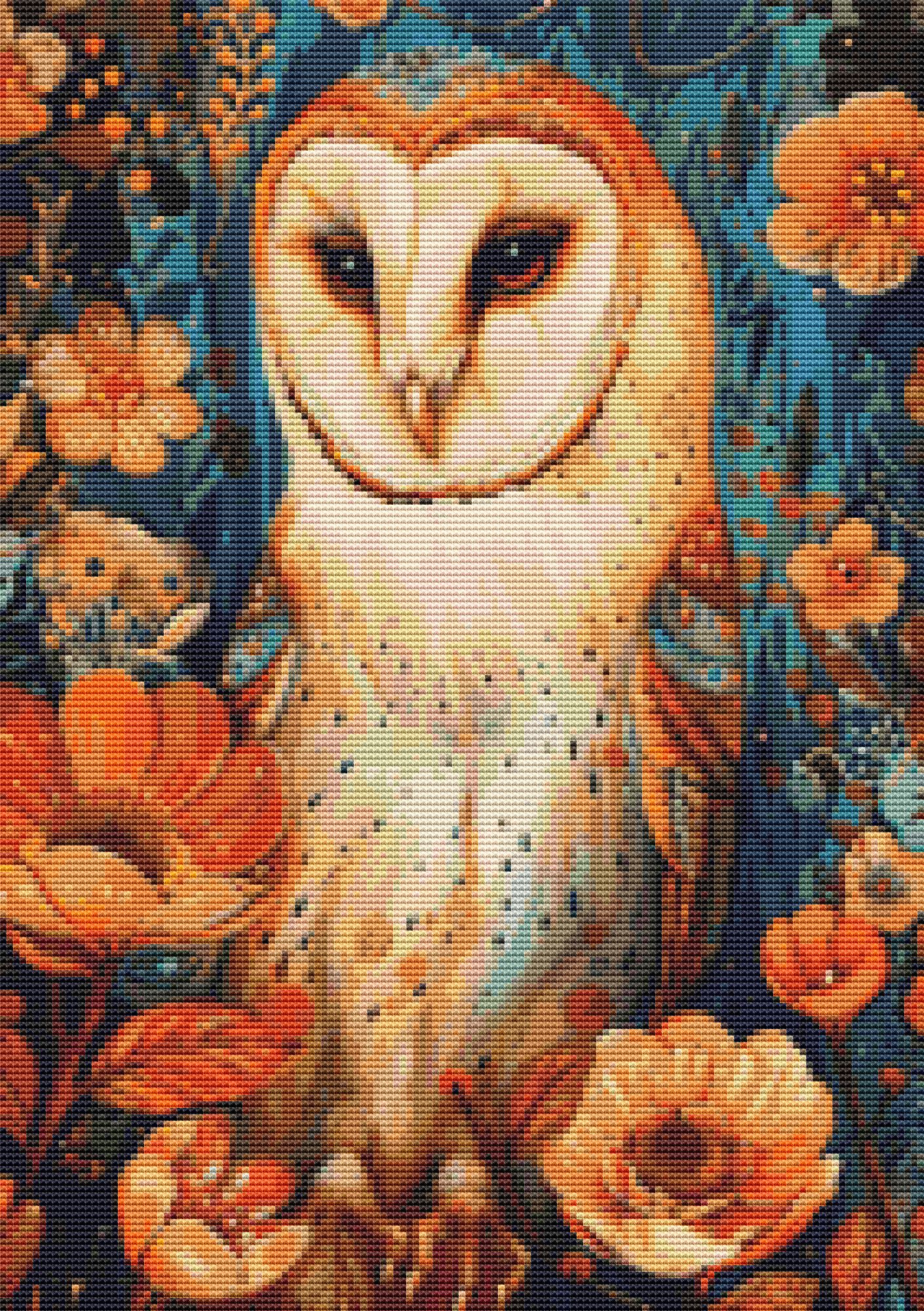This cross stitch pattern depicts a picture of a beautiful owl in among the flowers.