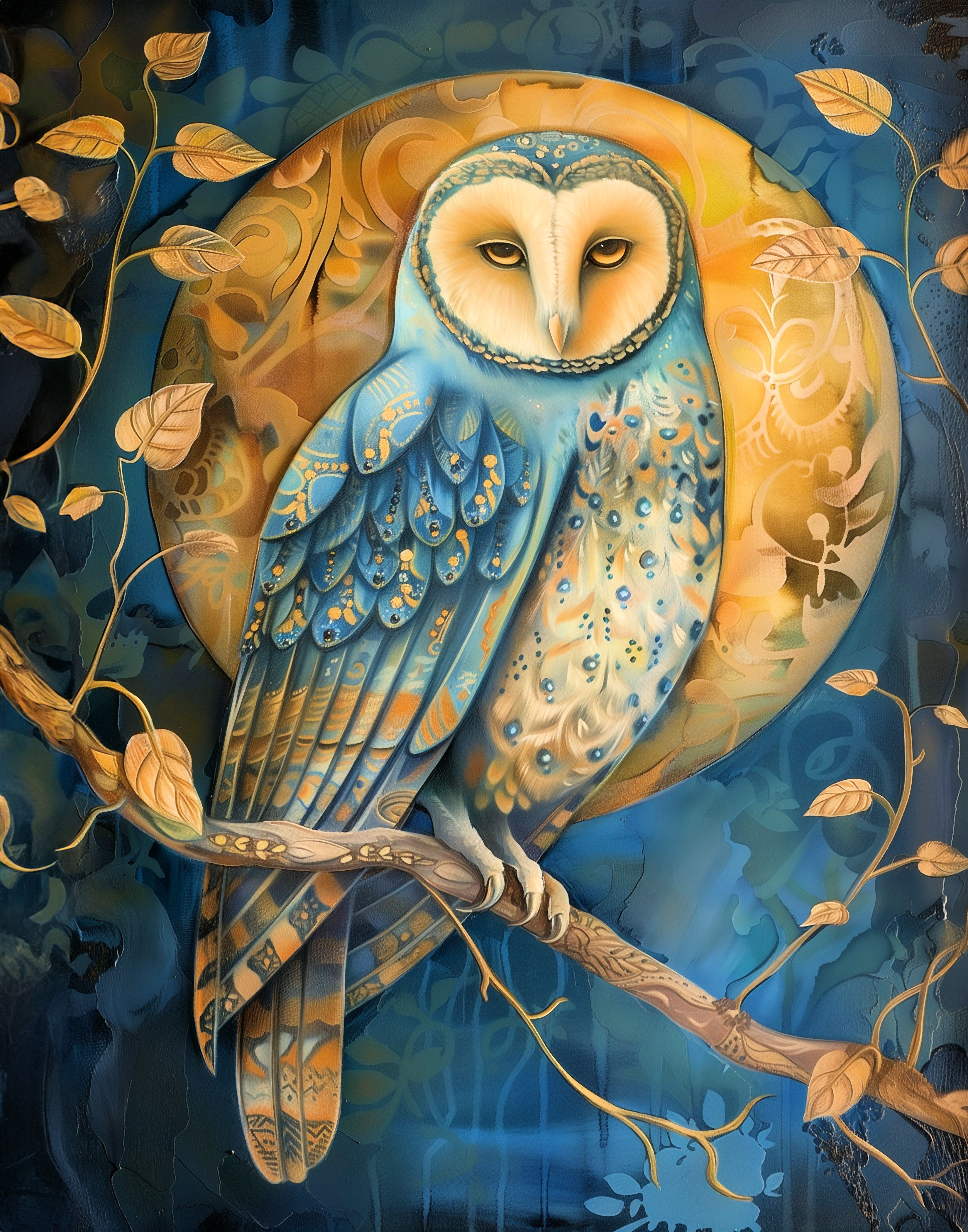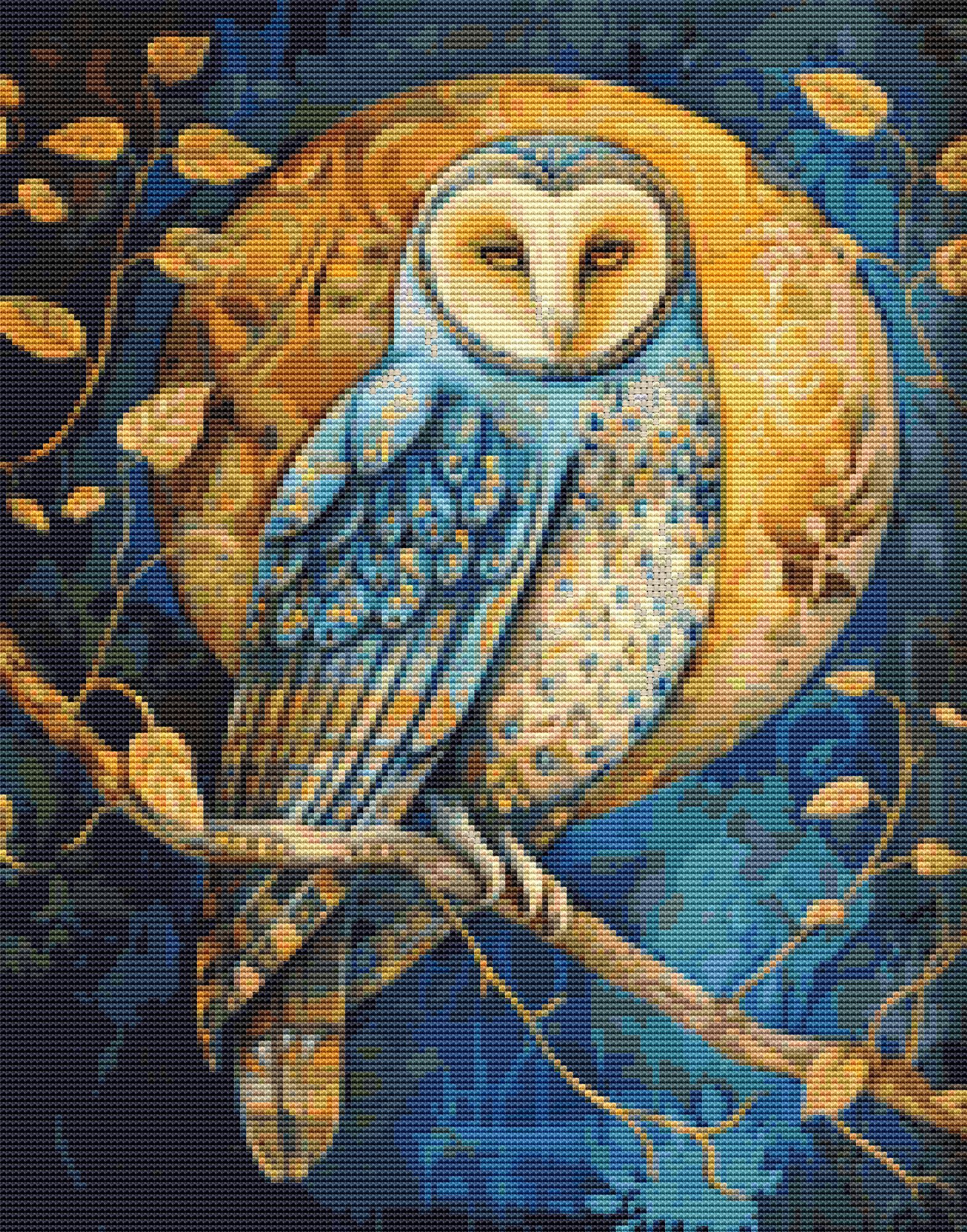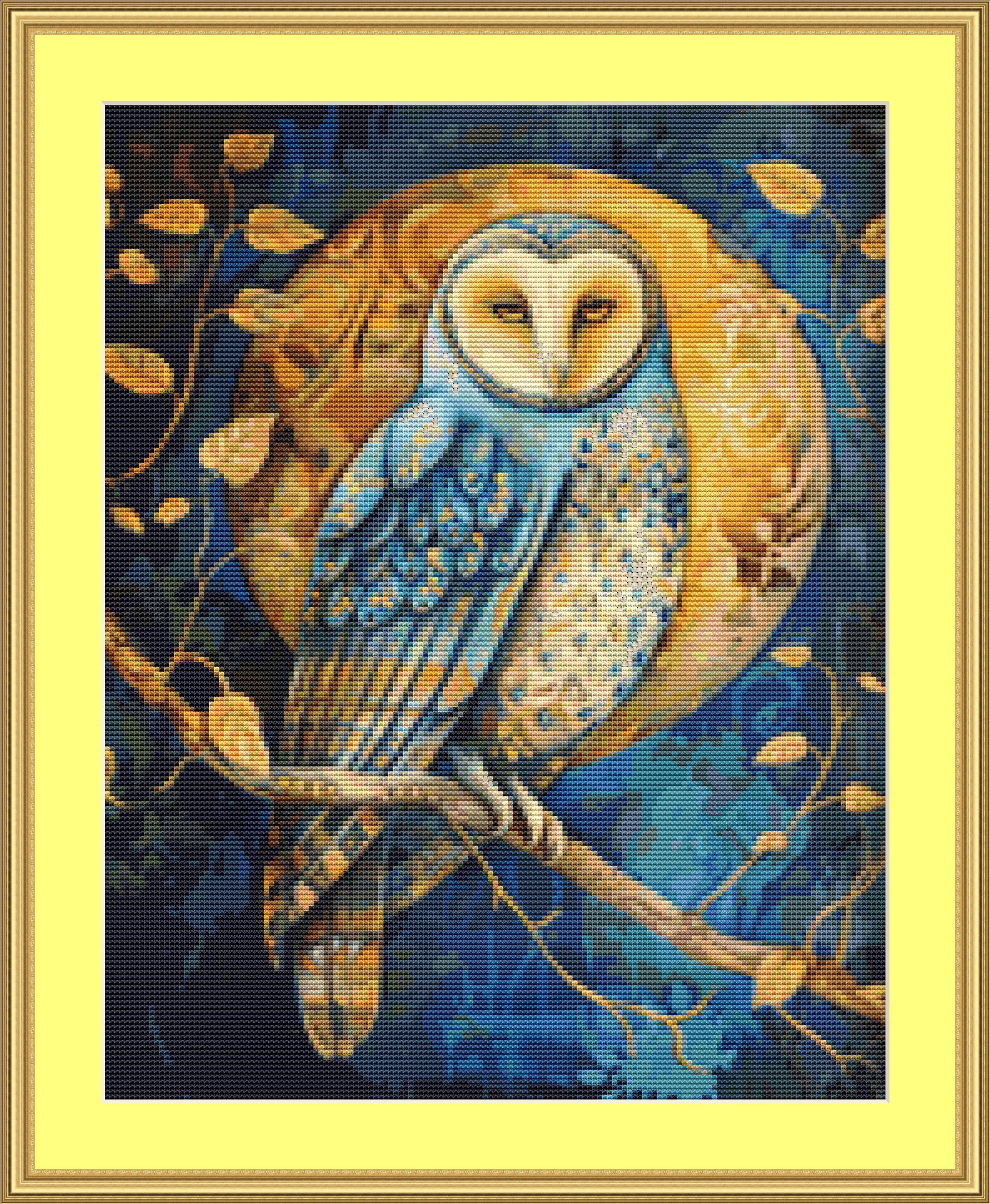 This cross stitch pattern depicts a picture of an owl sat on a branch in front of the moon.