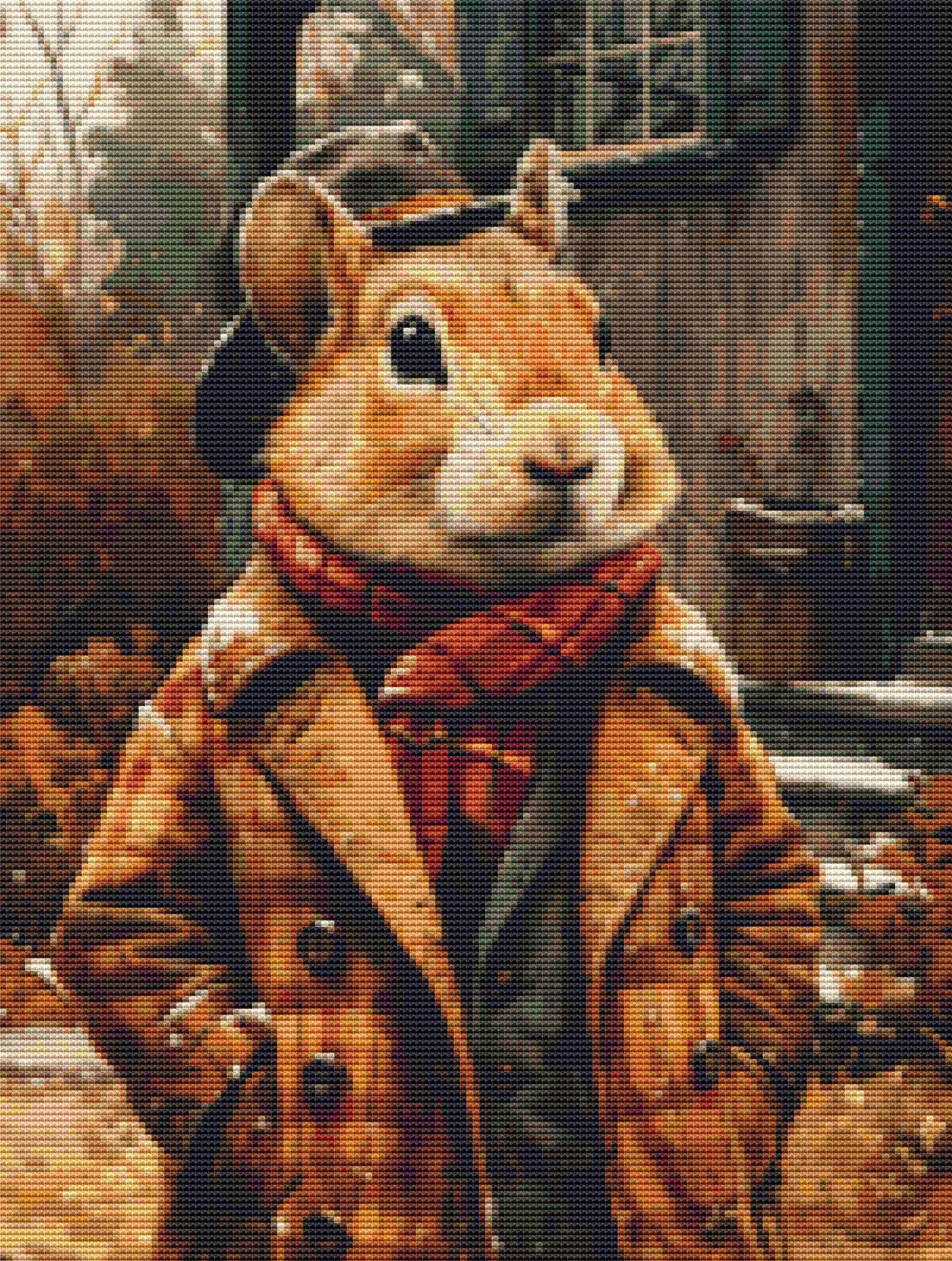 This cross stitch pattern depicts a picture of a hamster dressed for the cold weather.