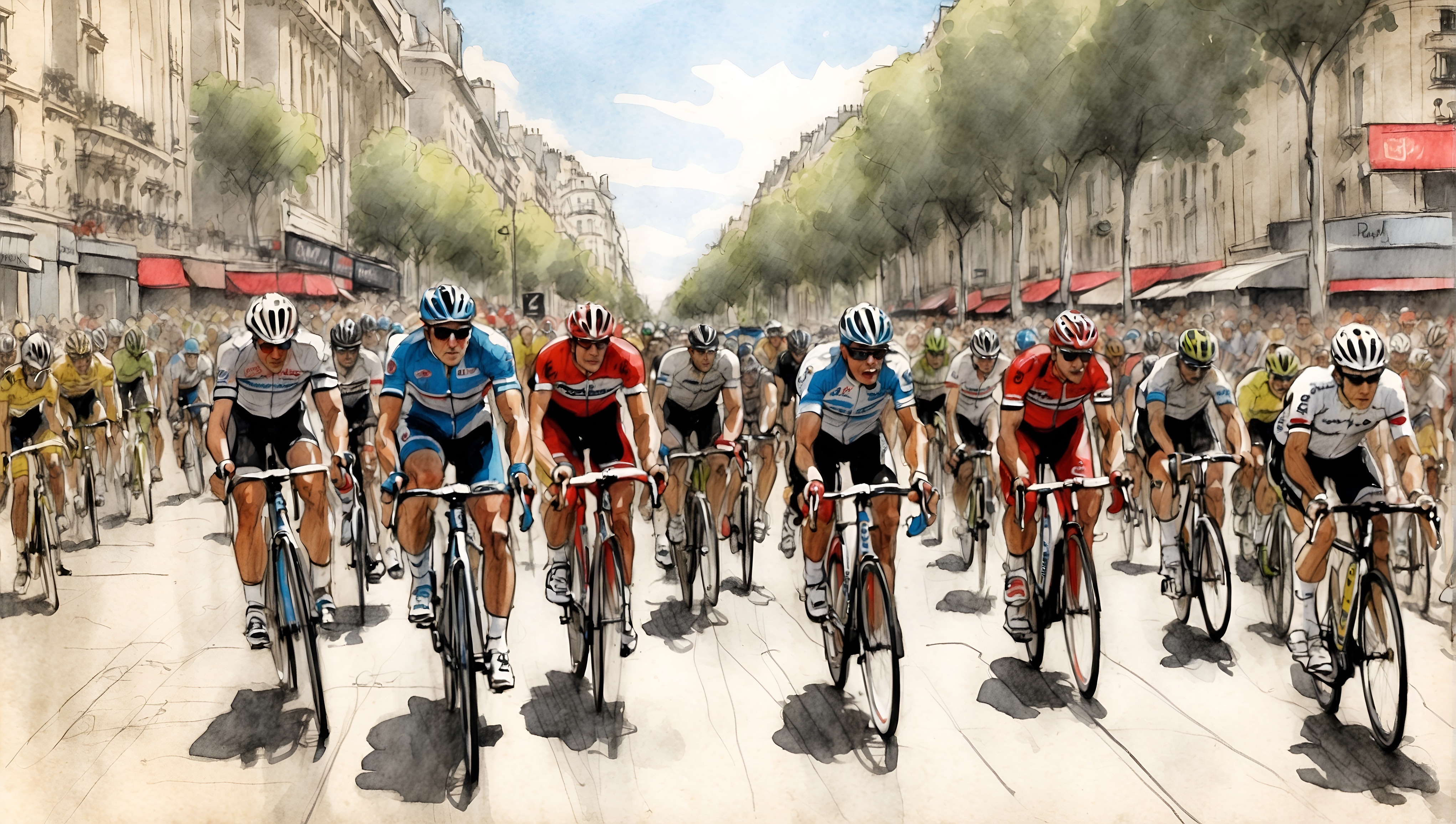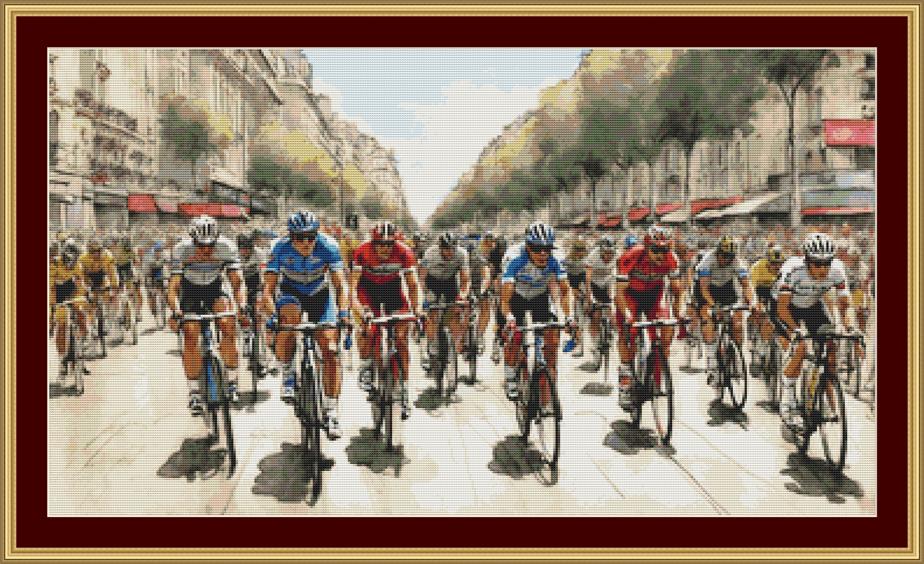 This cross stitch pattern depicts a picture of cyclists racing in the final stage of the Tour De France.