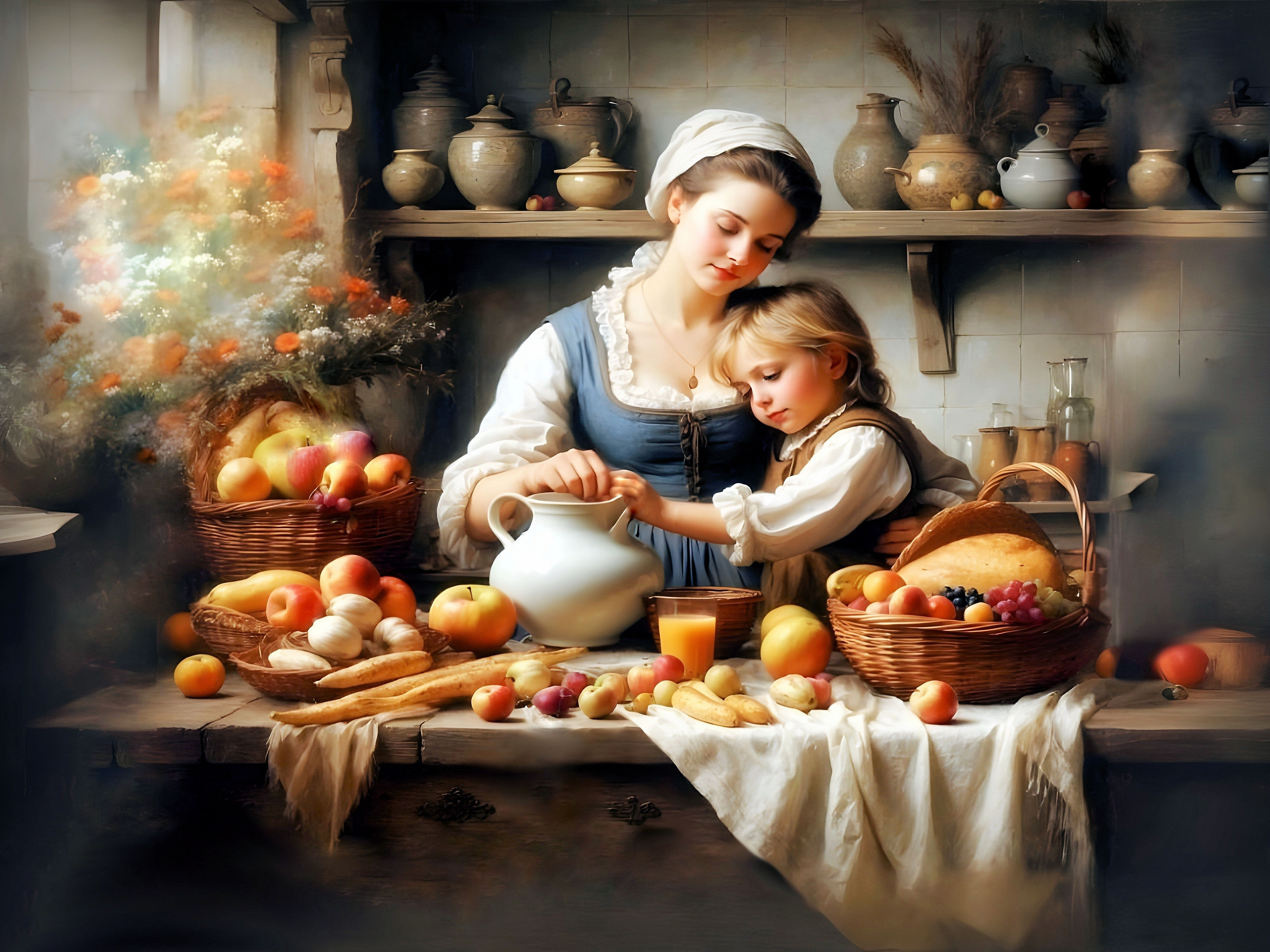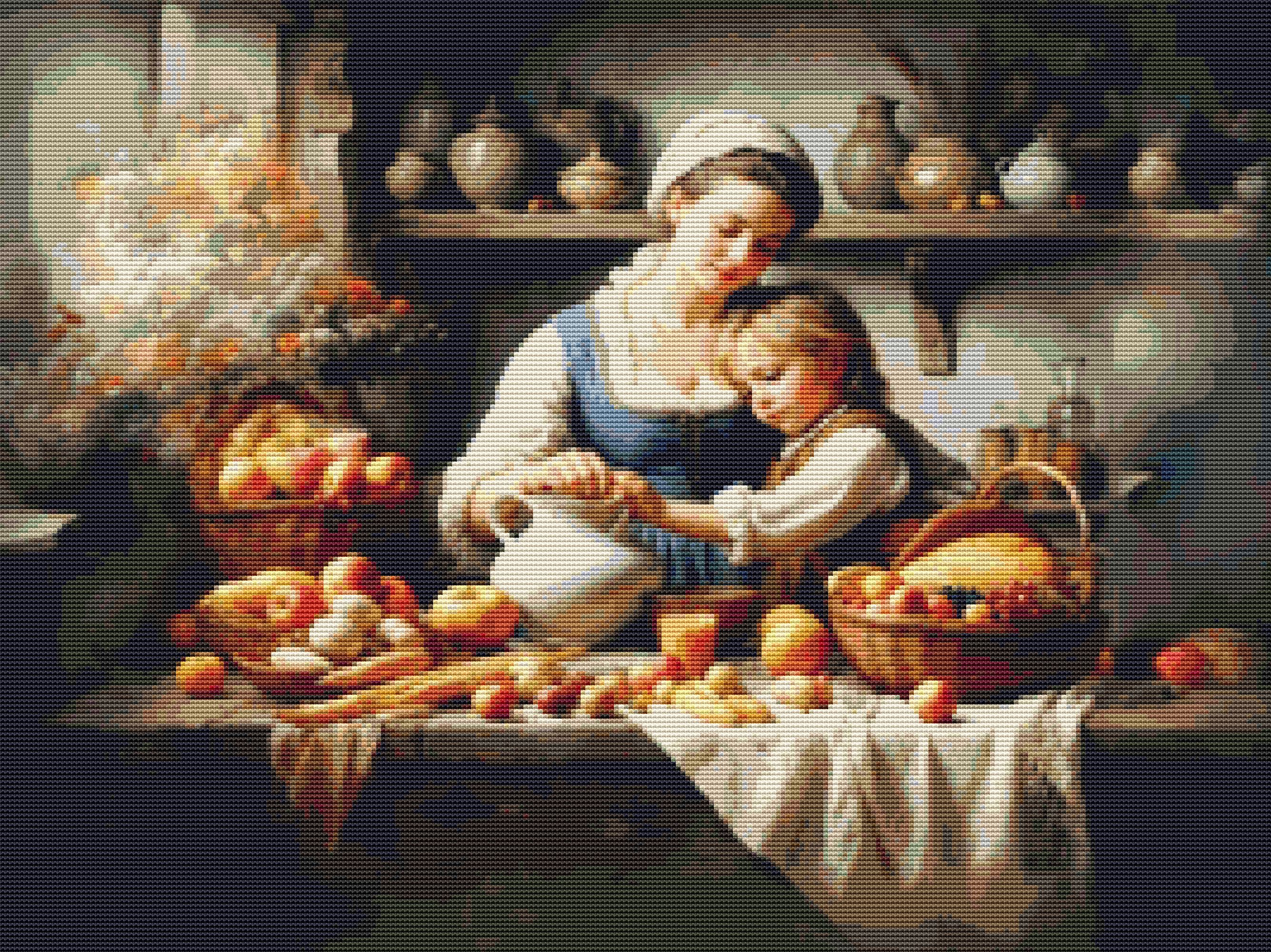 This cross stitch pattern depicts a picture of a woman and child working in a kitchen.