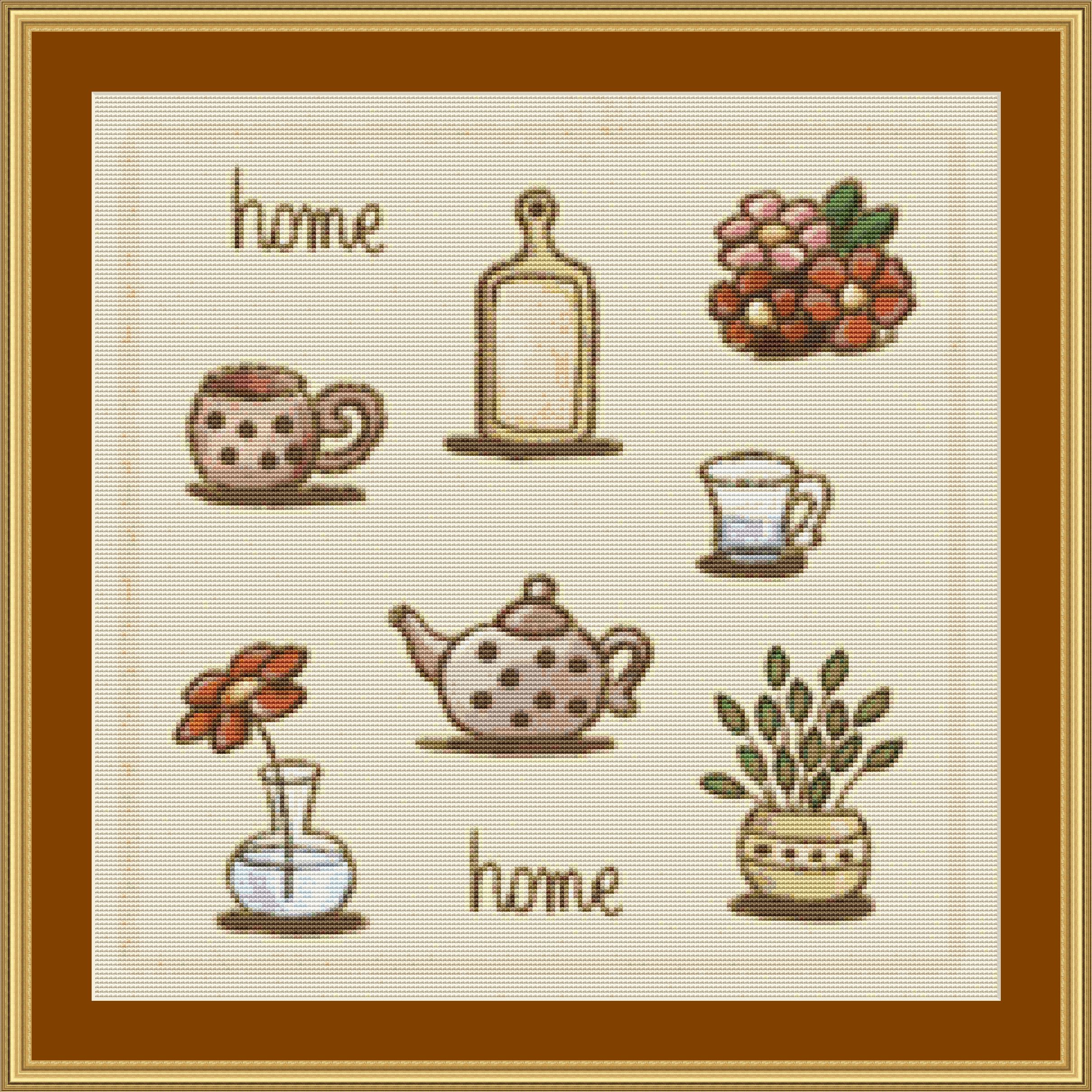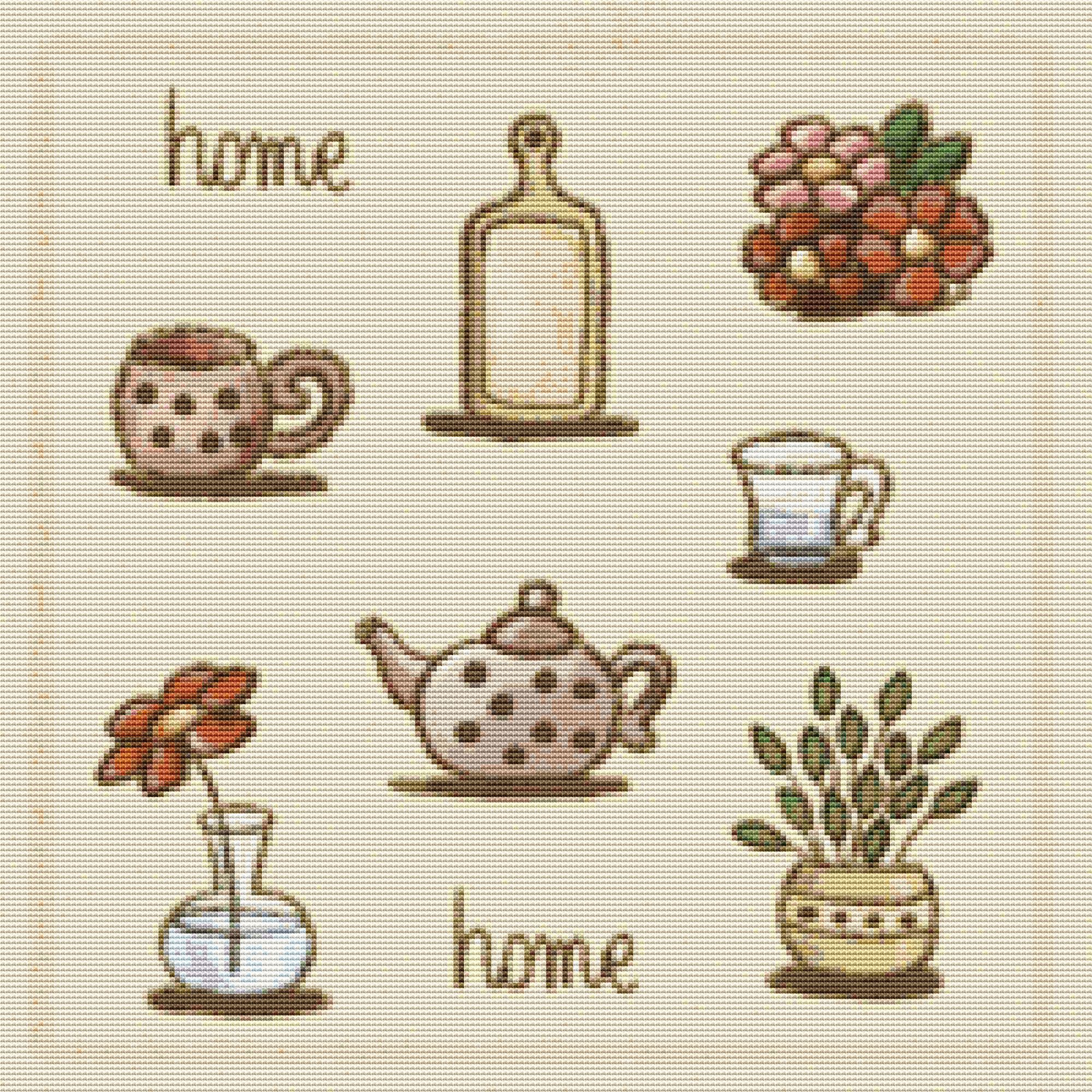 This cross stitch pattern depicts a picture of a sample of things around the home.