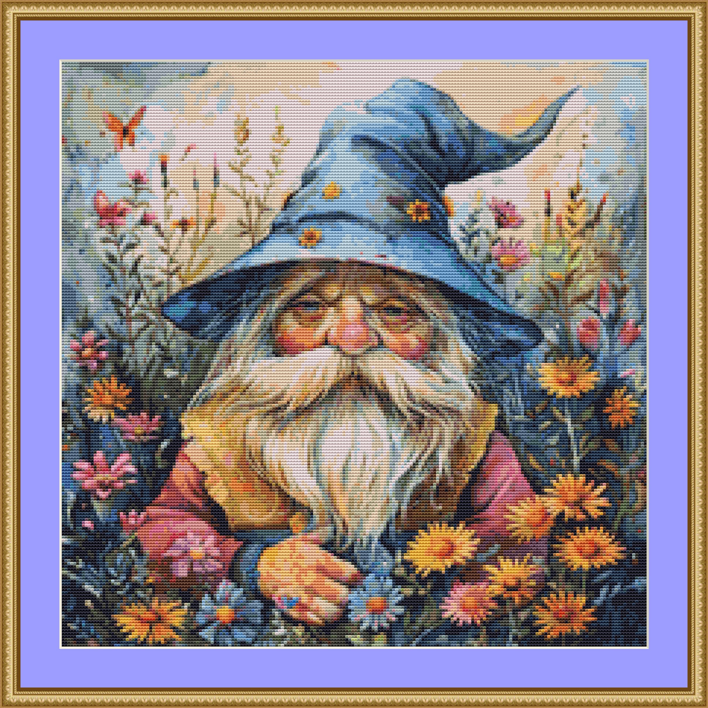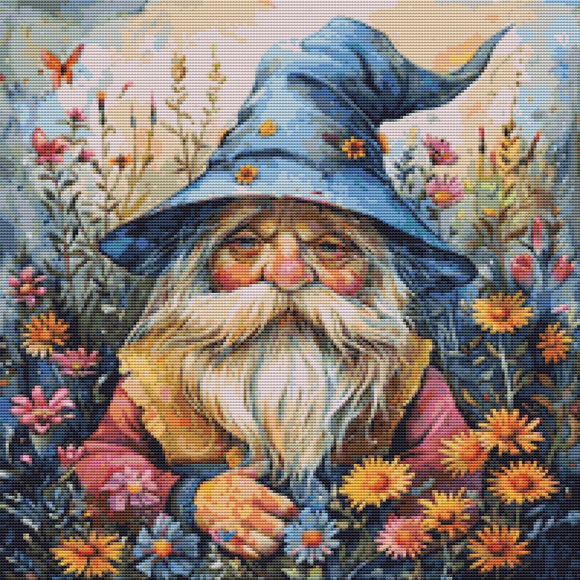 This cross stitch pattern depicts a picture of a garden gnome in among the flowers.