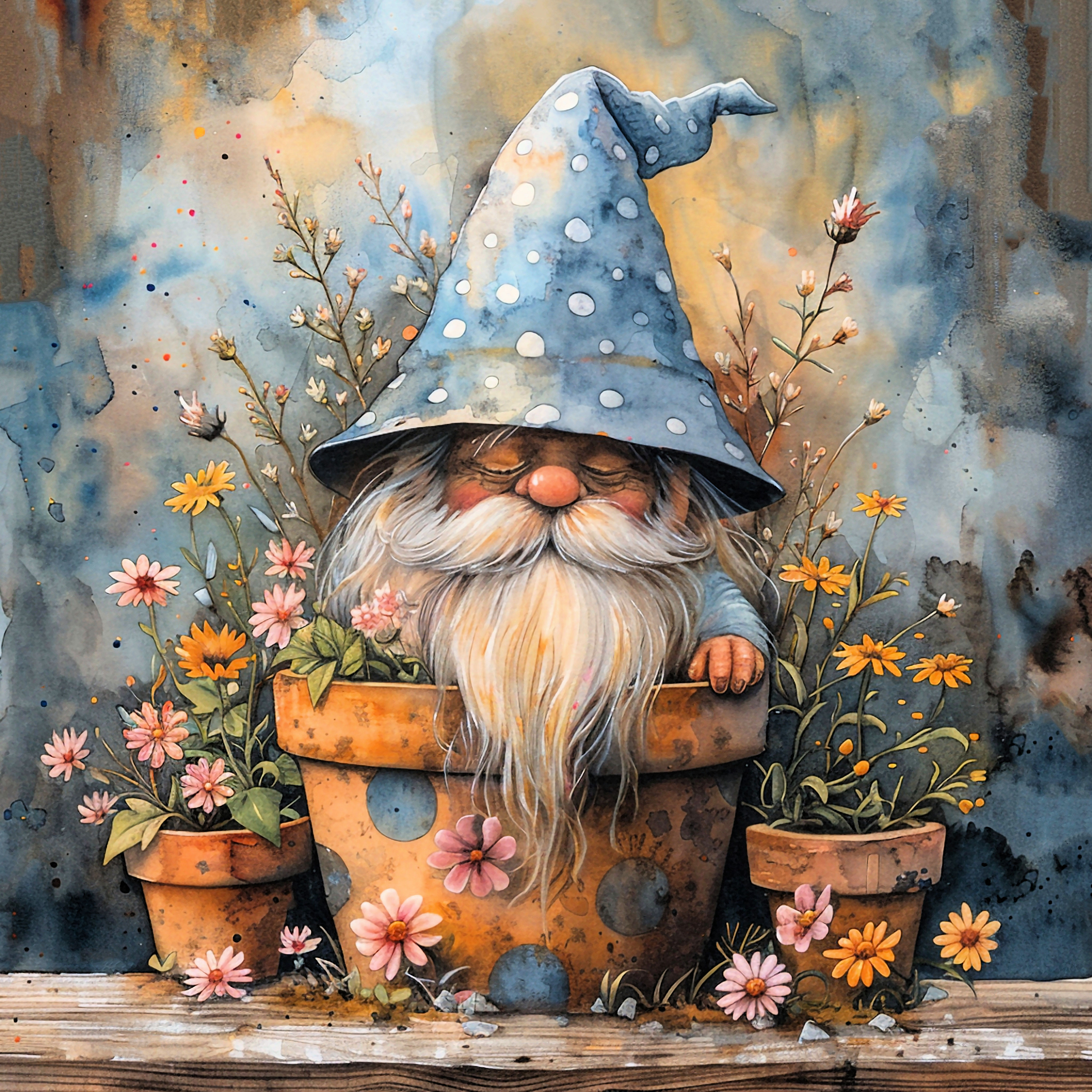 This cross stitch pattern depicts a picture of a garden gnome asleep in a flower pot in among the flowers.