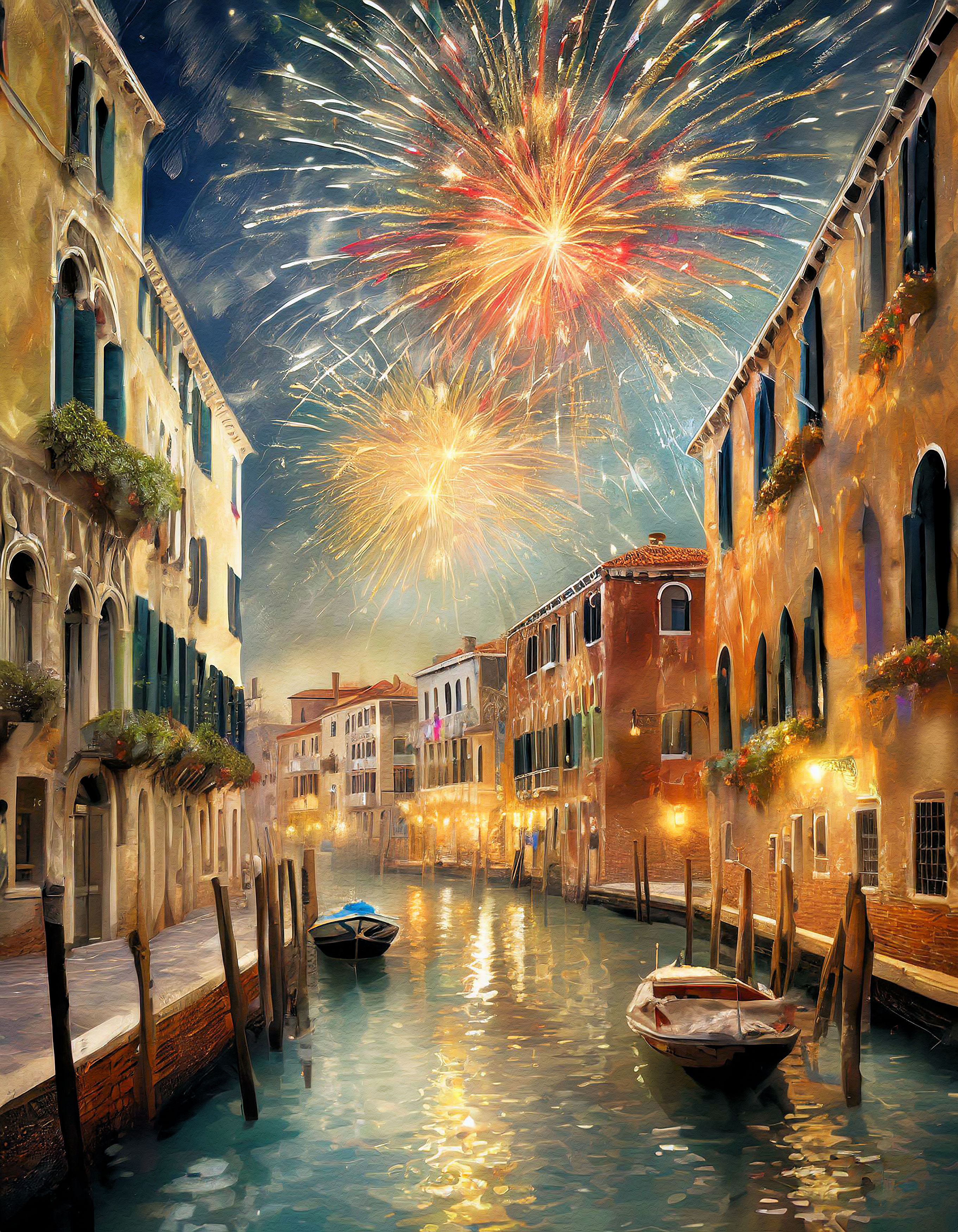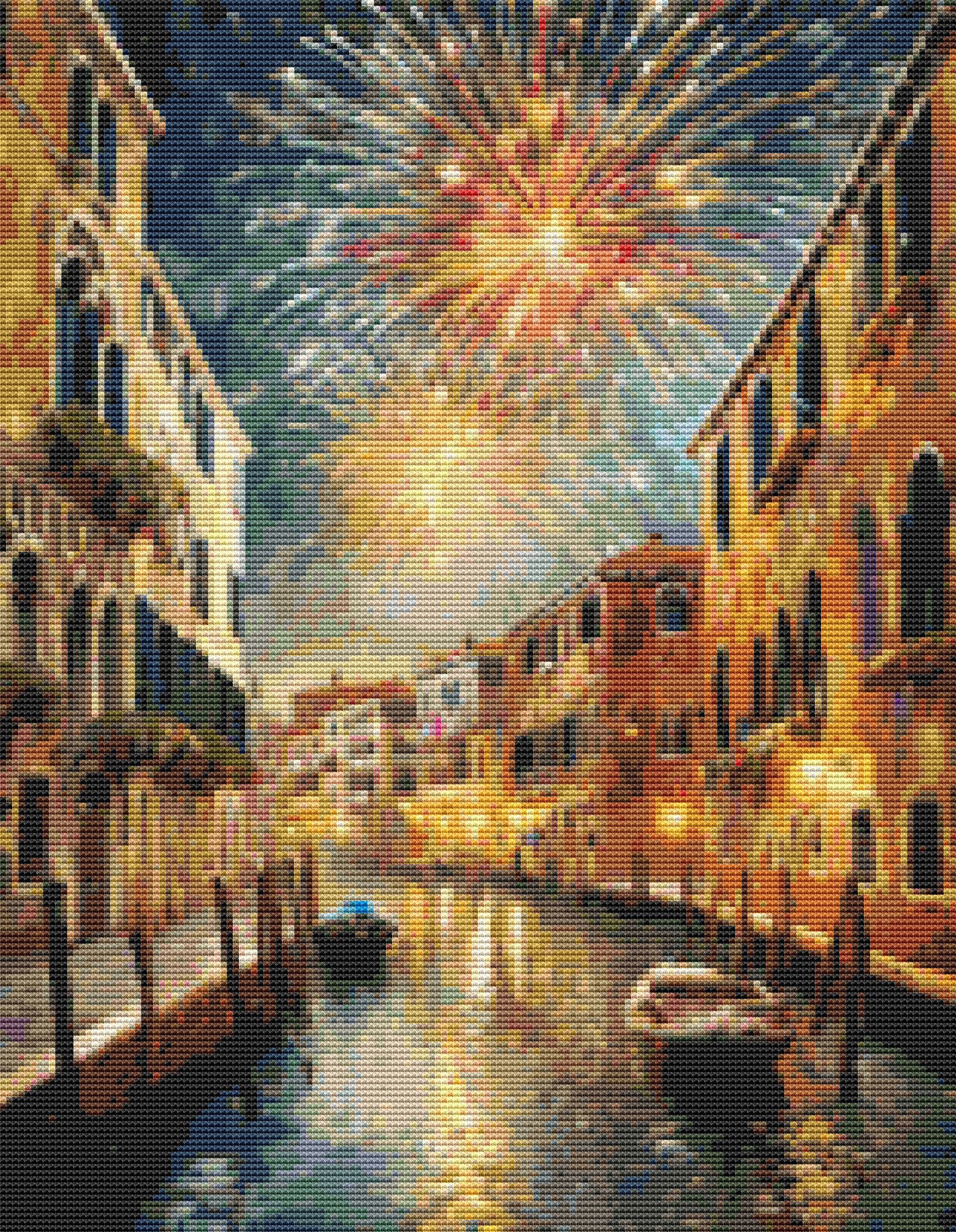This cross stitch pattern depicts a picture of the colourful fireworks above a canal in Venice.