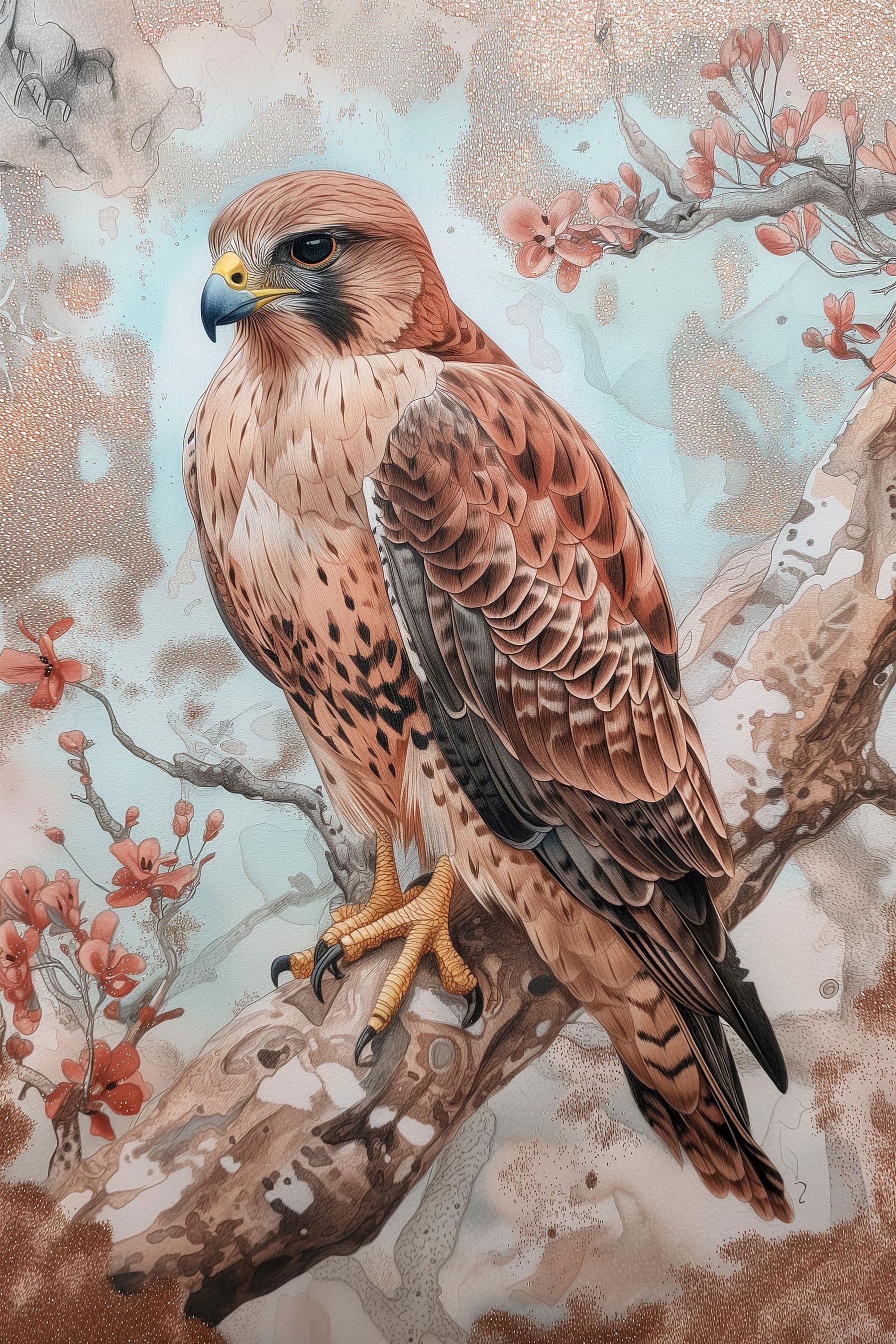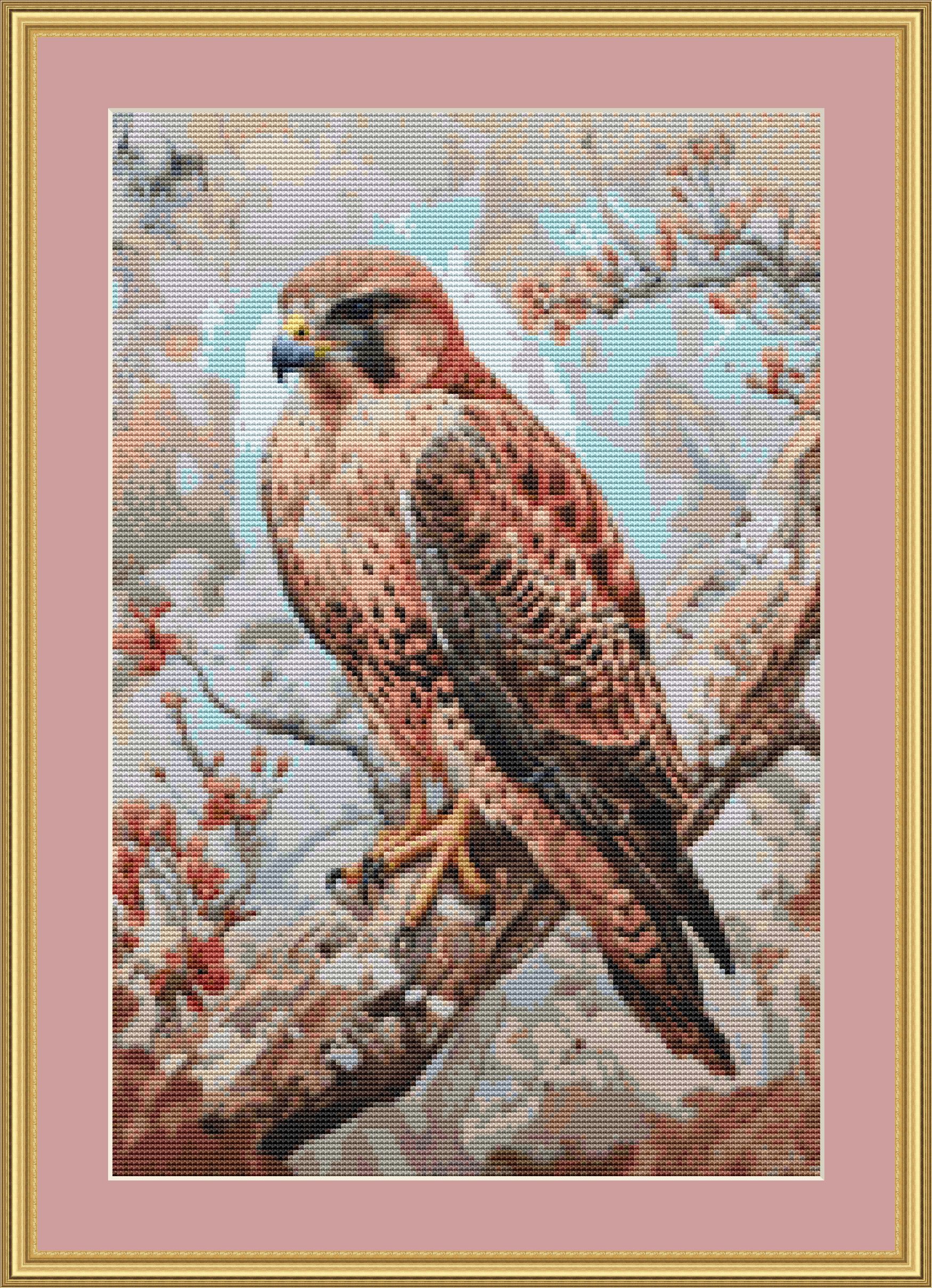 This cross stitch pattern depicts a picture of a beautiful falcon.