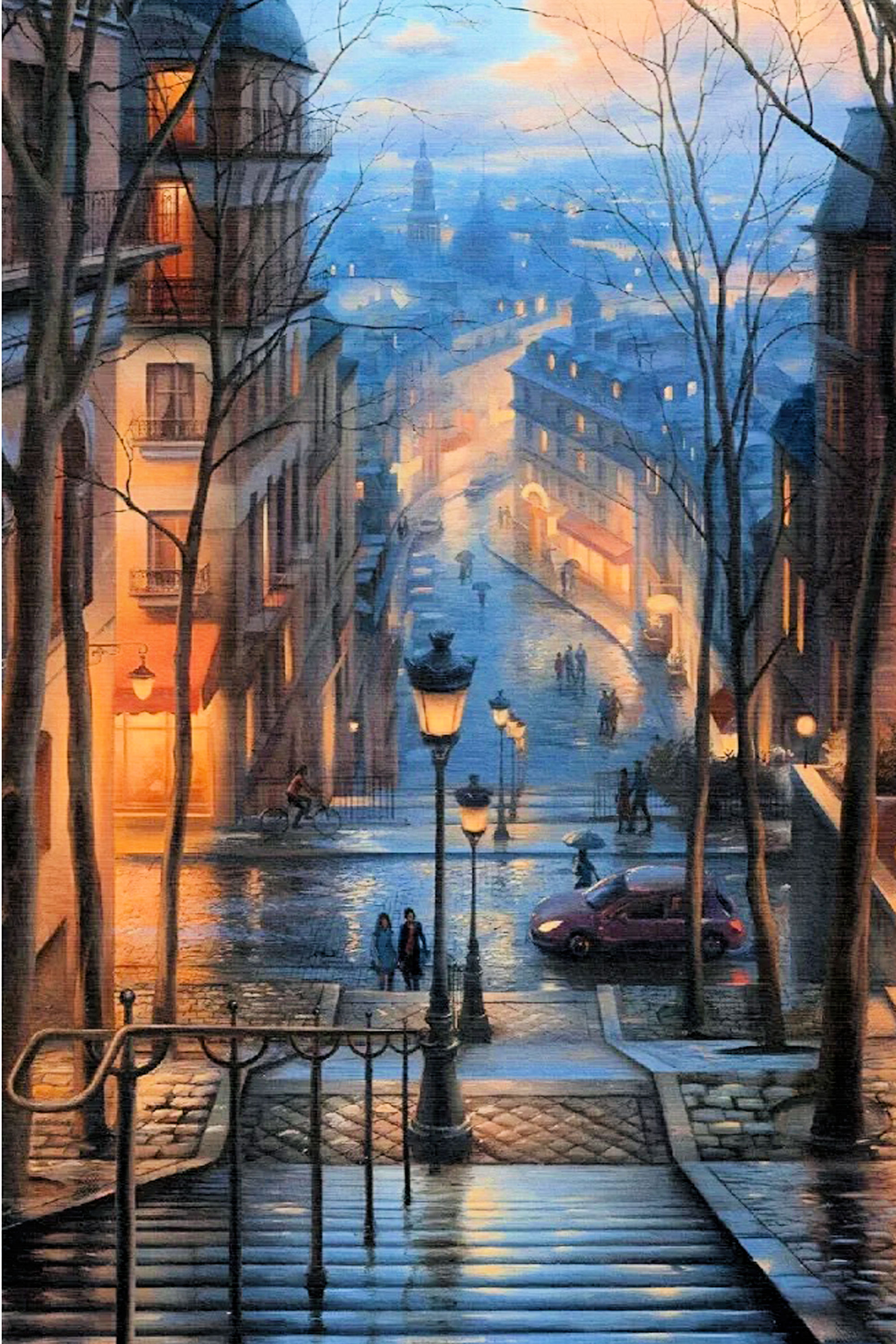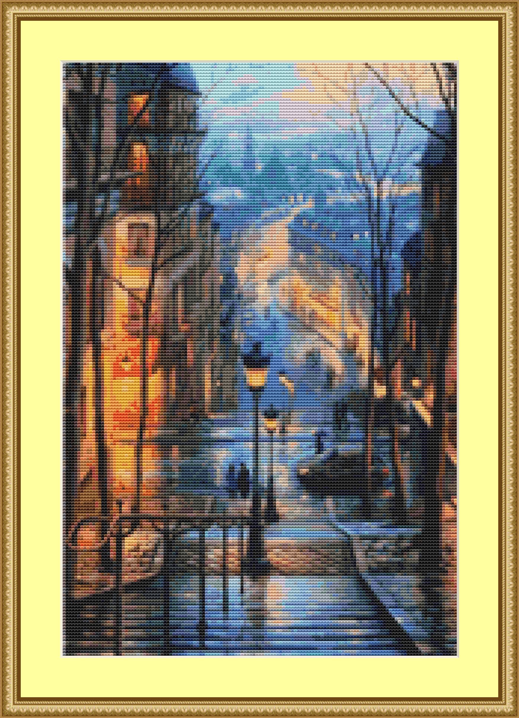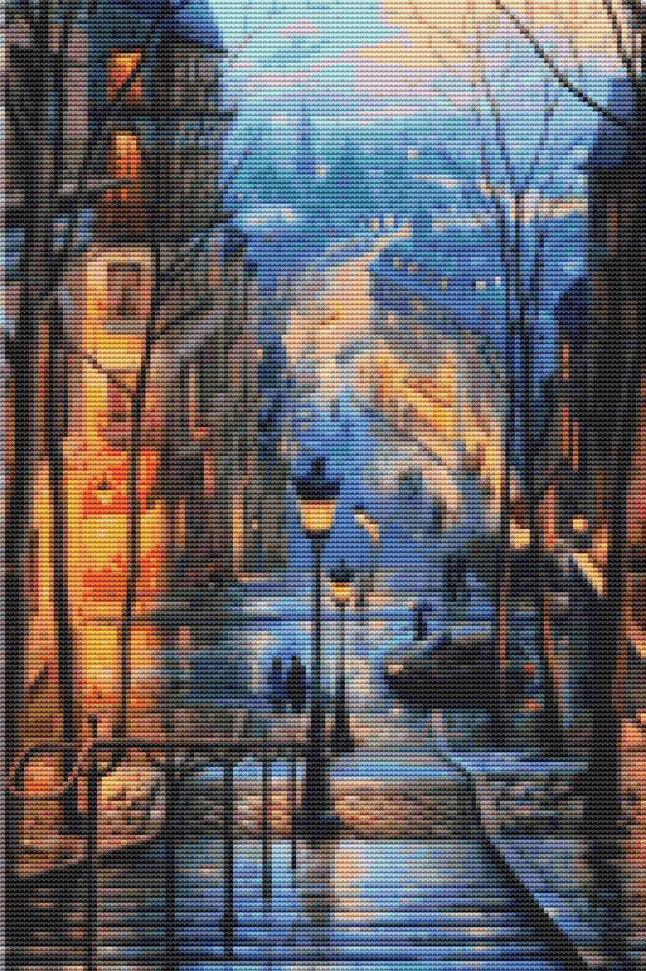 This cross stitch pattern depicts a picture of the night time scene in a city.