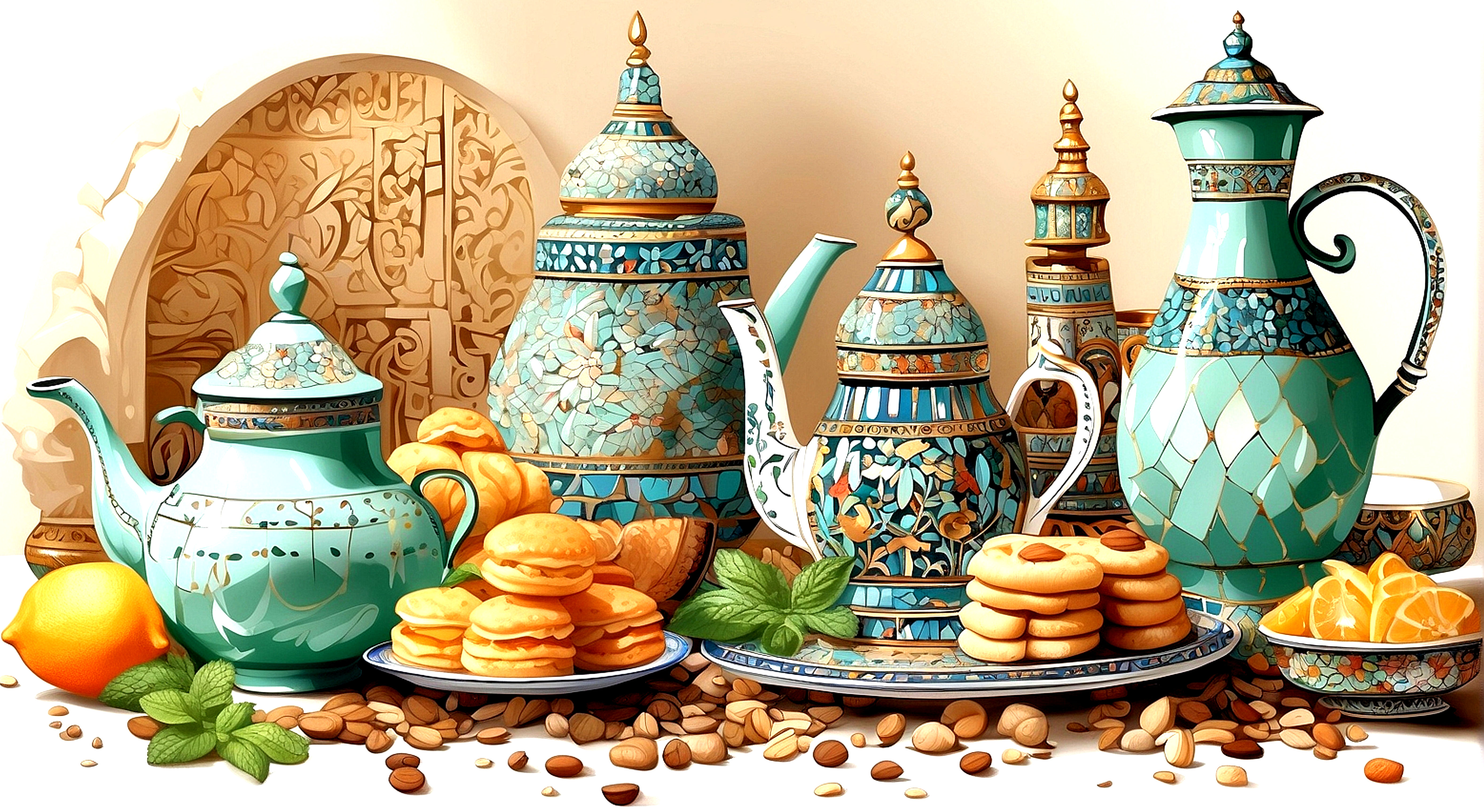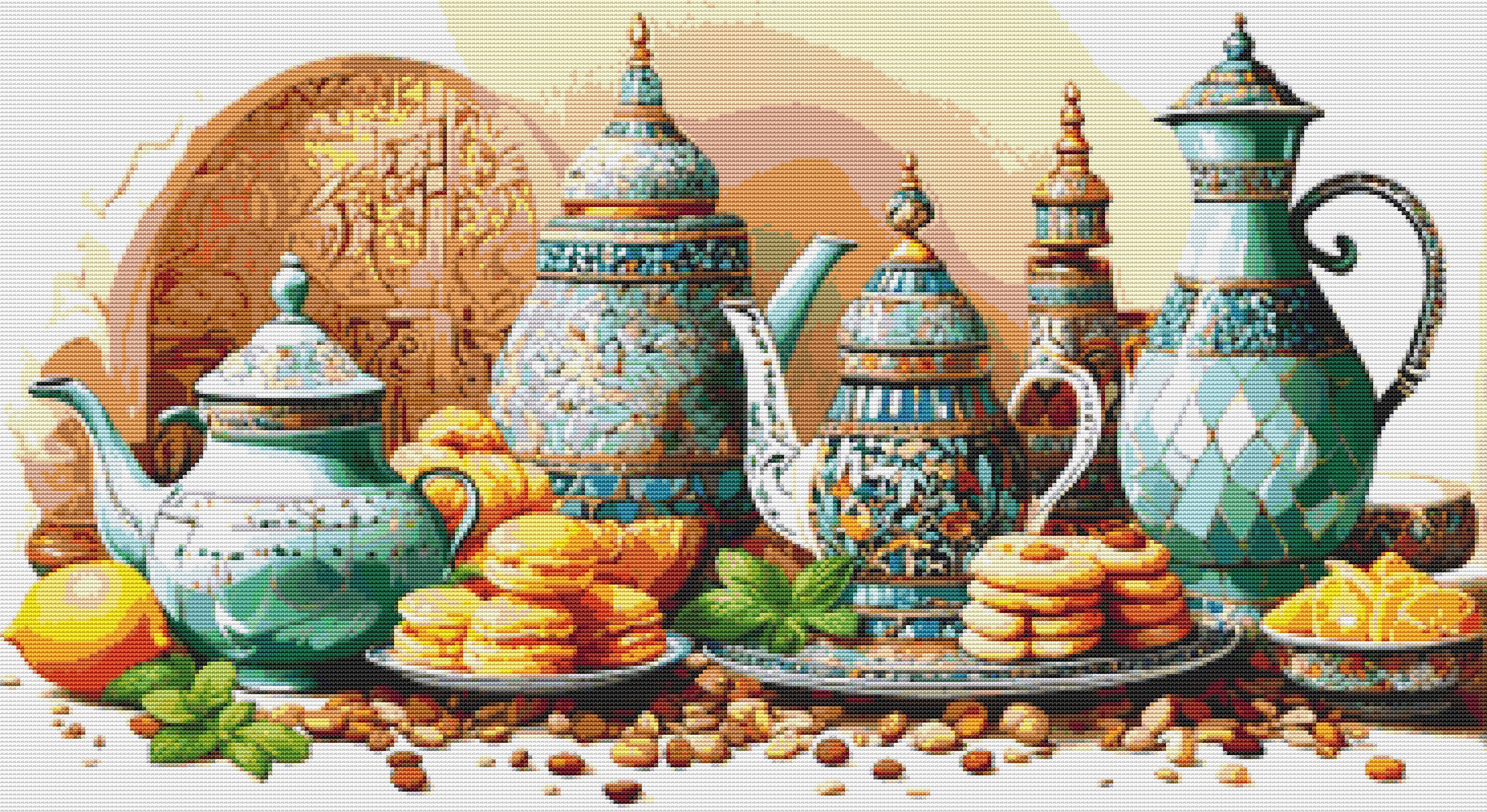 This cross stitch pattern depicts a picture of some beautifully decorated pots.