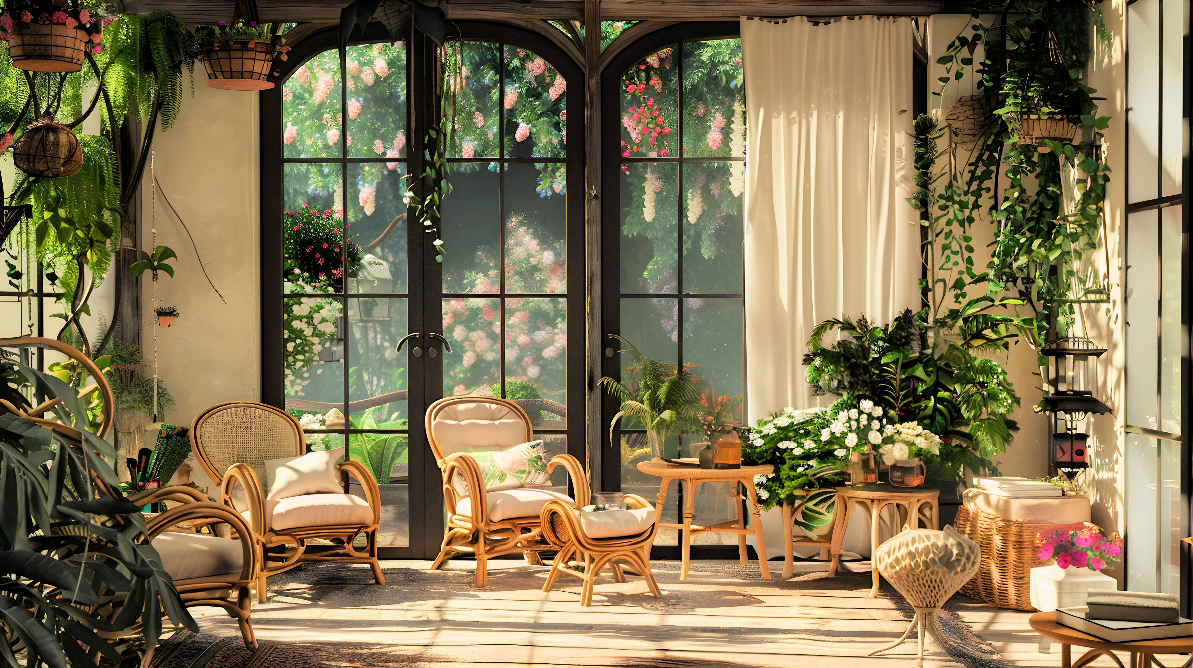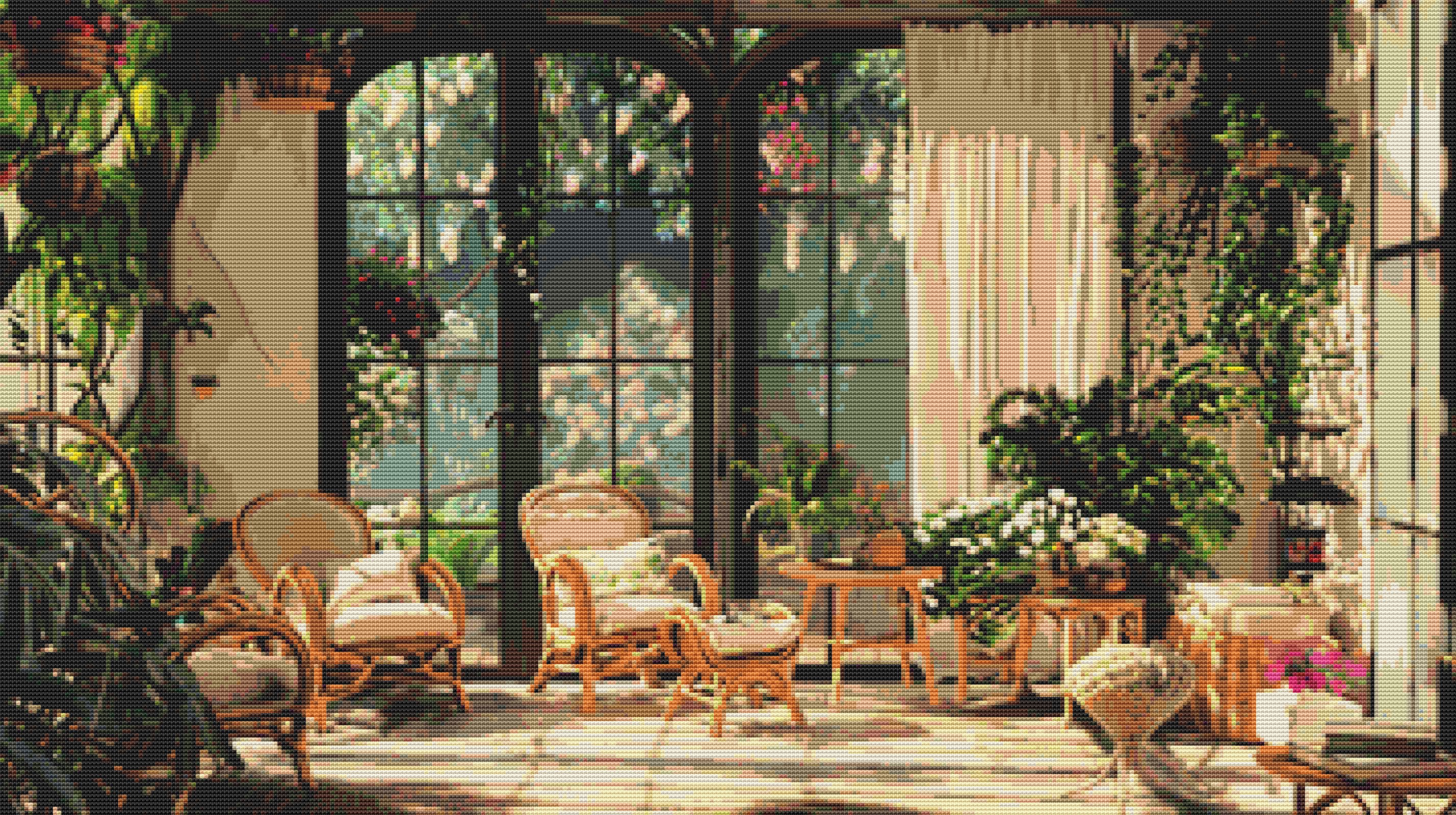 This cross stitch pattern depicts a picture of an elegant conservatory with plants and chairs.