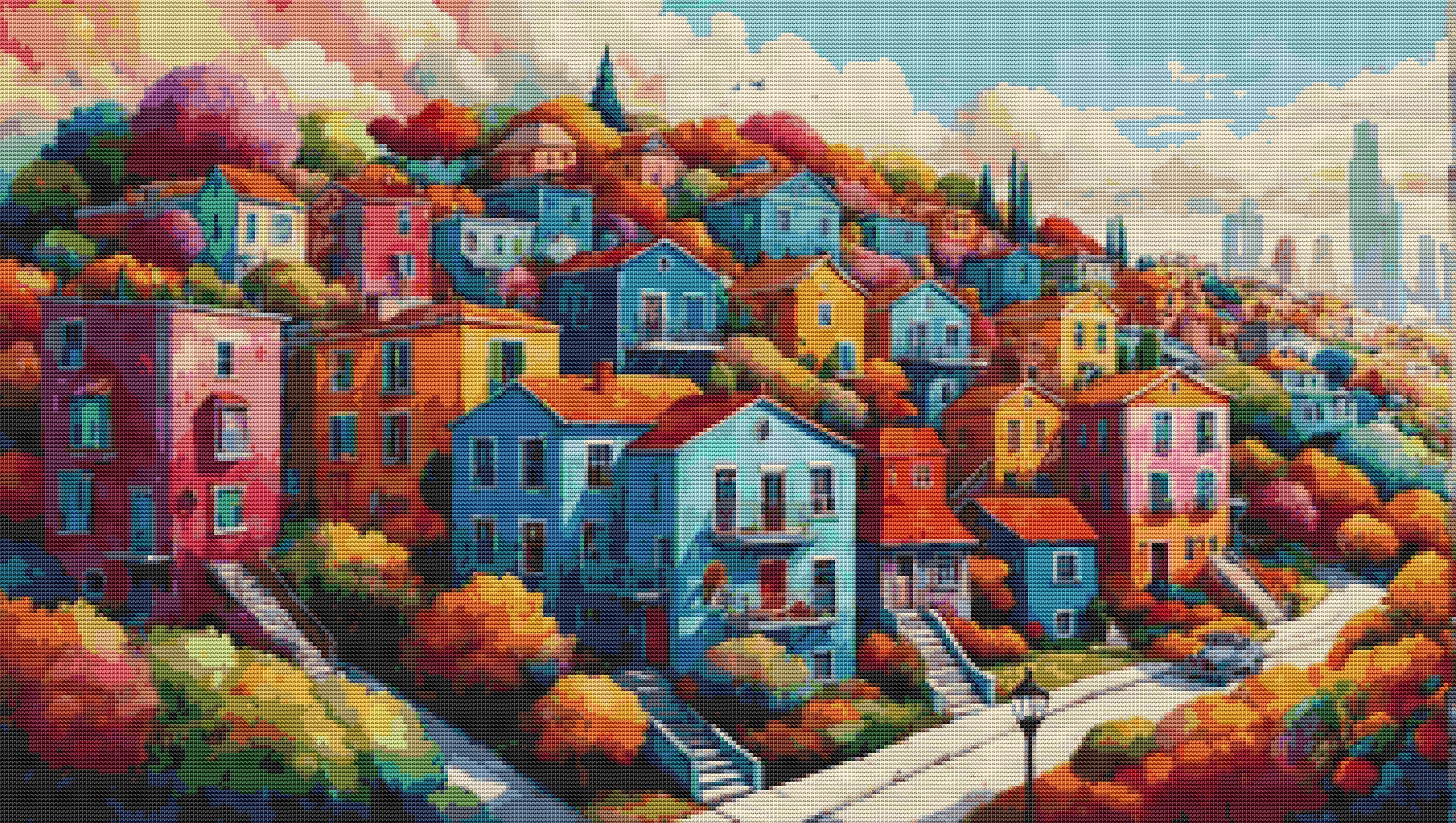This cross stitch pattern depicts a picture of a street with colourful houses on it.