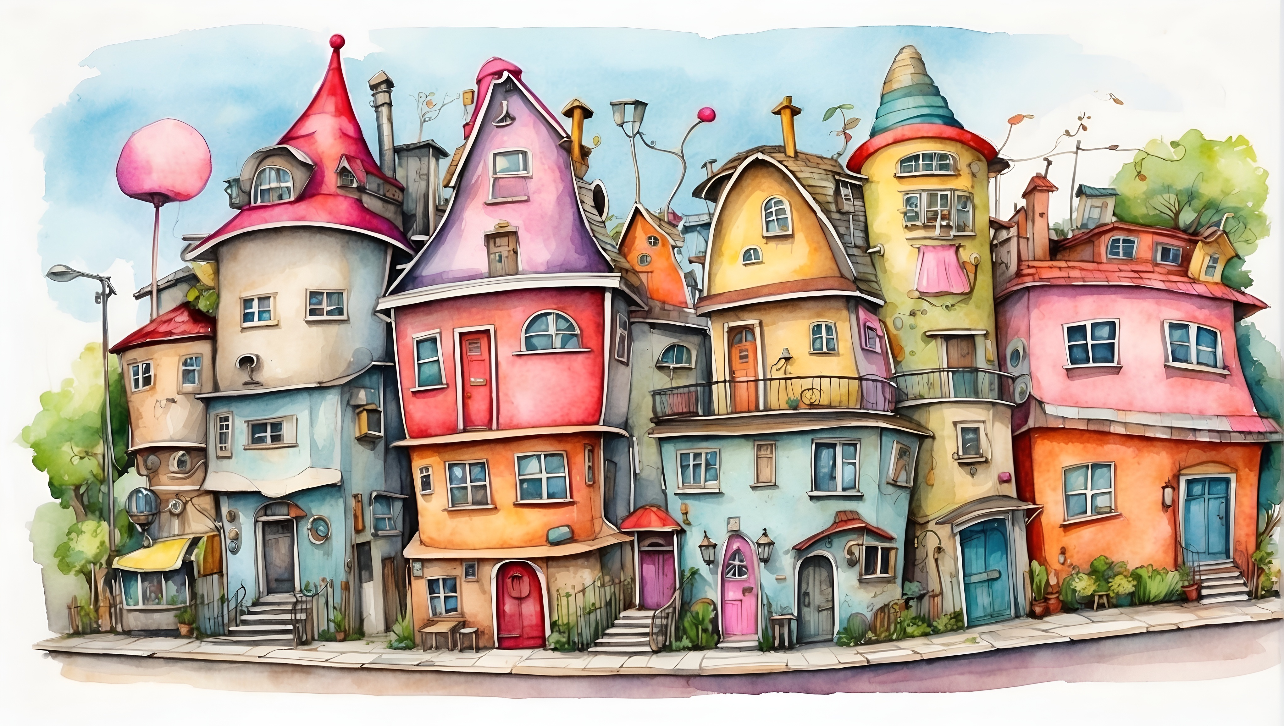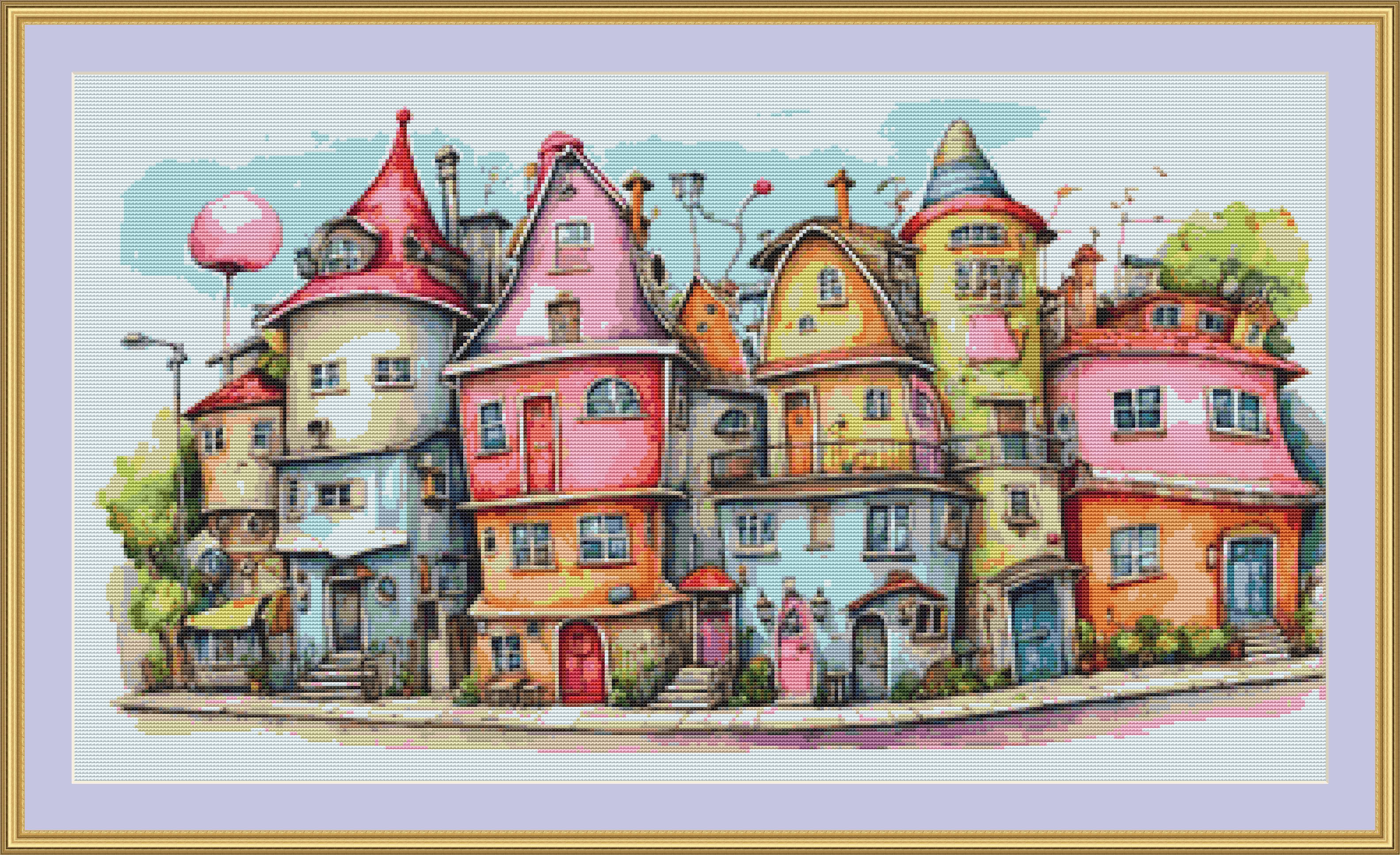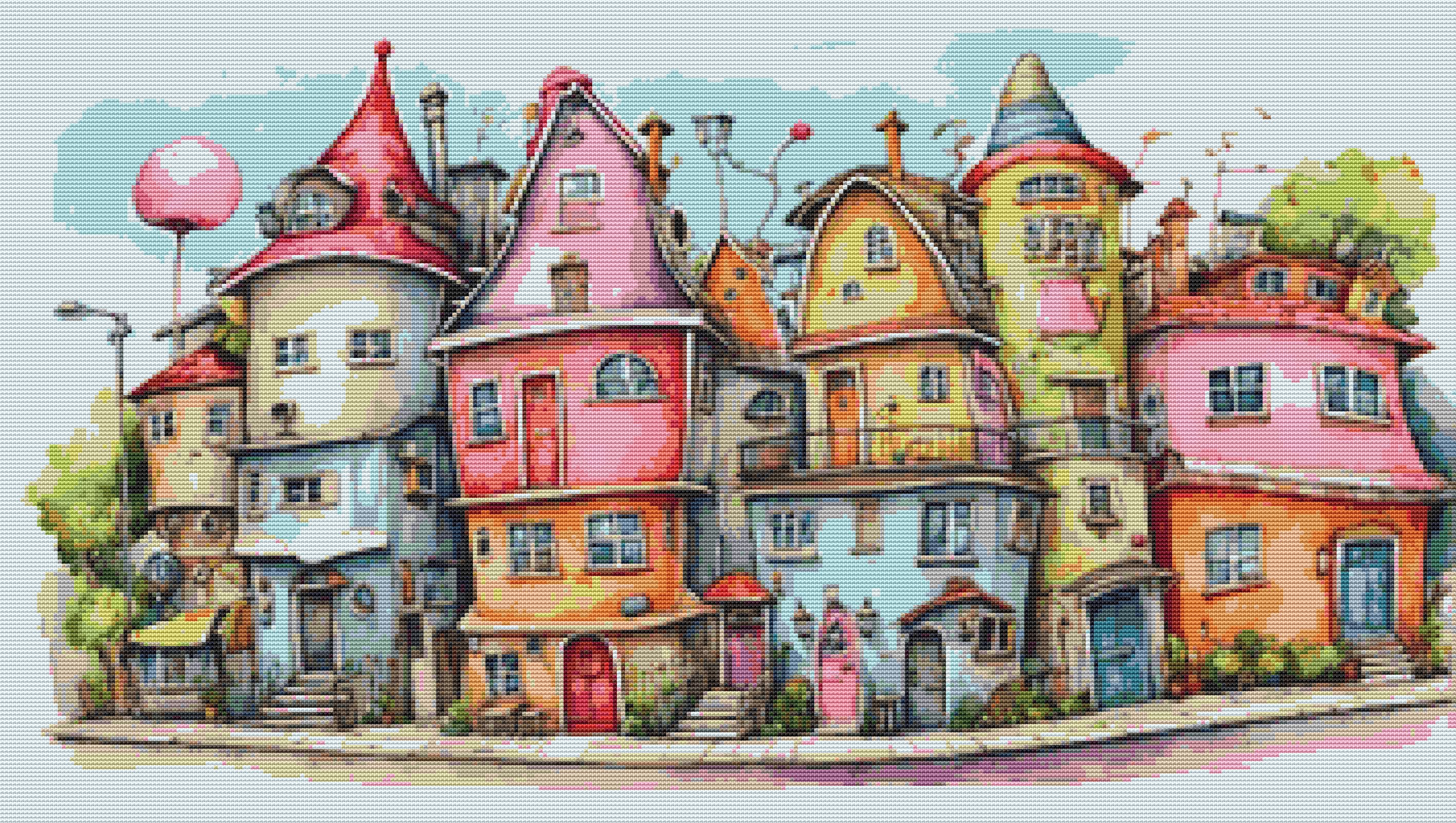 This cross stitch pattern depicts a picture of a colourful houses very close to one another.