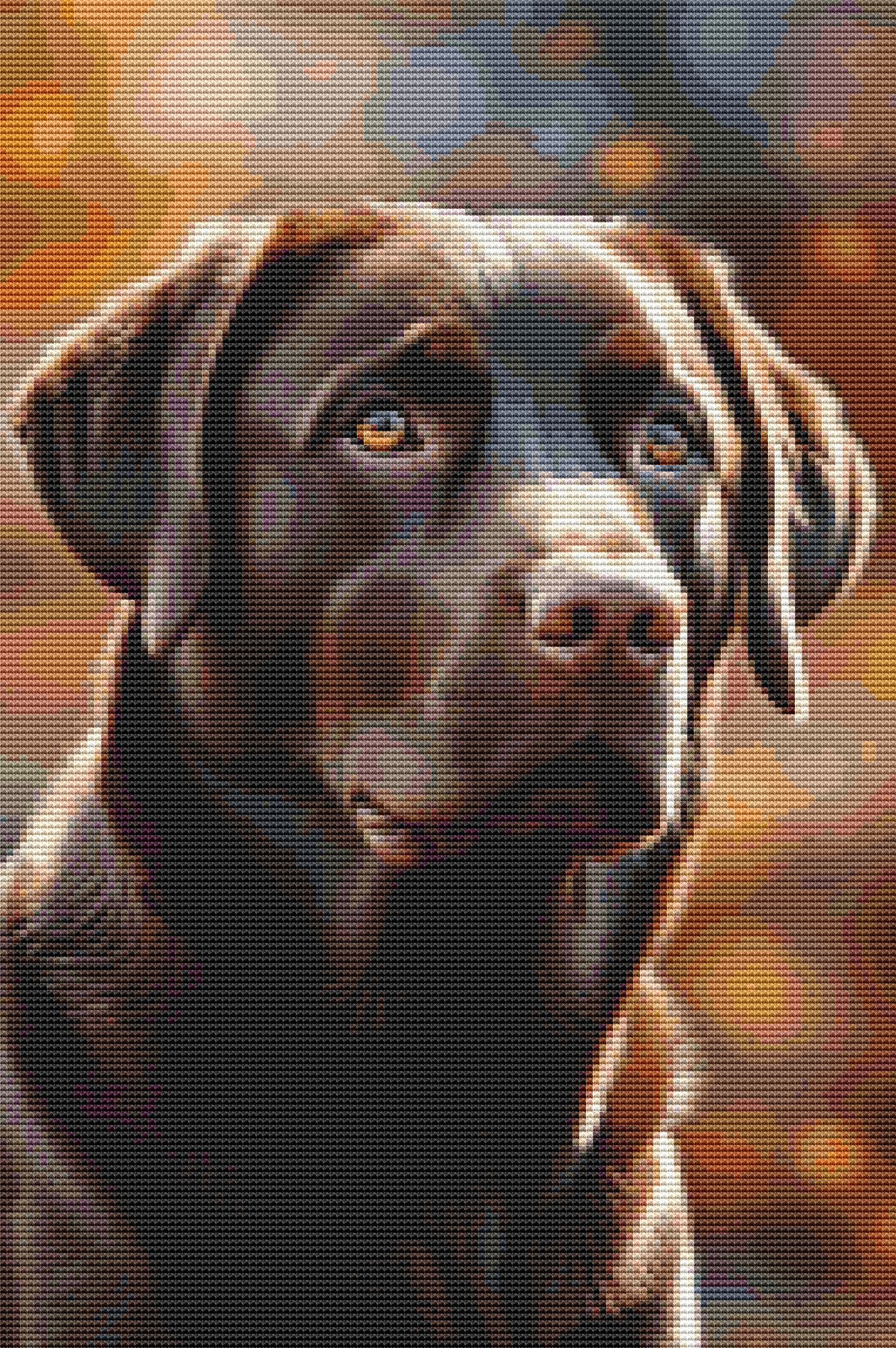 This cross stitch pattern depicts a picture of a stunning looking chocolate Labrador.