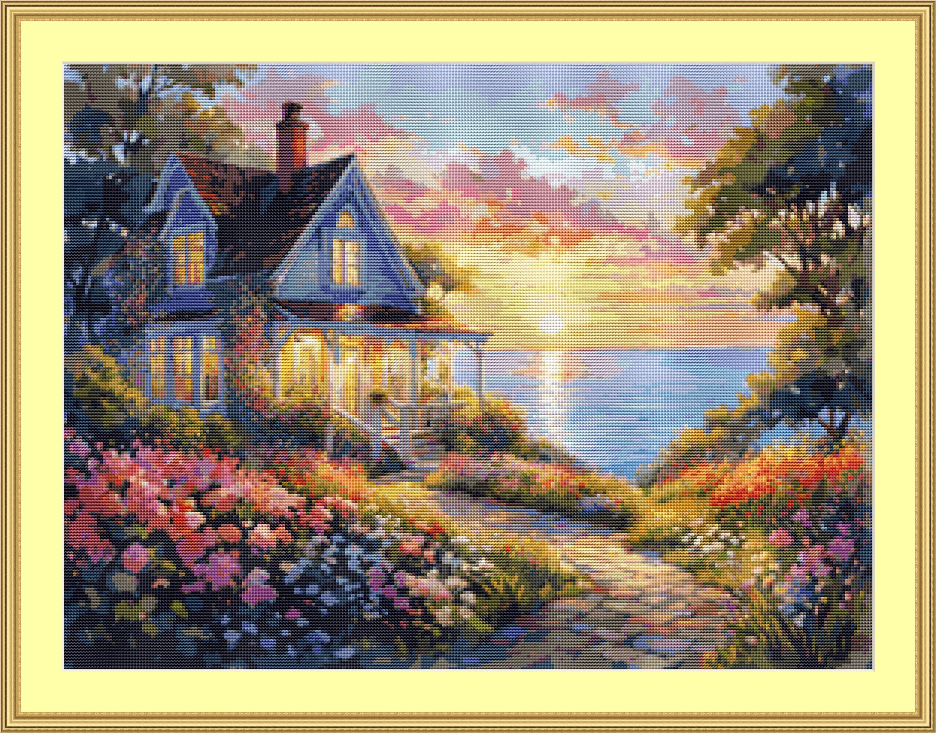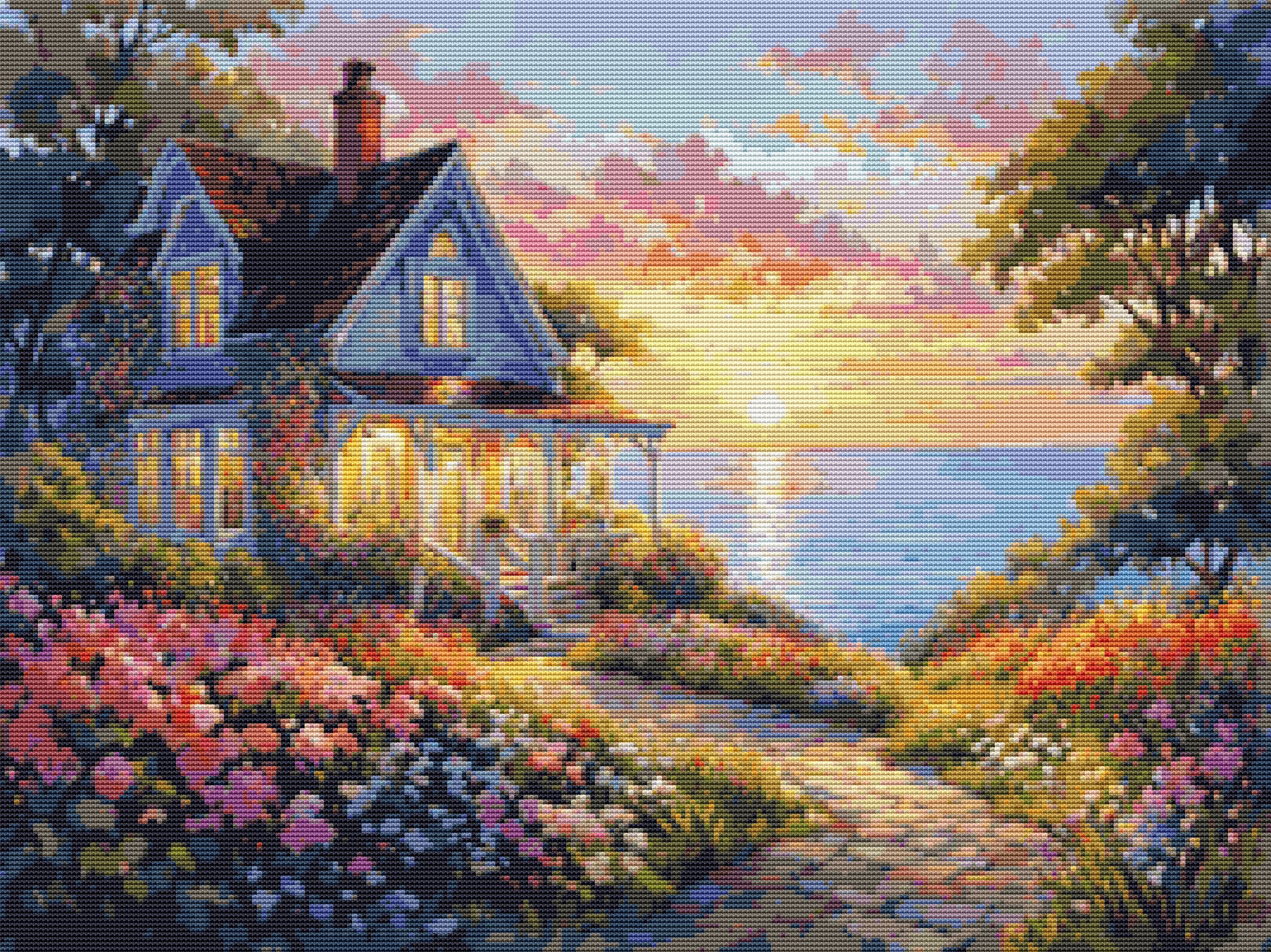 This cross stitch pattern depicts a picture of a beautiful house and garden on a hill overlooking the sea.