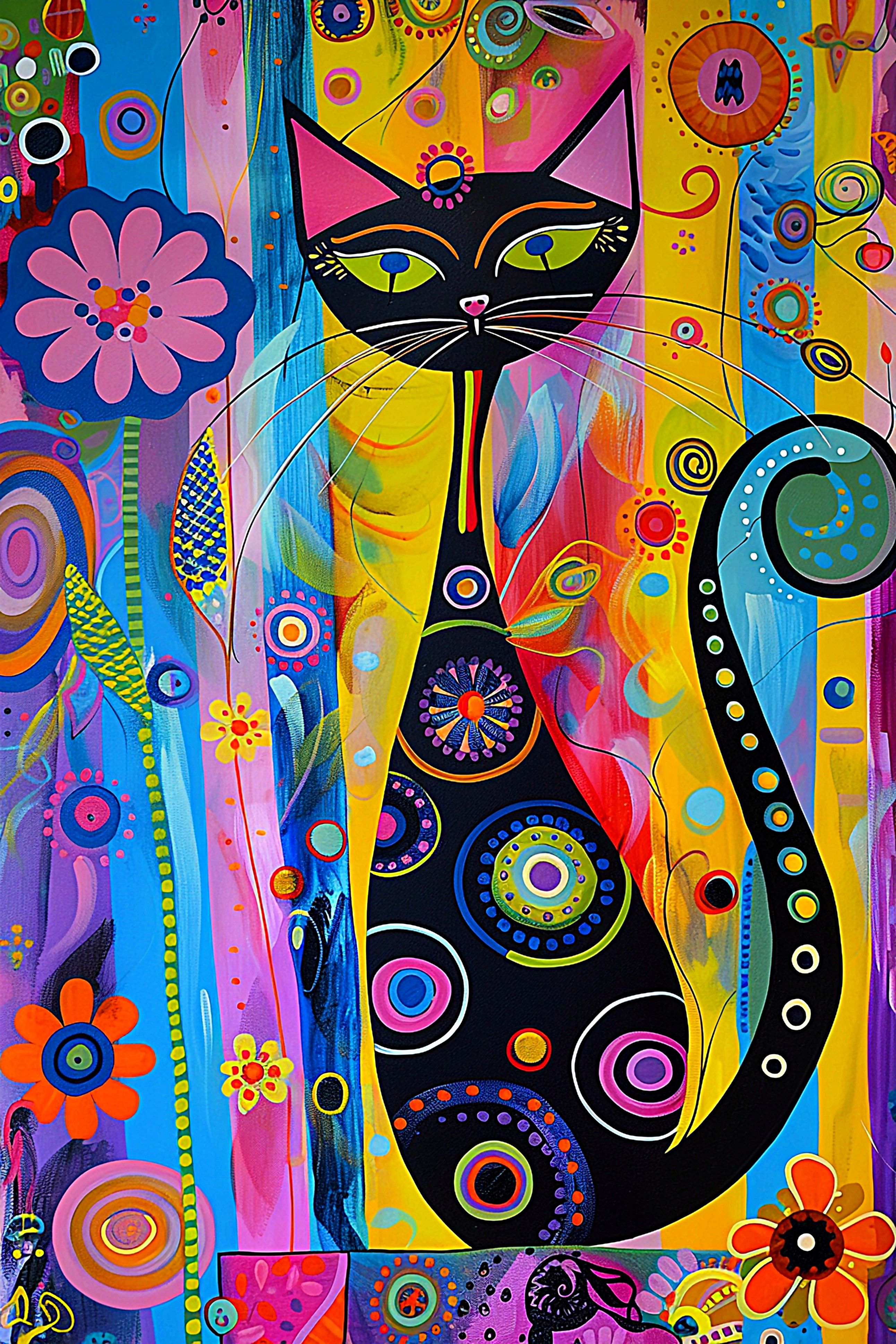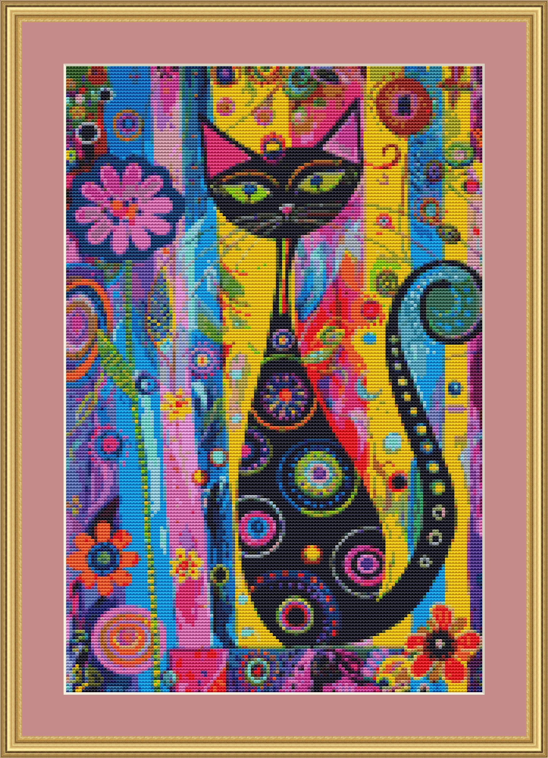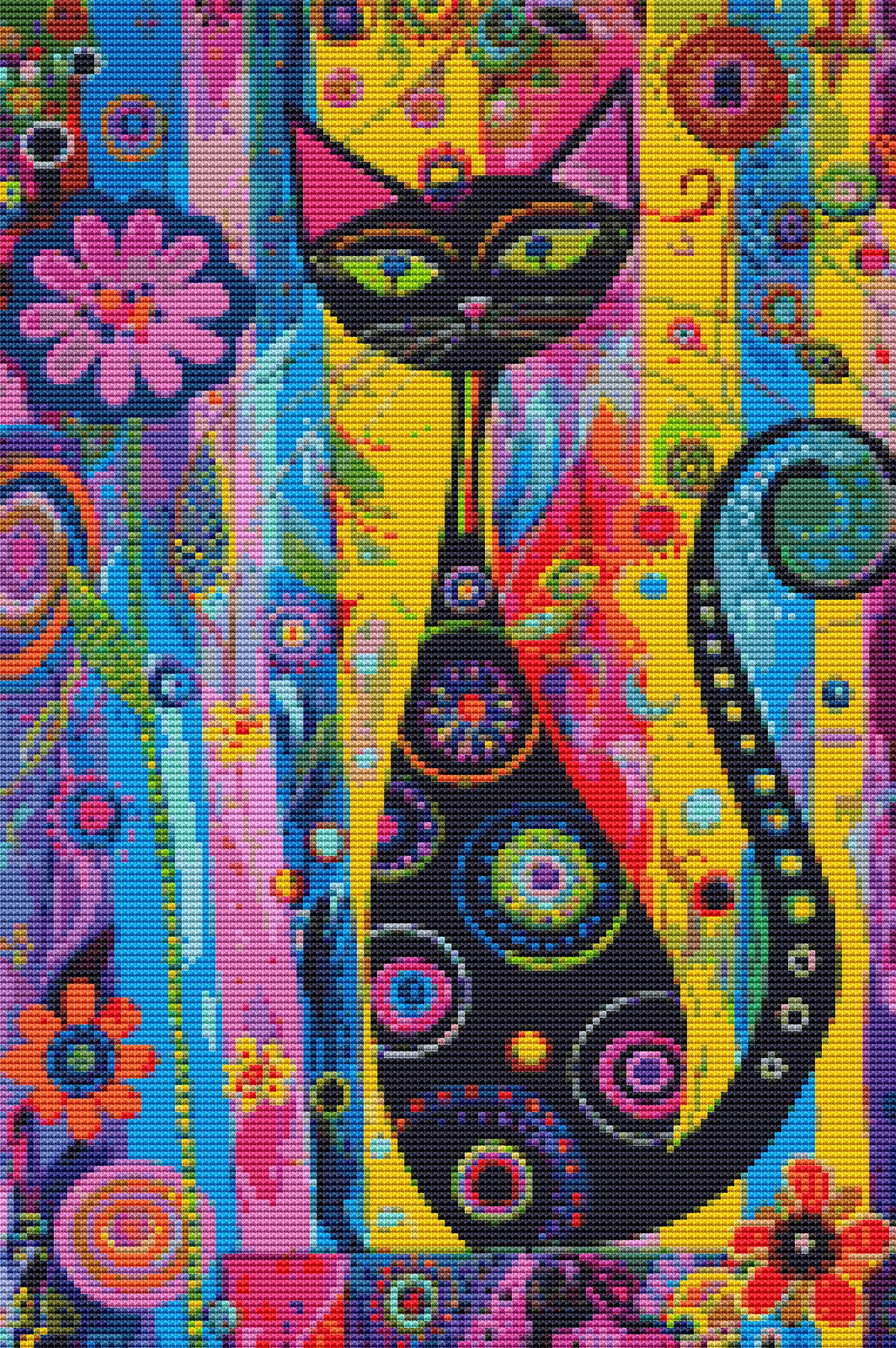This cross stitch pattern depicts a picture of a colourful black cat with flowers.