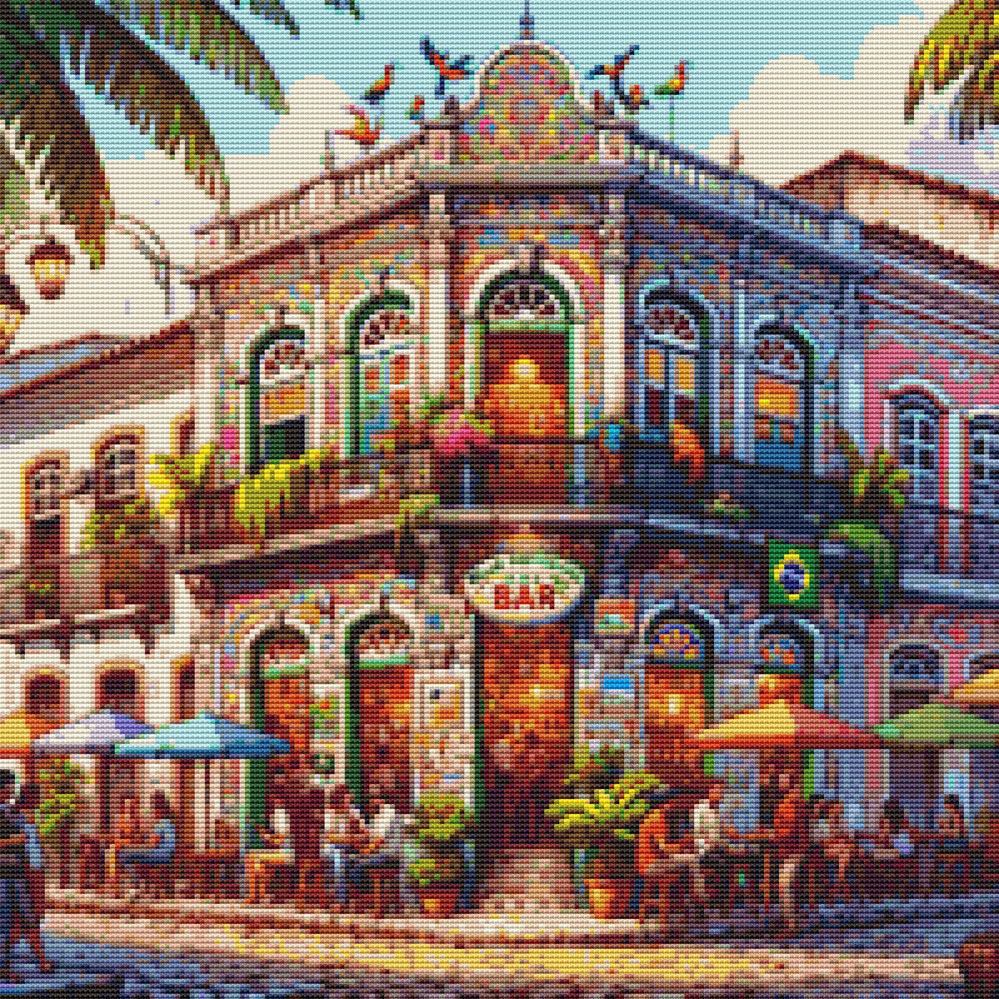 This cross stitch pattern depicts a picture of a colourful bar on a street corner.