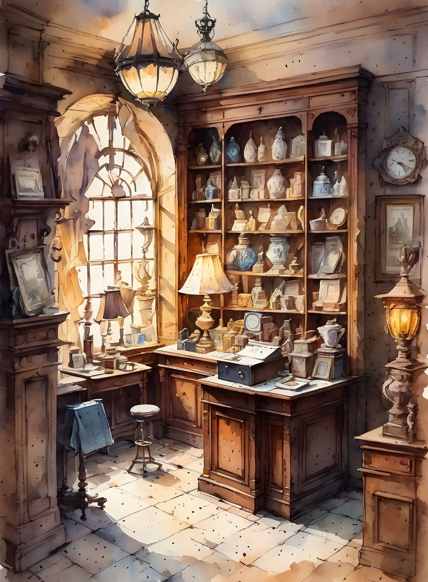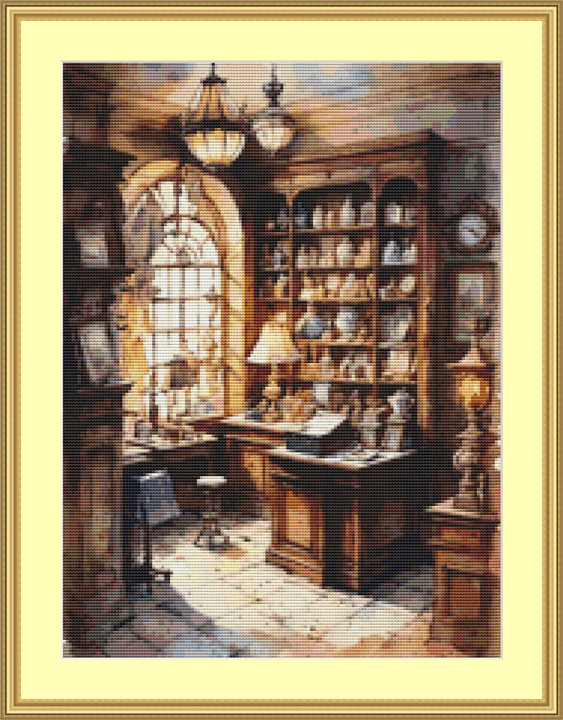 This cross stitch pattern depicts a picture of the inside of an old antique shop.