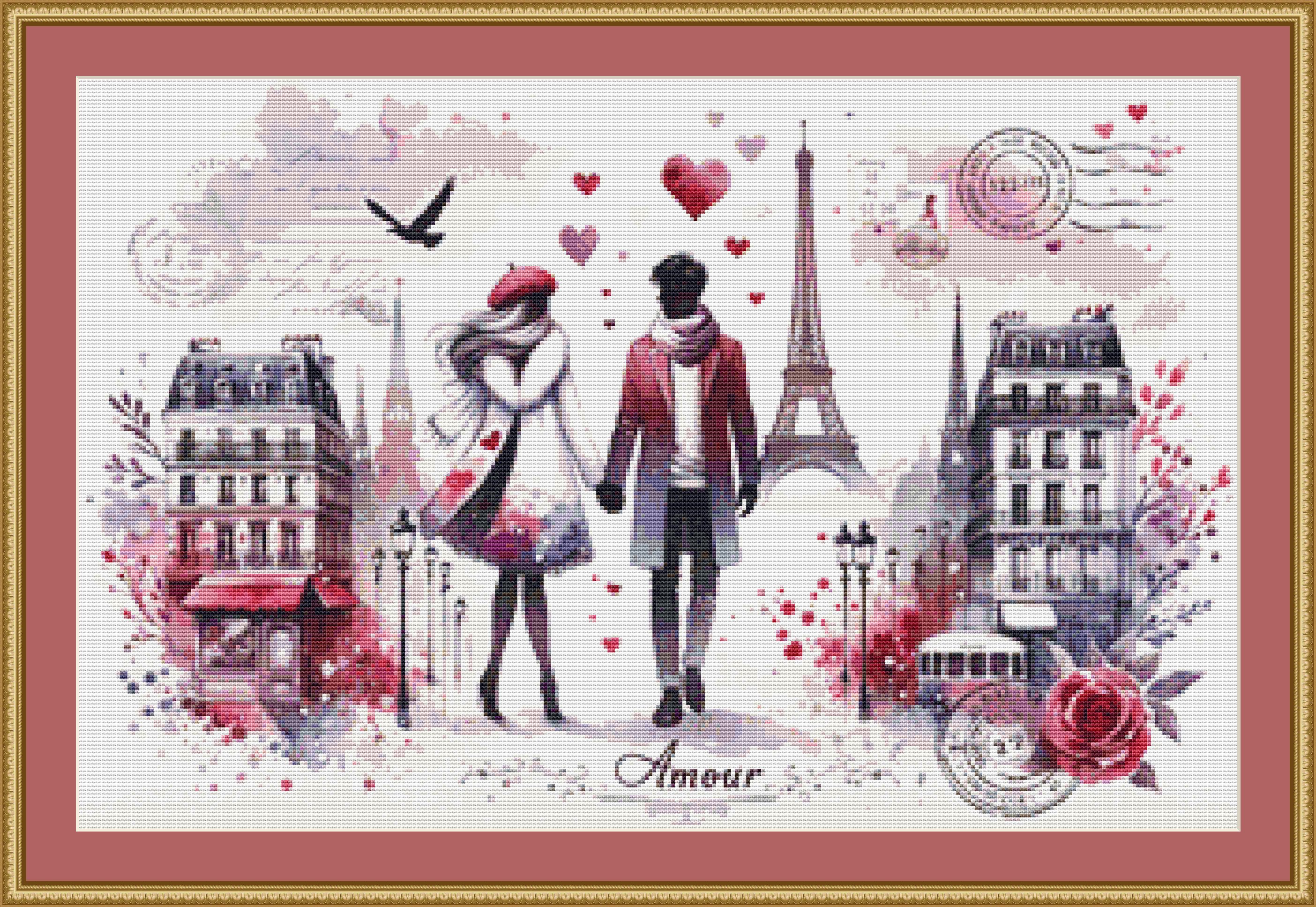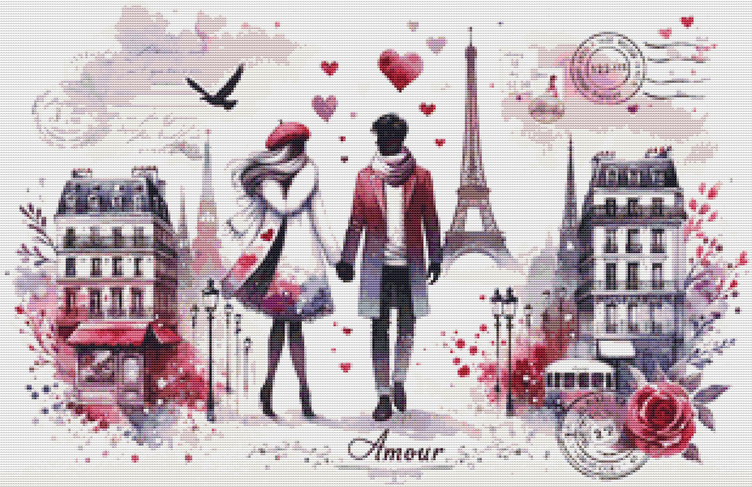 This cross stitch pattern depicts a picture of a loving couple holding hands while walking through Paris.