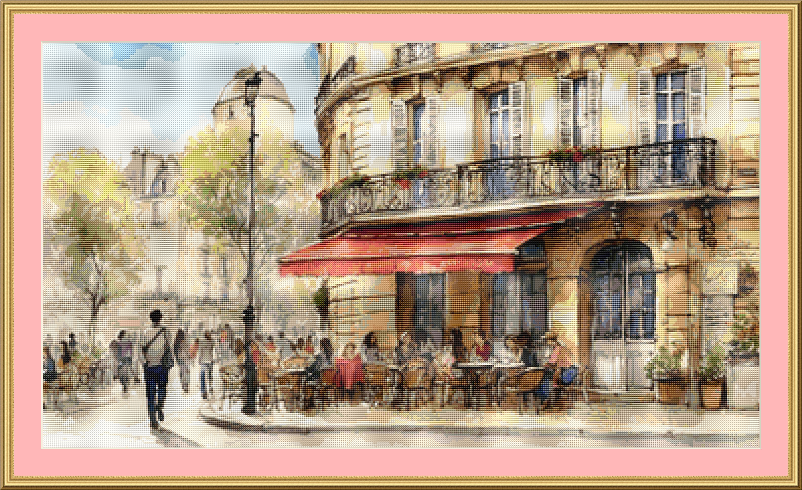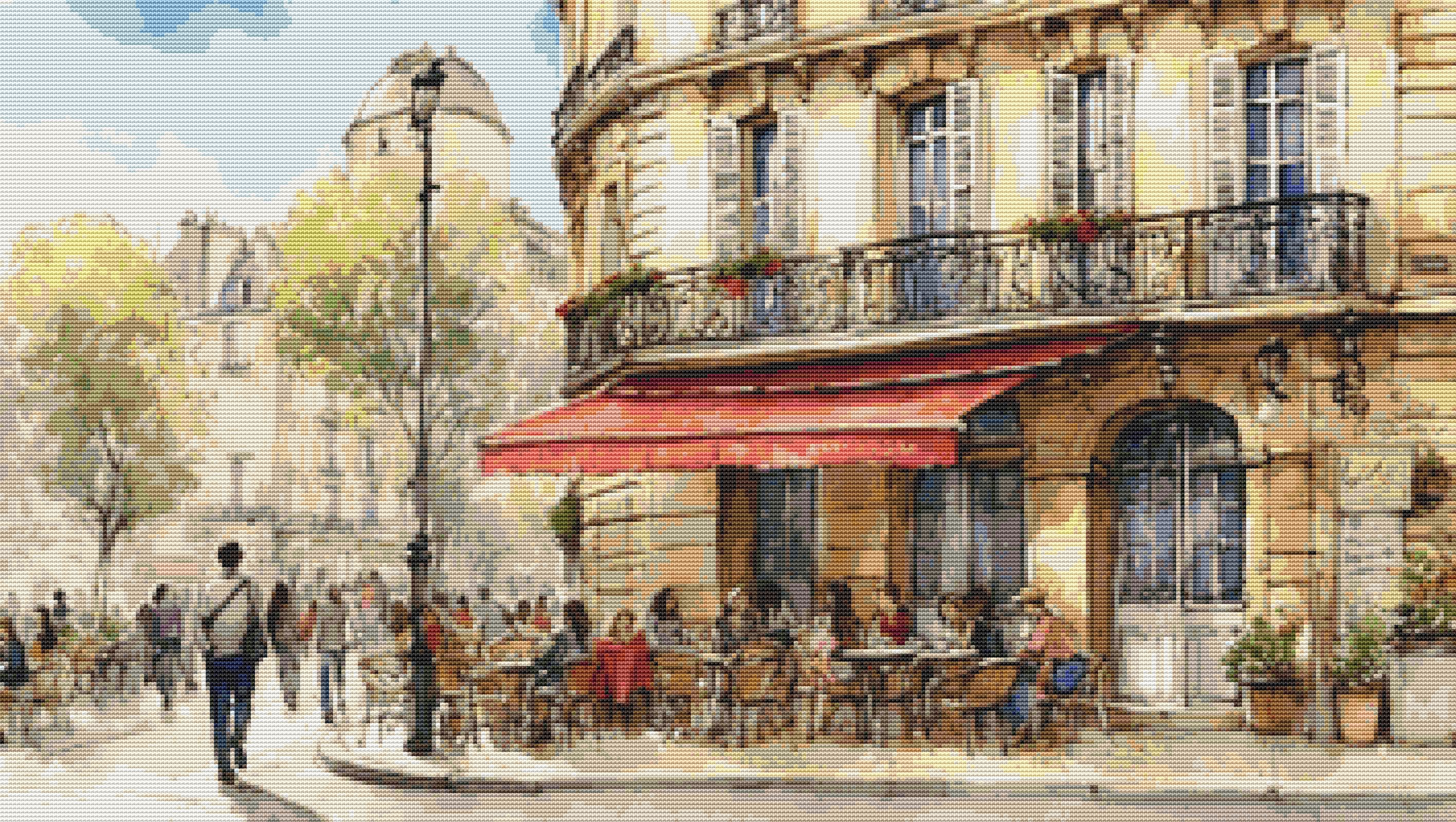 This cross stitch pattern depicts a picture of a cafe in Paris.