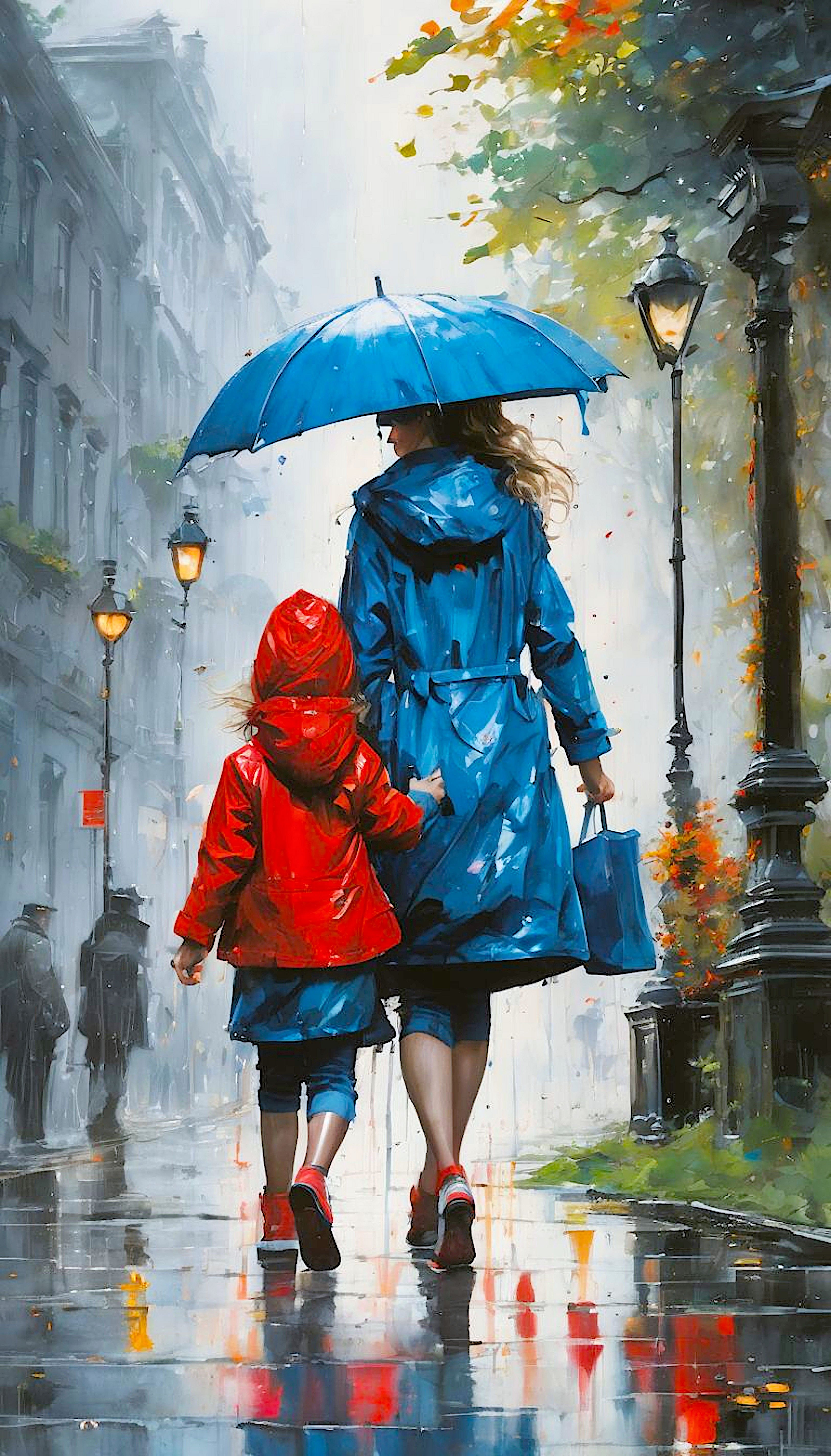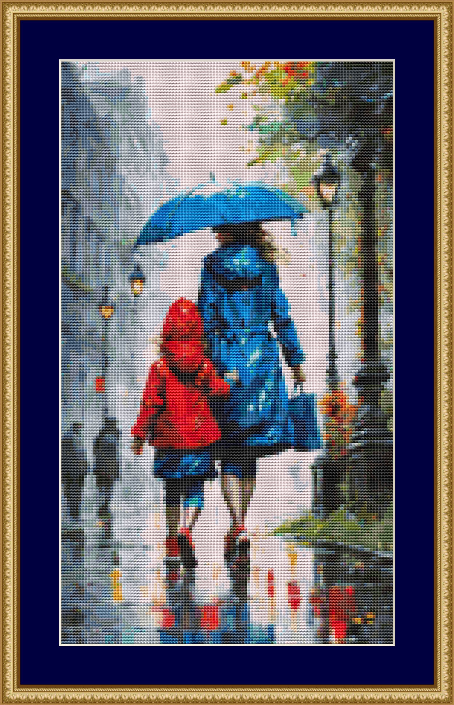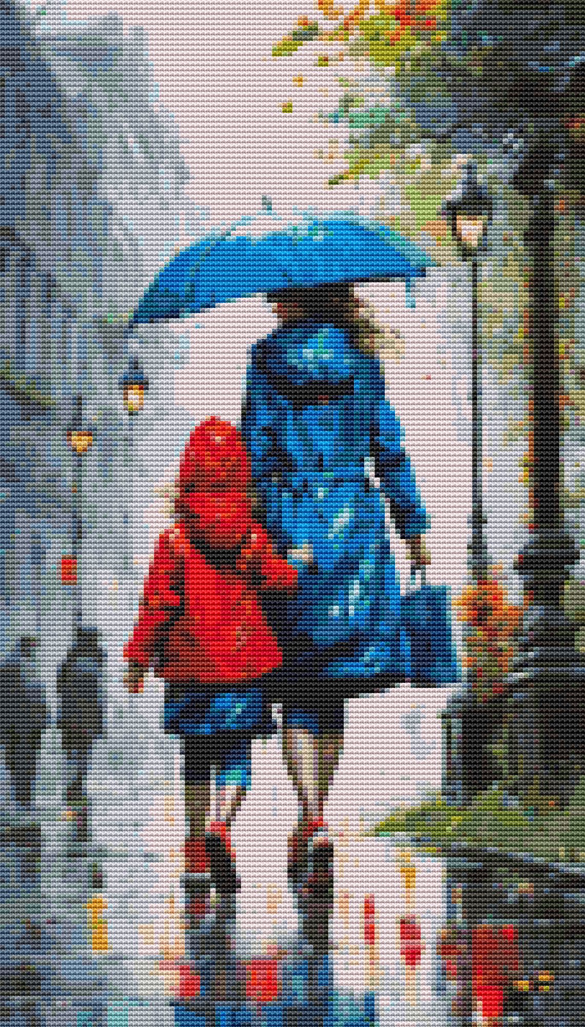 This cross stitch pattern depicts a picture of a woman and child walking in the rain under an umbrella.