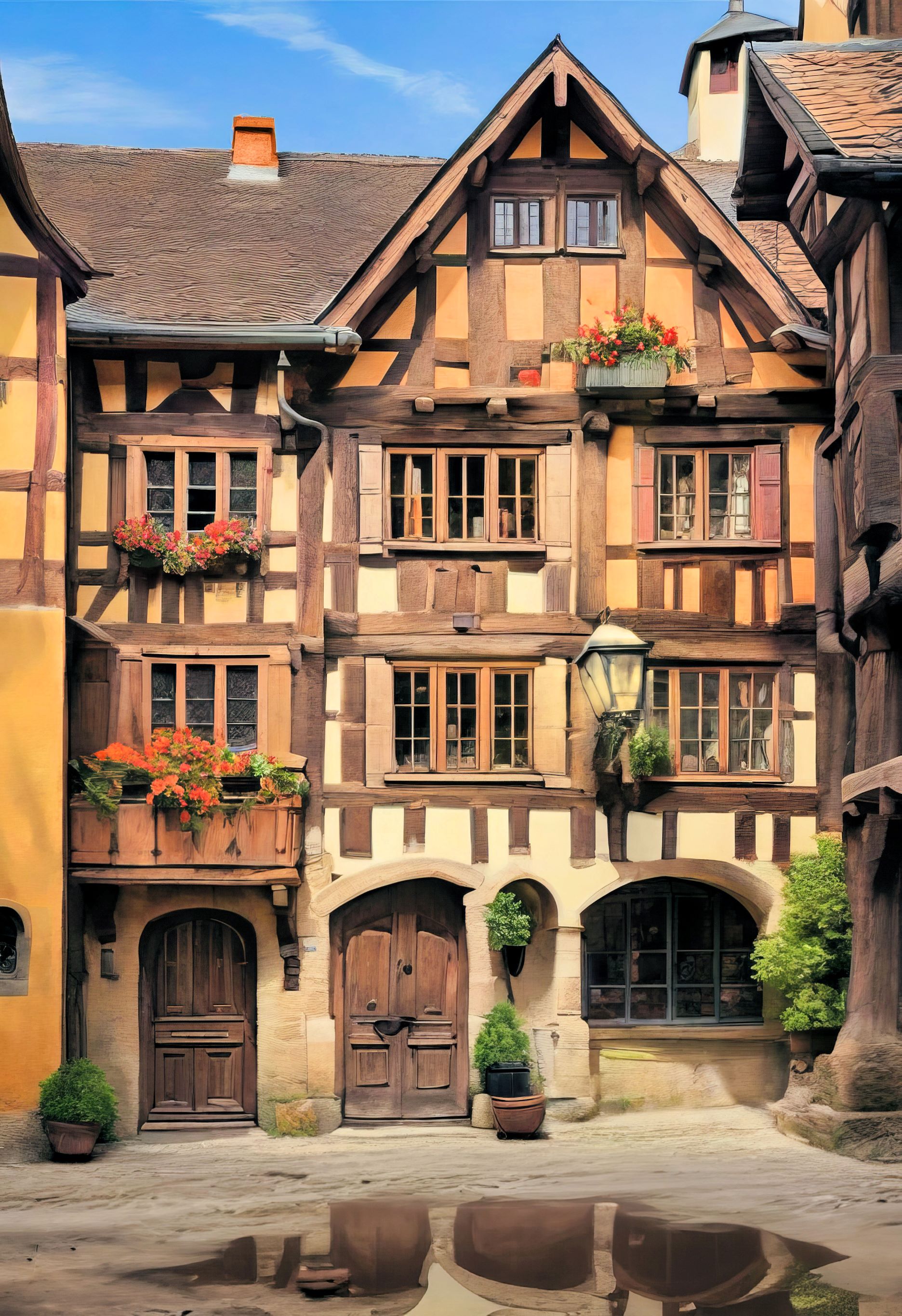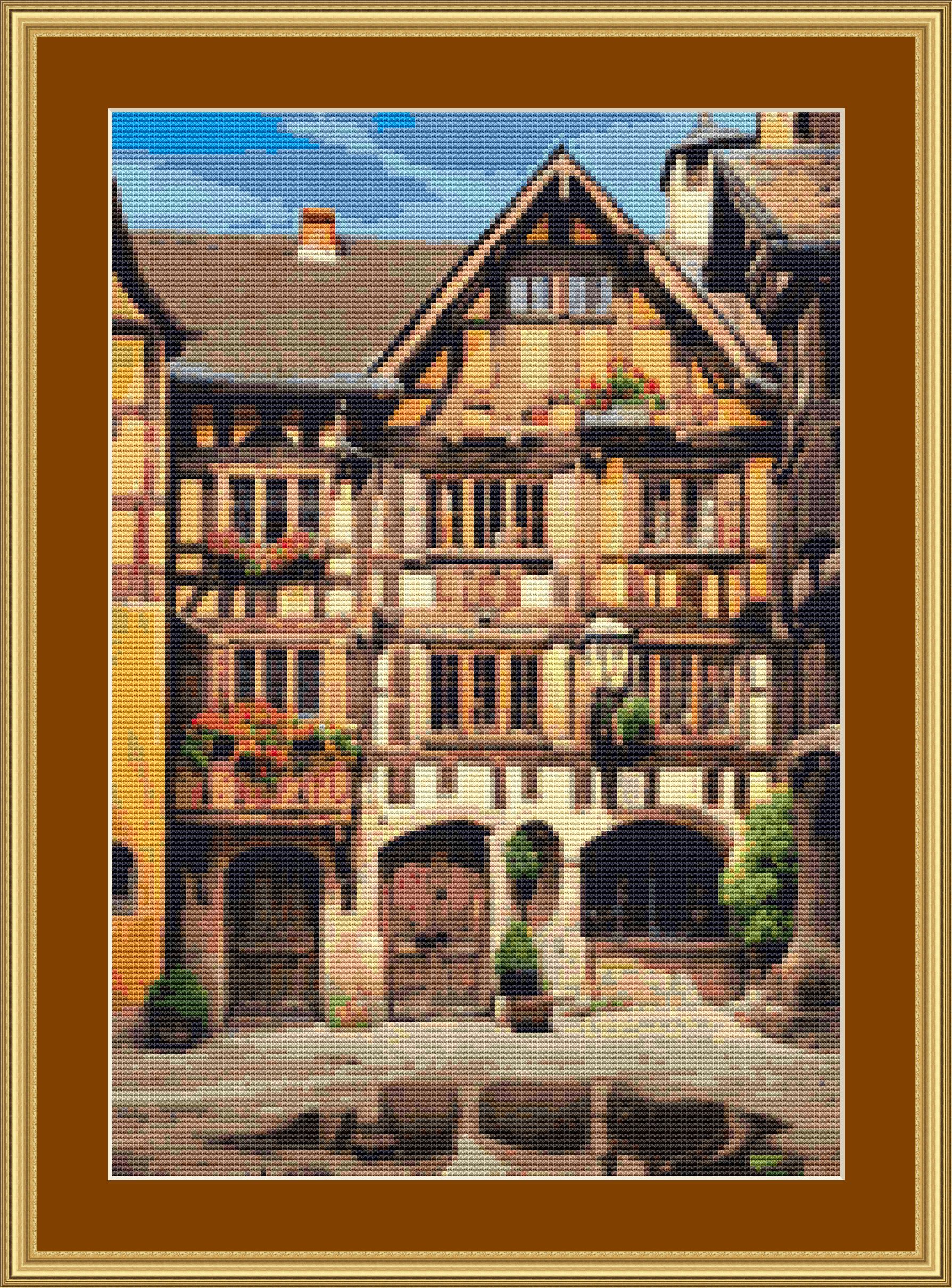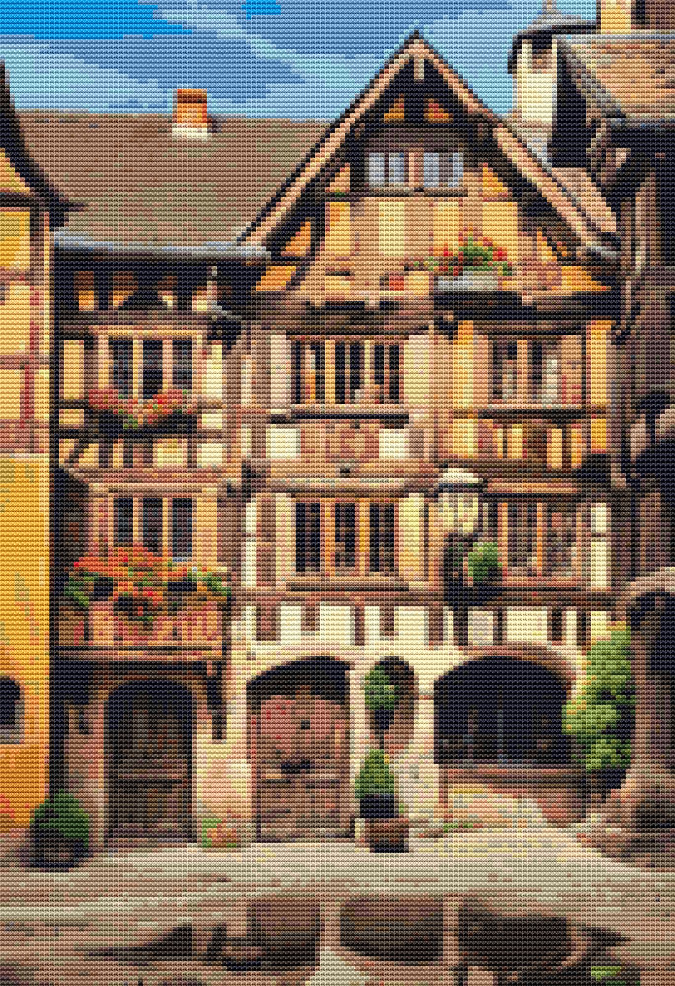 This cross stitch pattern depicts a picture of a lovely old fashioned house made with timber.