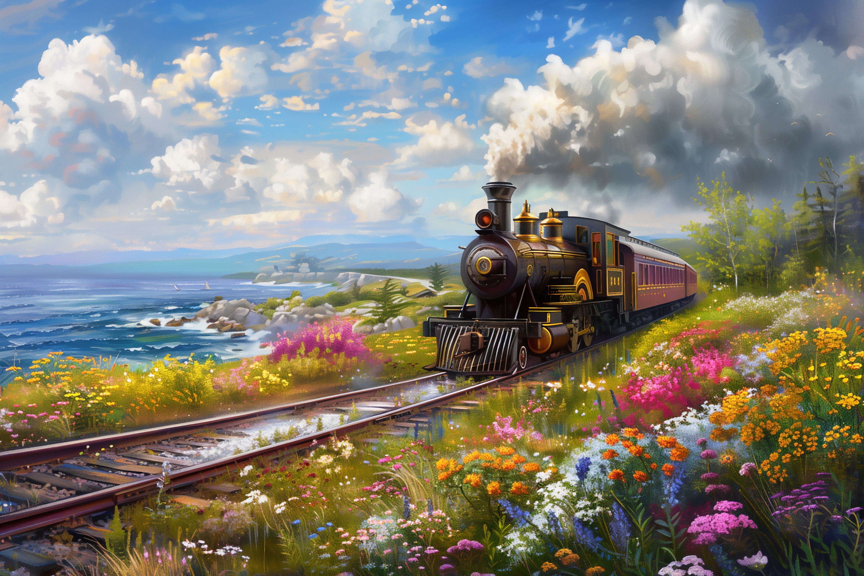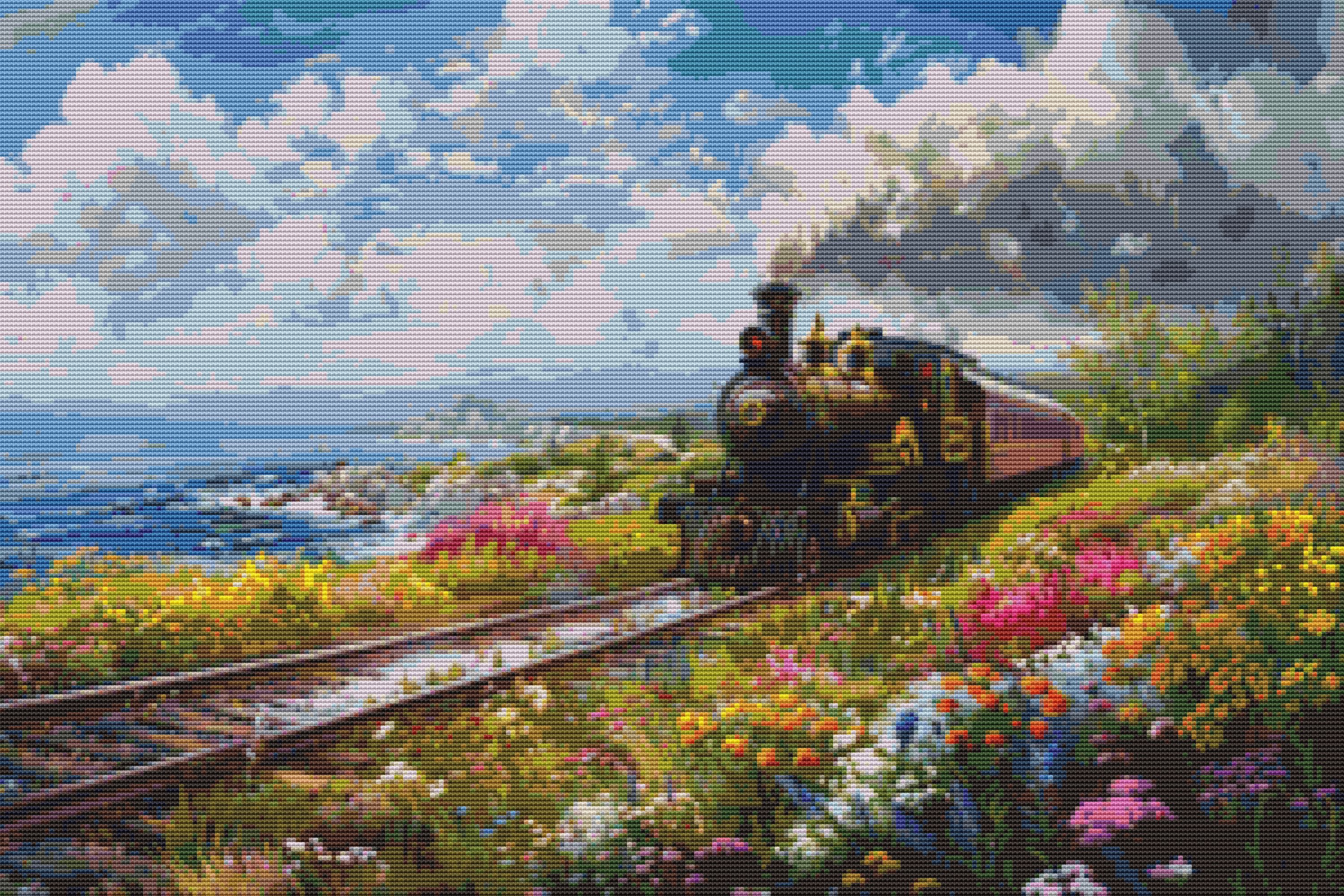 This cross stitch pattern depicts a picture of a steam train travelling along a coastal track.