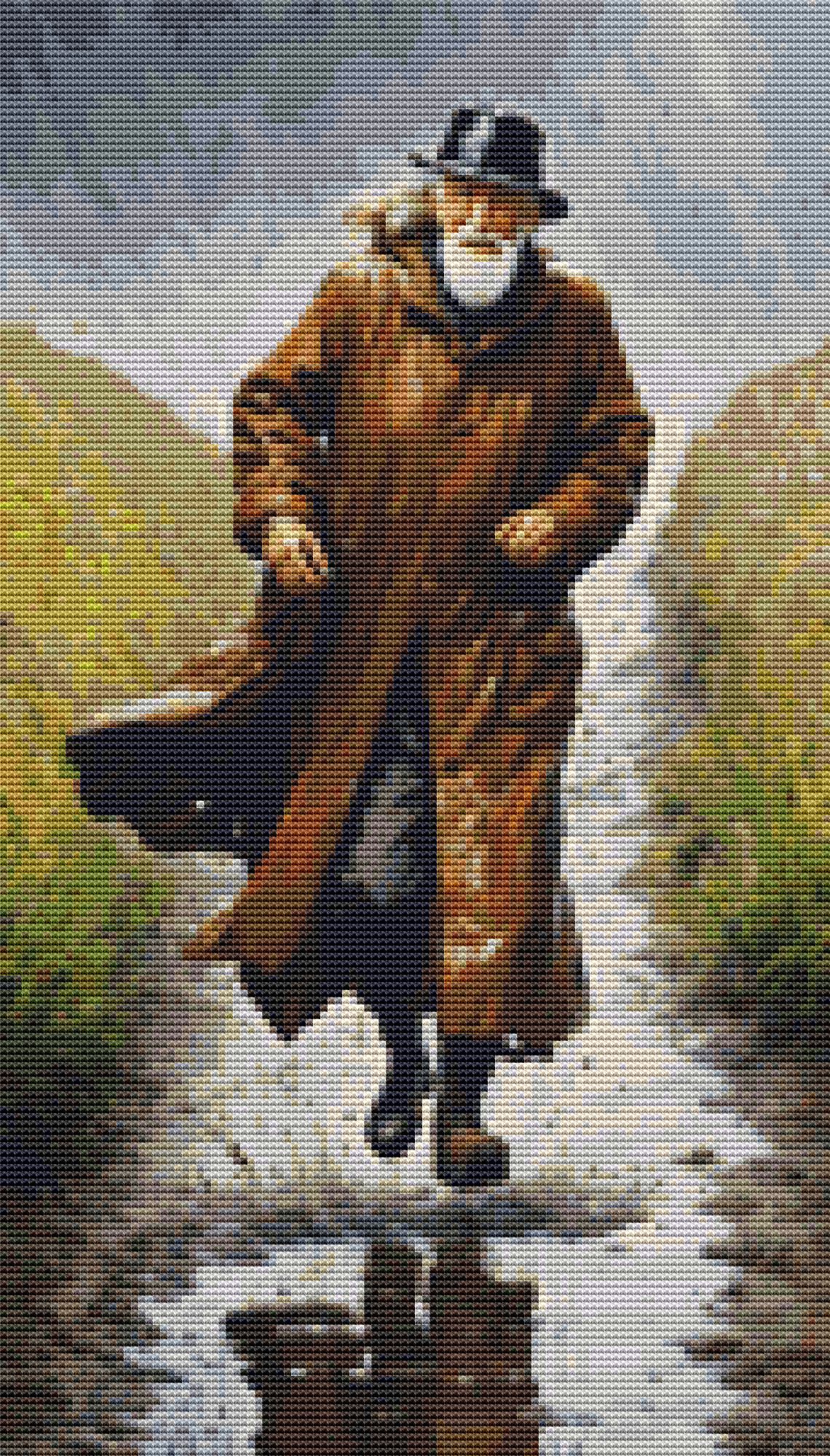 This cross stitch pattern depicts a picture of an old man running down a path in the rain.