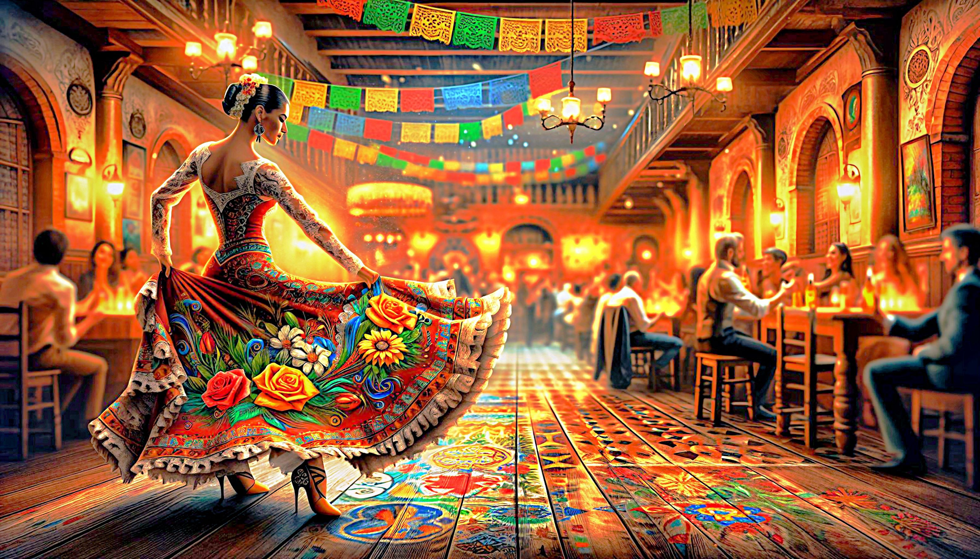 This cross stitch pattern depicts a picture of a dancer in Mexico dressed in a beautiful dress dancing in a cafe.