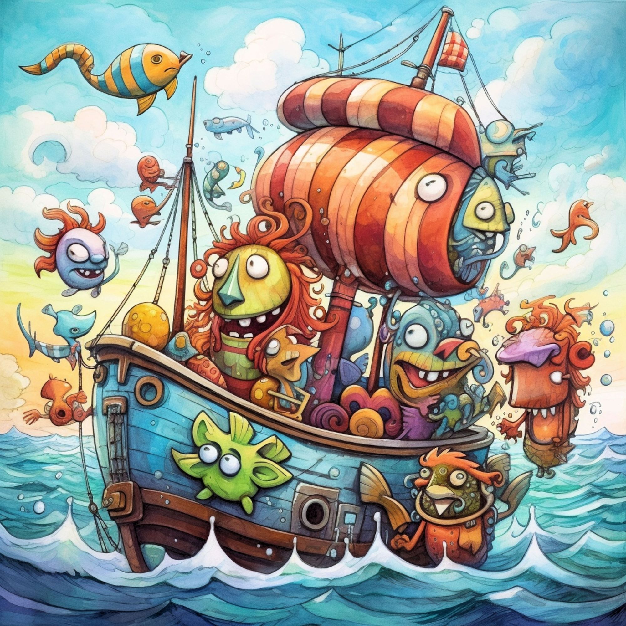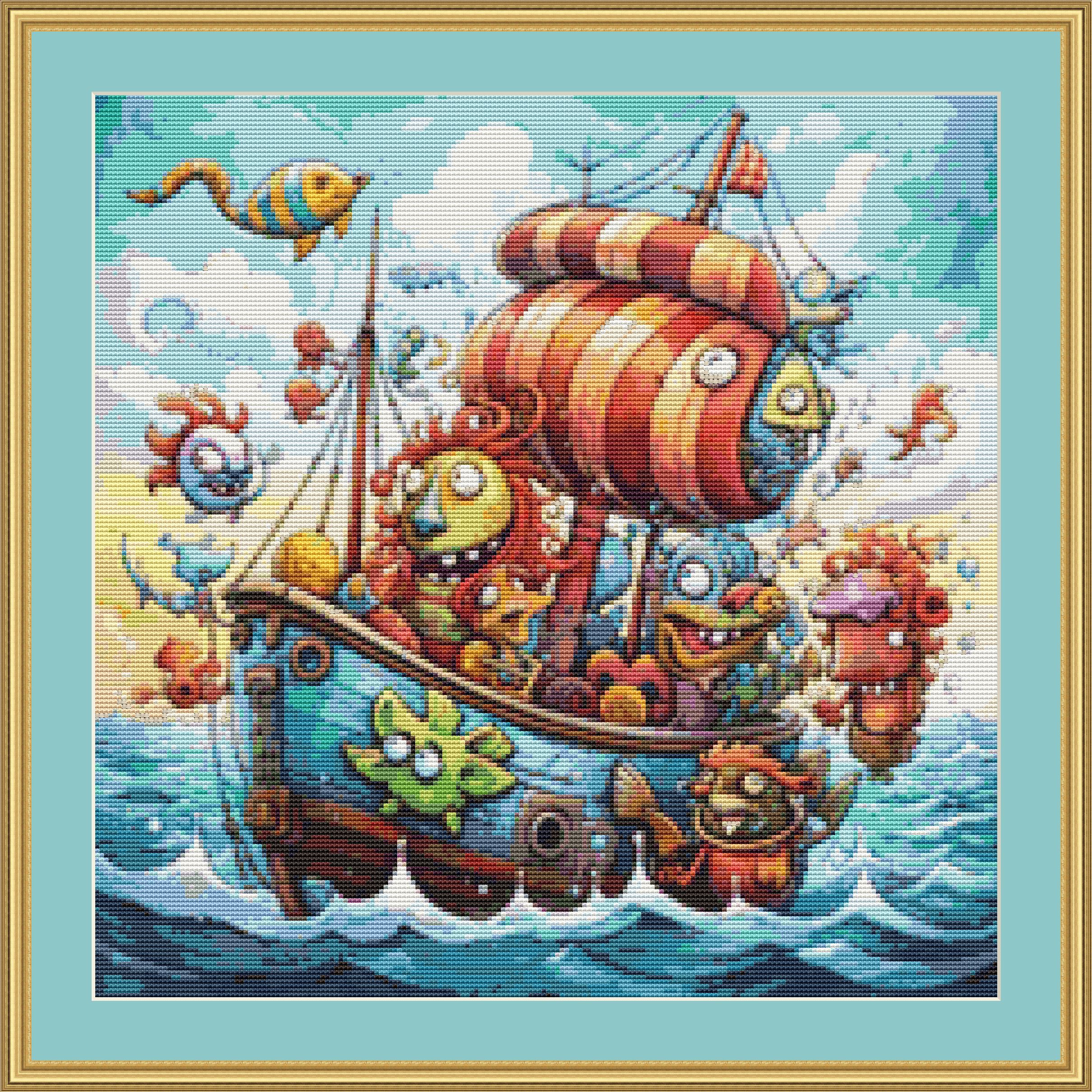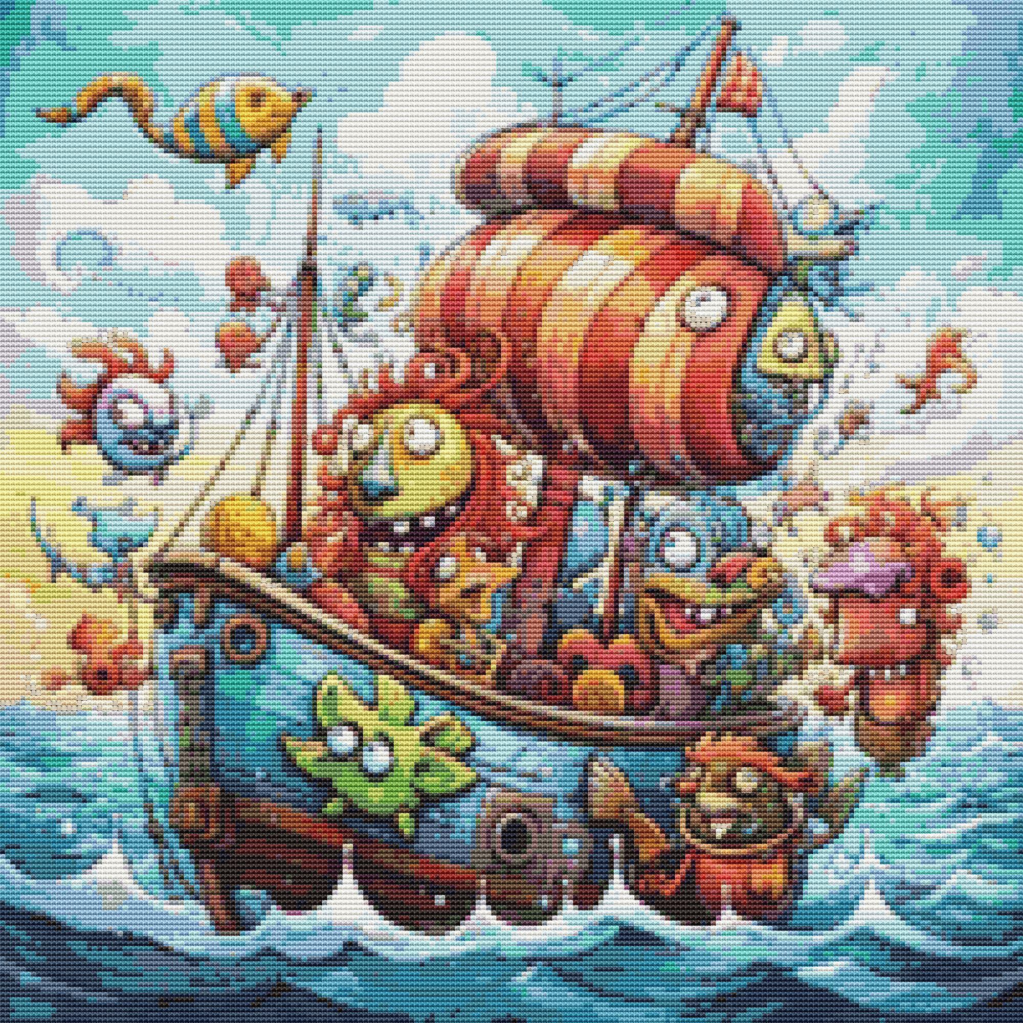 This cross stitch pattern depicts a picture of a boat full of happy sea creatures.