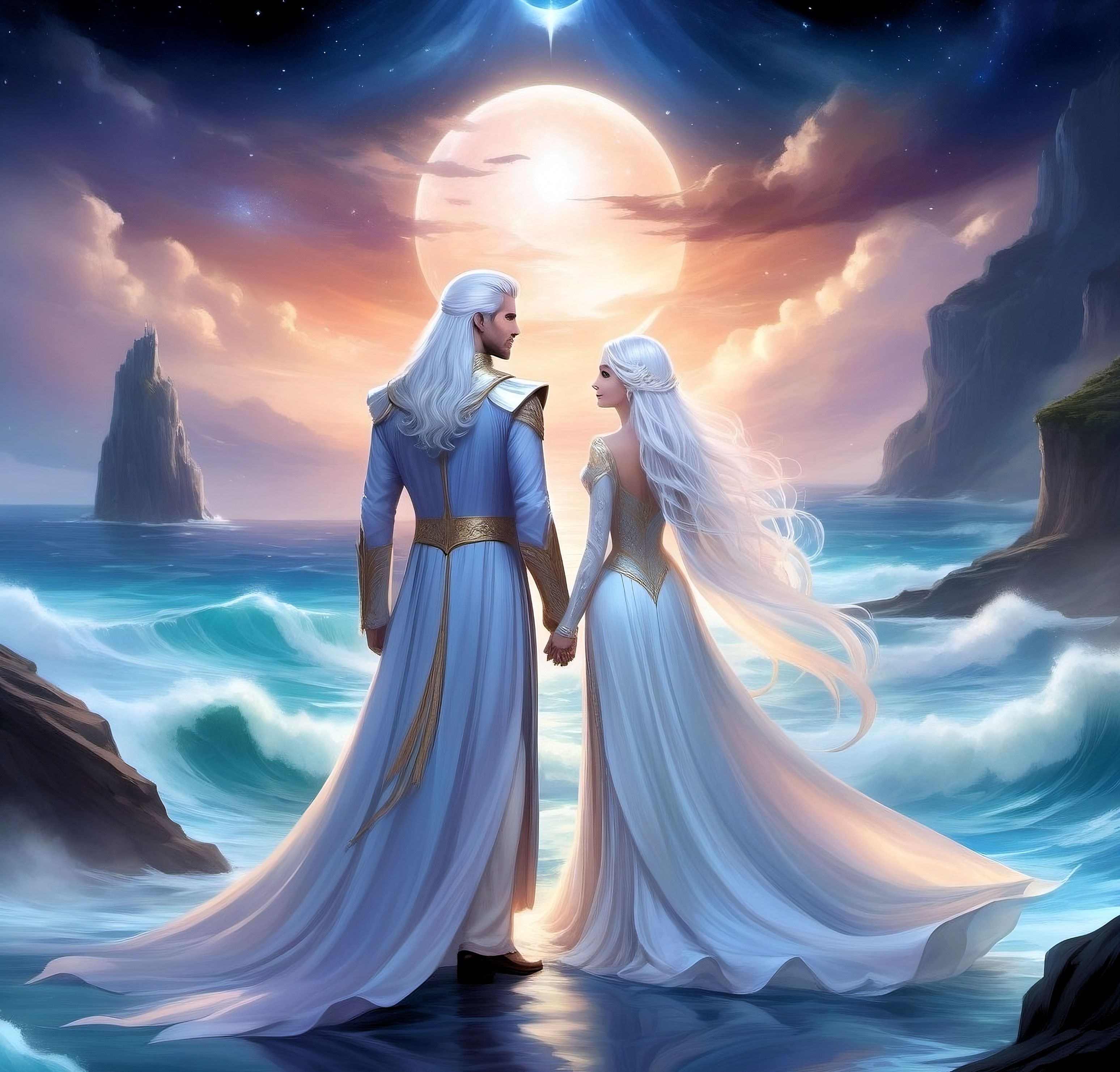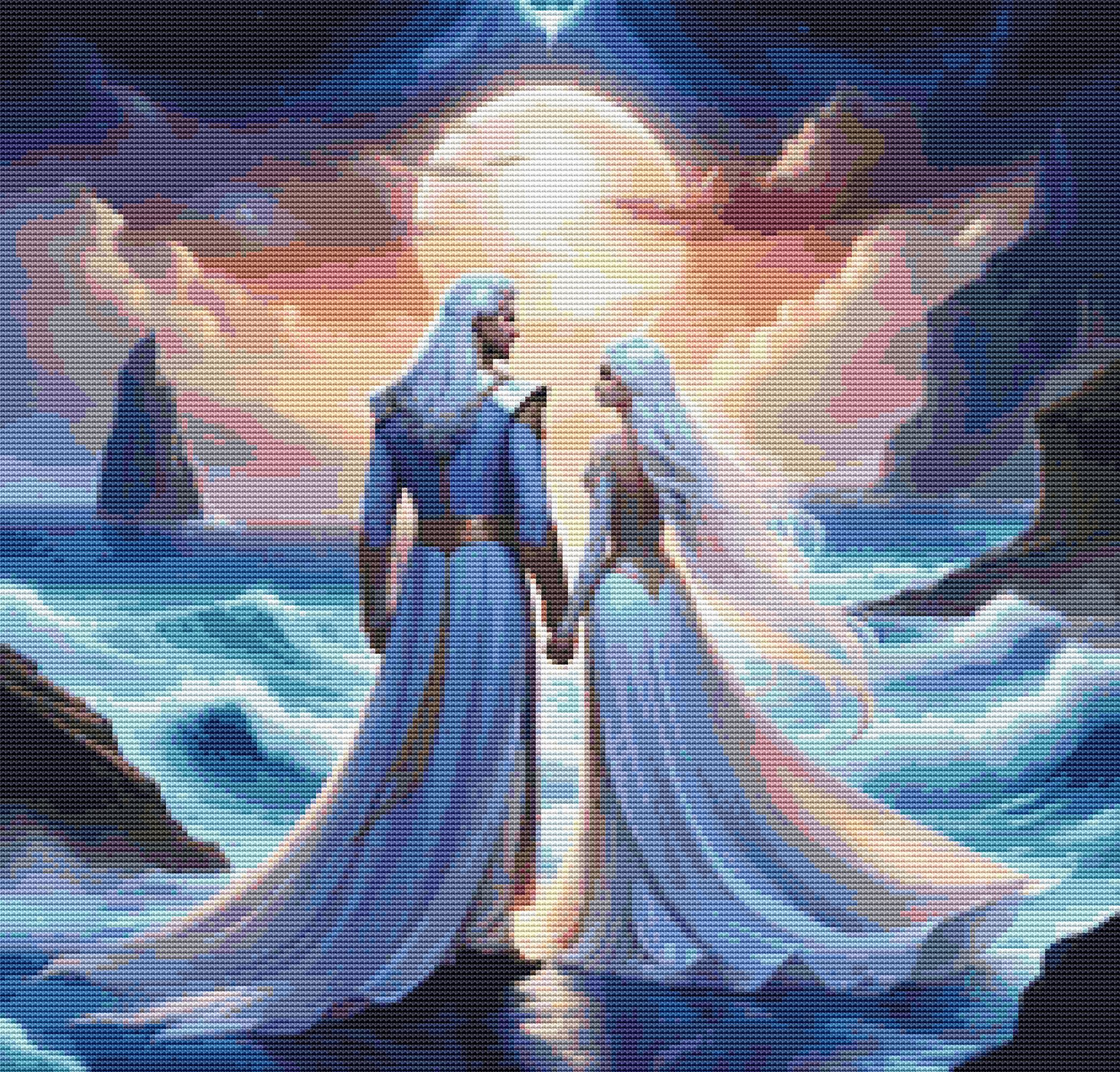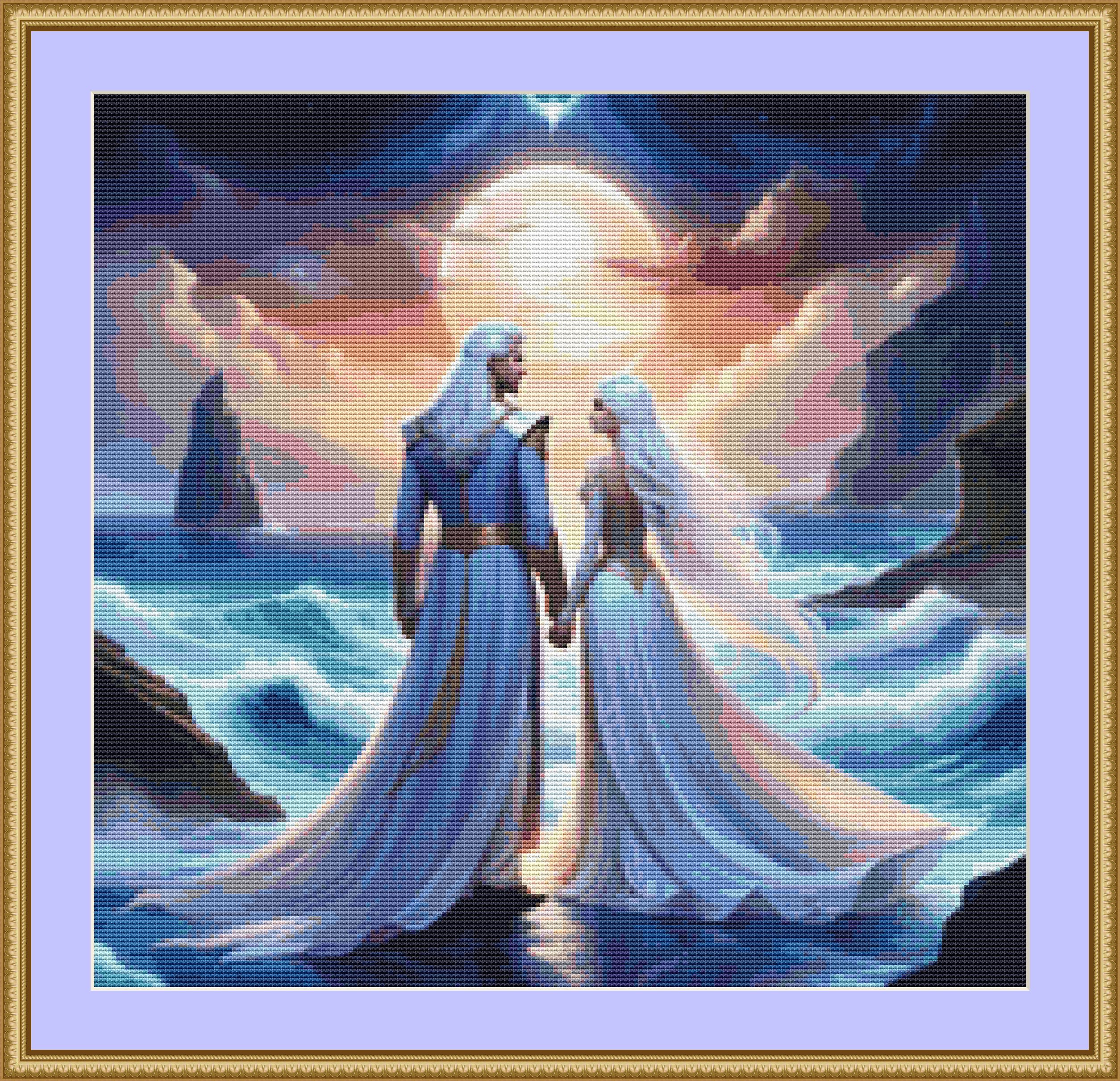 This cross stitch pattern depicts a picture of a beautiful couple of elves together .