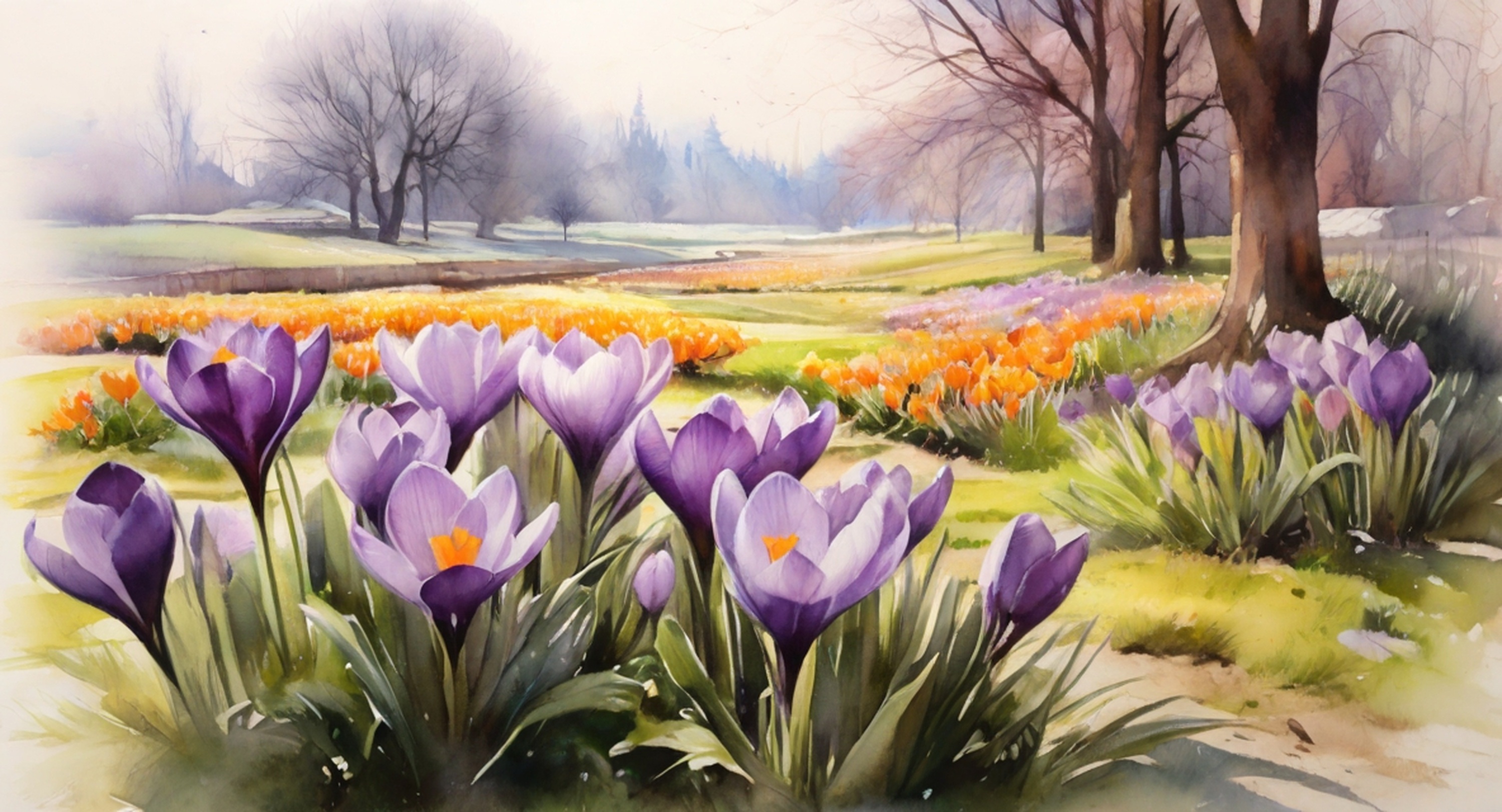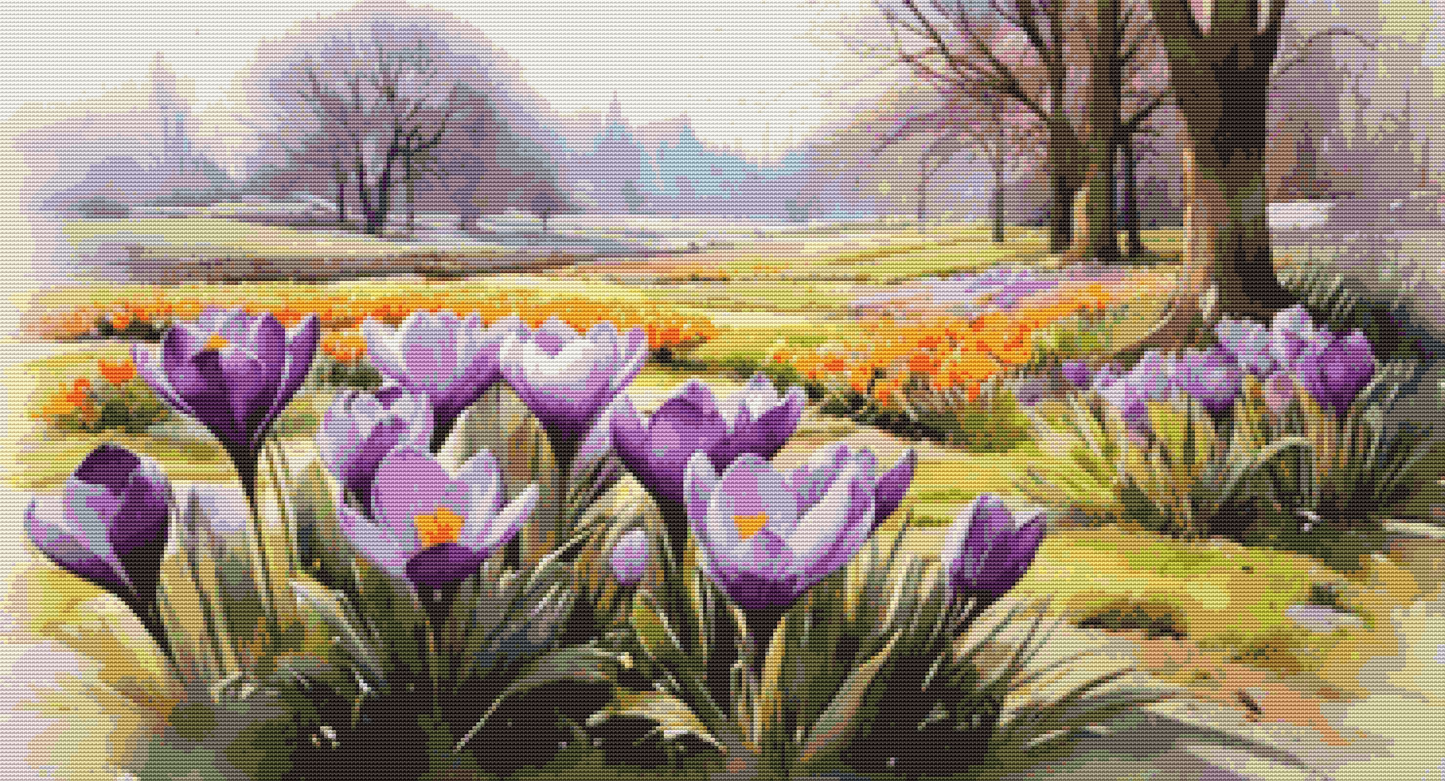 This cross stitch pattern depicts a picture of a park meadow full of beautiful crocus flowers .
