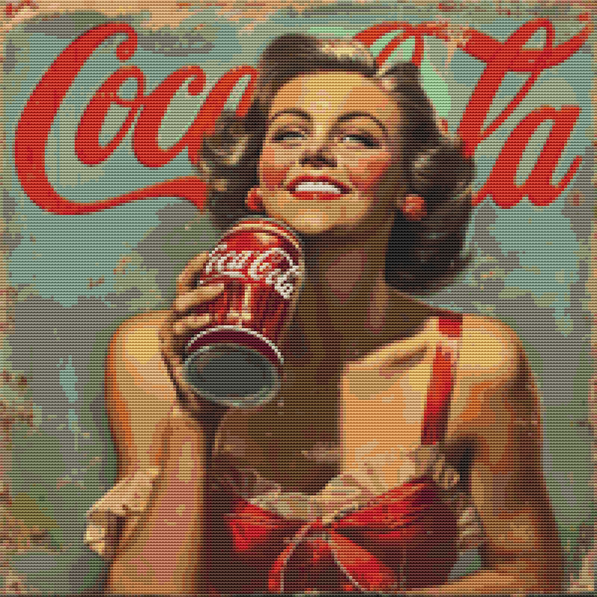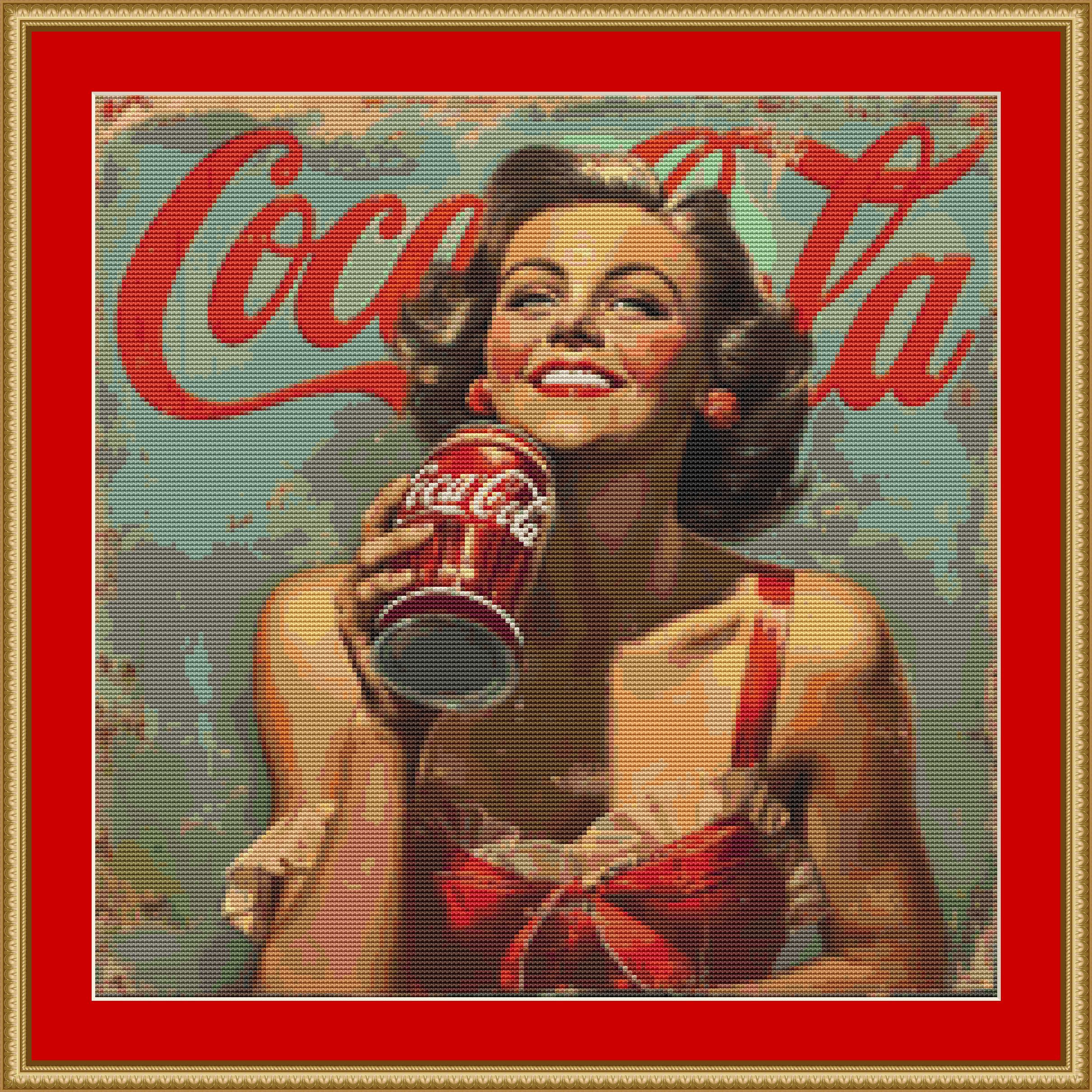 This cross stitch pattern depicts a picture of a vintage poster of a woman with a cola drink.