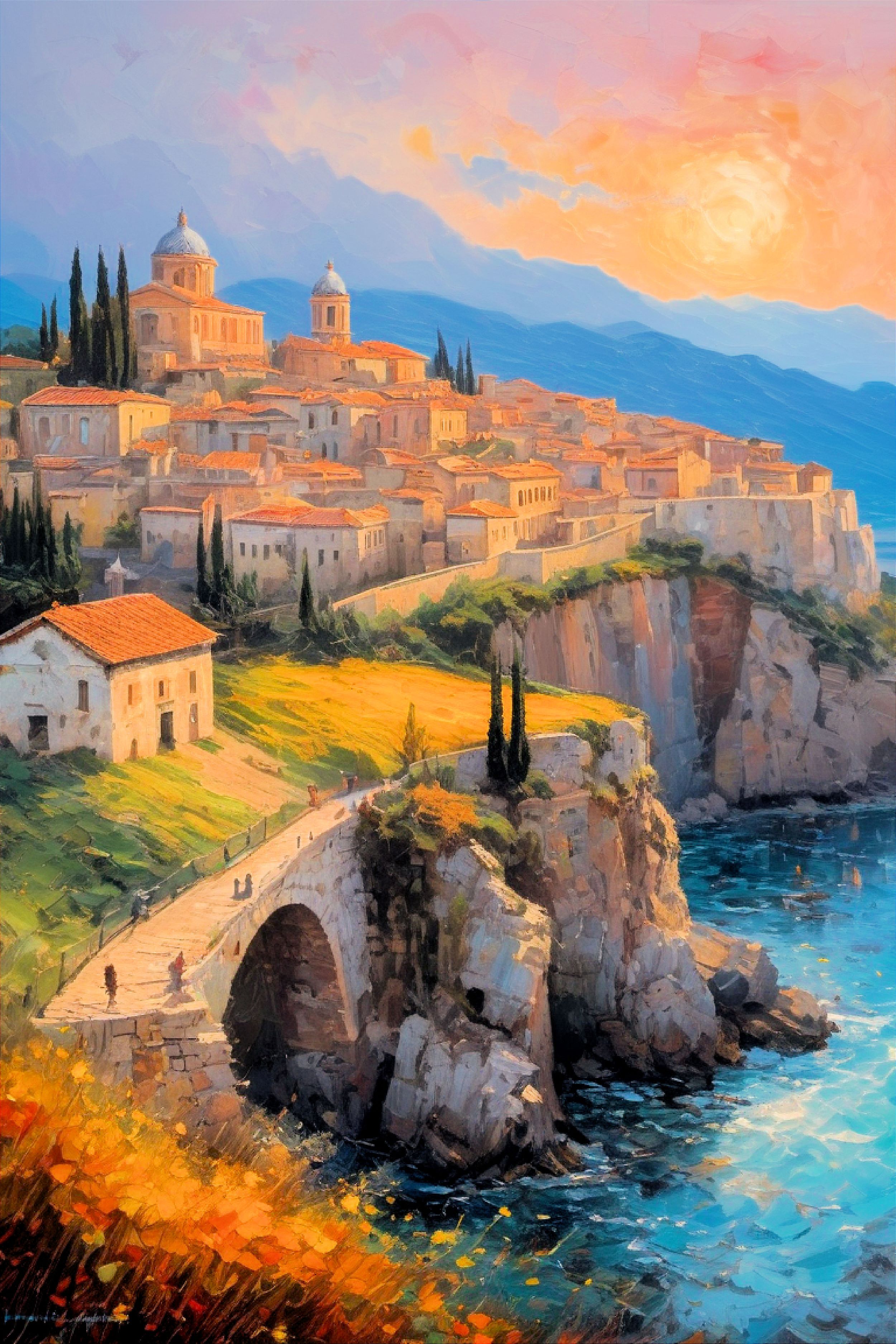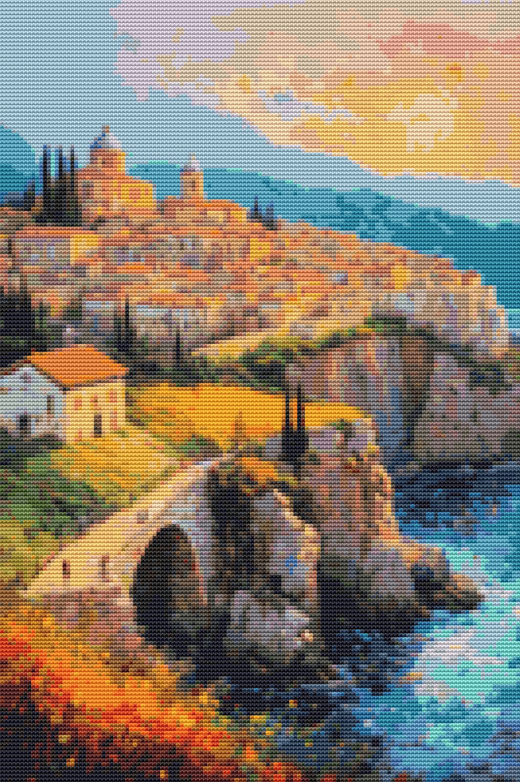 This cross stitch pattern depicts a picture of a beautiful village set on a cliff top.
