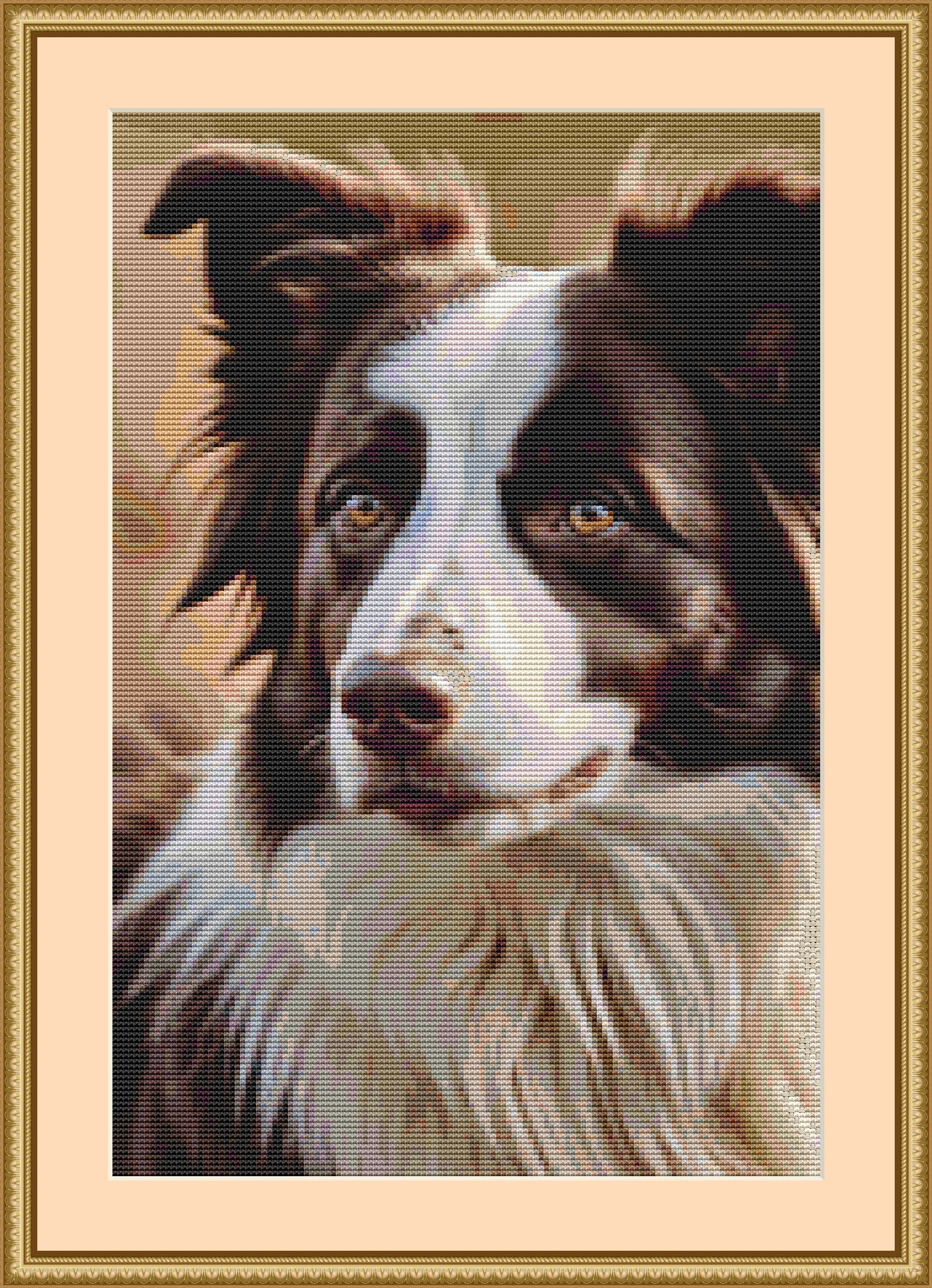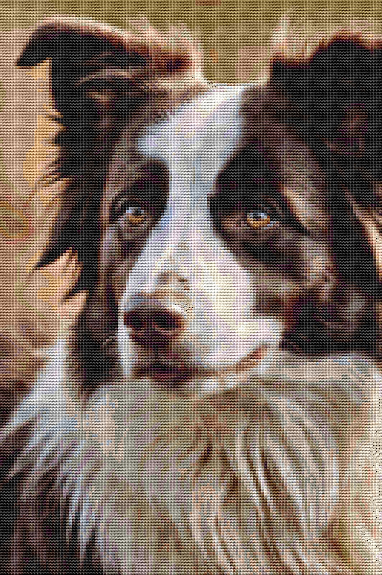 This cross stitch pattern depicts a picture of the face of a beautiful Border Collie dog.